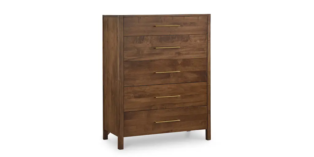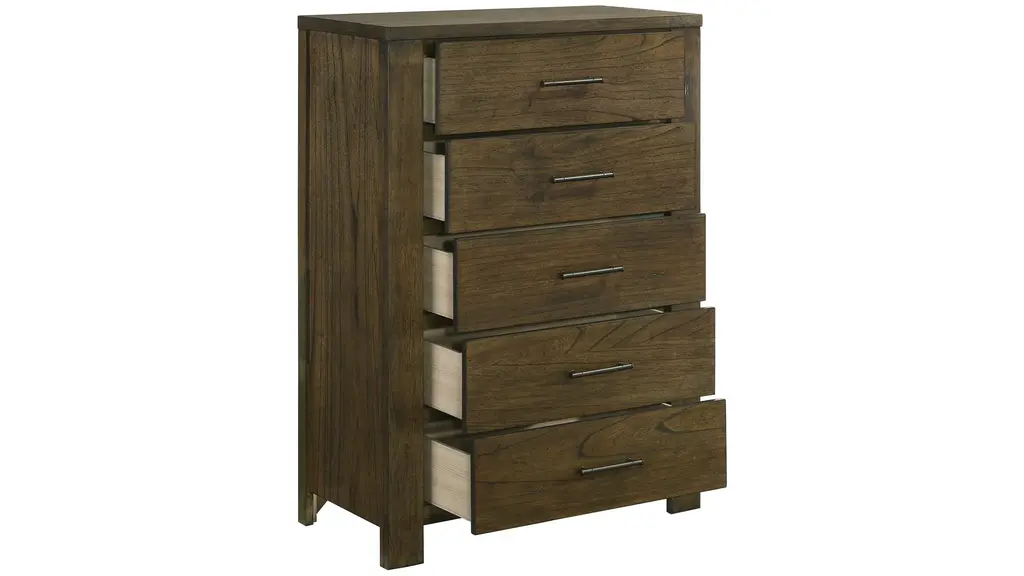The Arya Chest provides ample drawers and shelves to achieve your desired bedroom design. The wire-brushed oak finish over Mindy veneer lends subtle rustic aesthetic to the chest while dark brown metal bar hardware provides complementing accent to the drawer fronts.