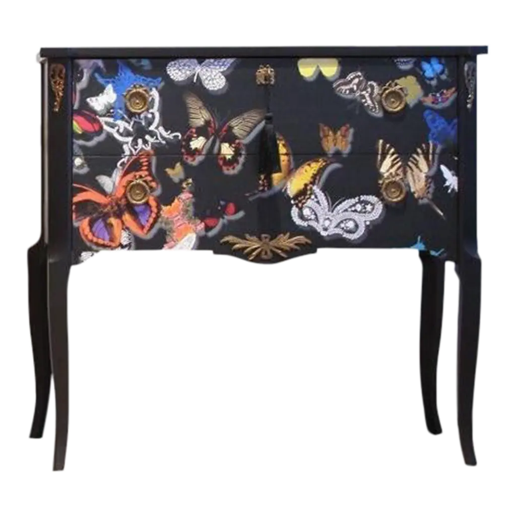 Introducing the Asolo chest in Parma blue, a hand-painted masterpiece adorned with charming butterfly motifs. Its elegant curves and soothing color create a warm and inviting ambiance. Customizable in size and design. Please, ask the Concierge service for further information.