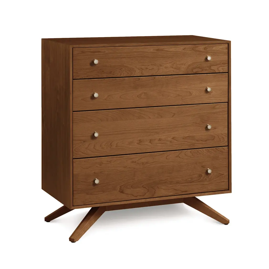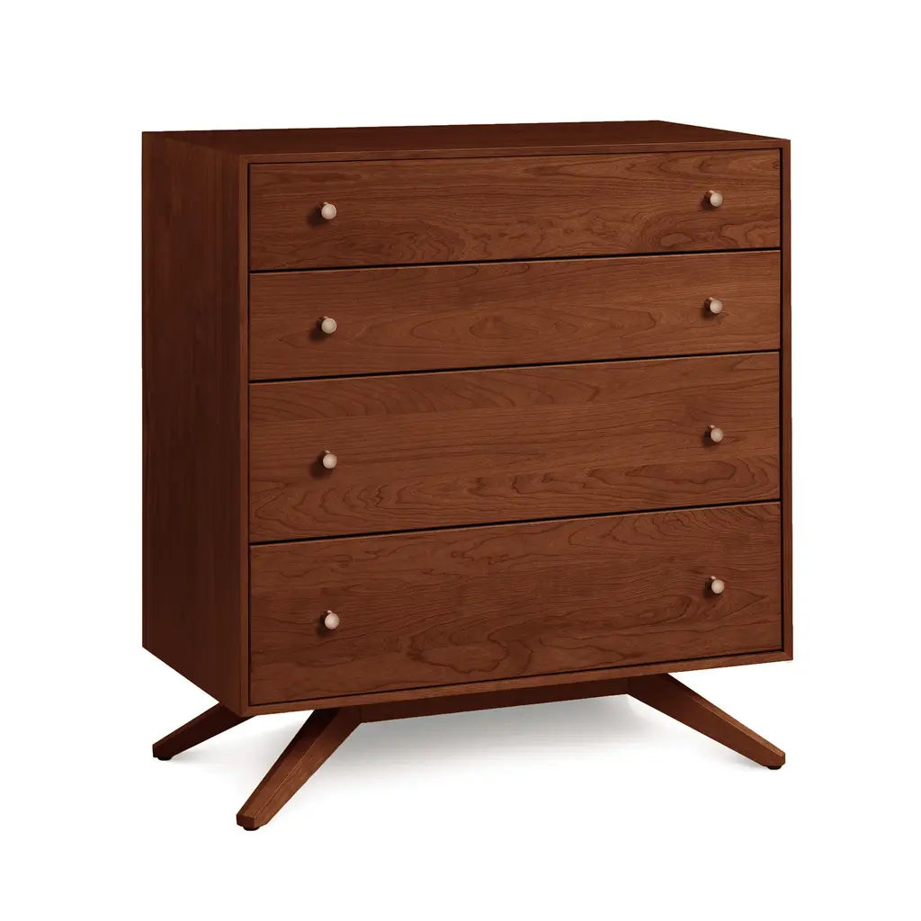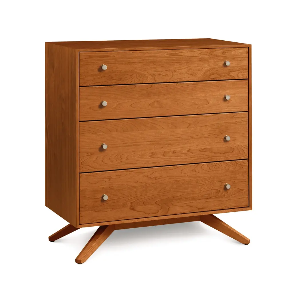 Copeland's dramatic, contemporary Astrid 4-Drawer Chest of Drawers is handcrafted in Vermont of natural solid North American hardwood. Customize online in your choice of wood type and stain.Modern American design features deeply splayed legs producing dramatic, futuristic cantilevers. The Astrid Bedroom Furniture Collection, named after a beautiful Scandinavian goddess, is an engineering feat that defies expectations and inspires a sense of possibility. Handmade in Vermont using eco-friendly, sustainably harvested solid cherry and walnut wood, Astrid's clean, simple design creates an oasis of quiet harmony for the high-end urban bedroom.Base price represents natural solid cherryShown in natural solid cherry Matching furniture available in our Astrid Furniture CollectionNatural variations in solid wood and hand applied finishes make each piece unique. Slight grain and finish irregularities tell you that the furniture has been crafted from solid wood and are considered hallmarks of quality.