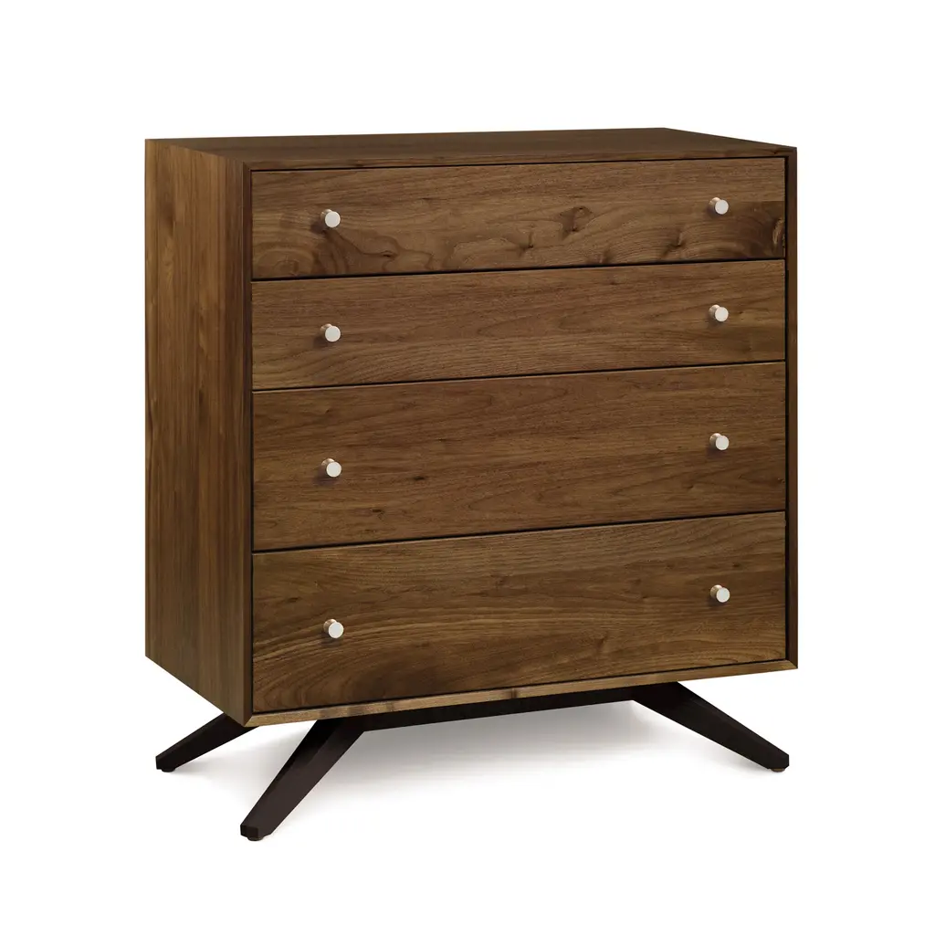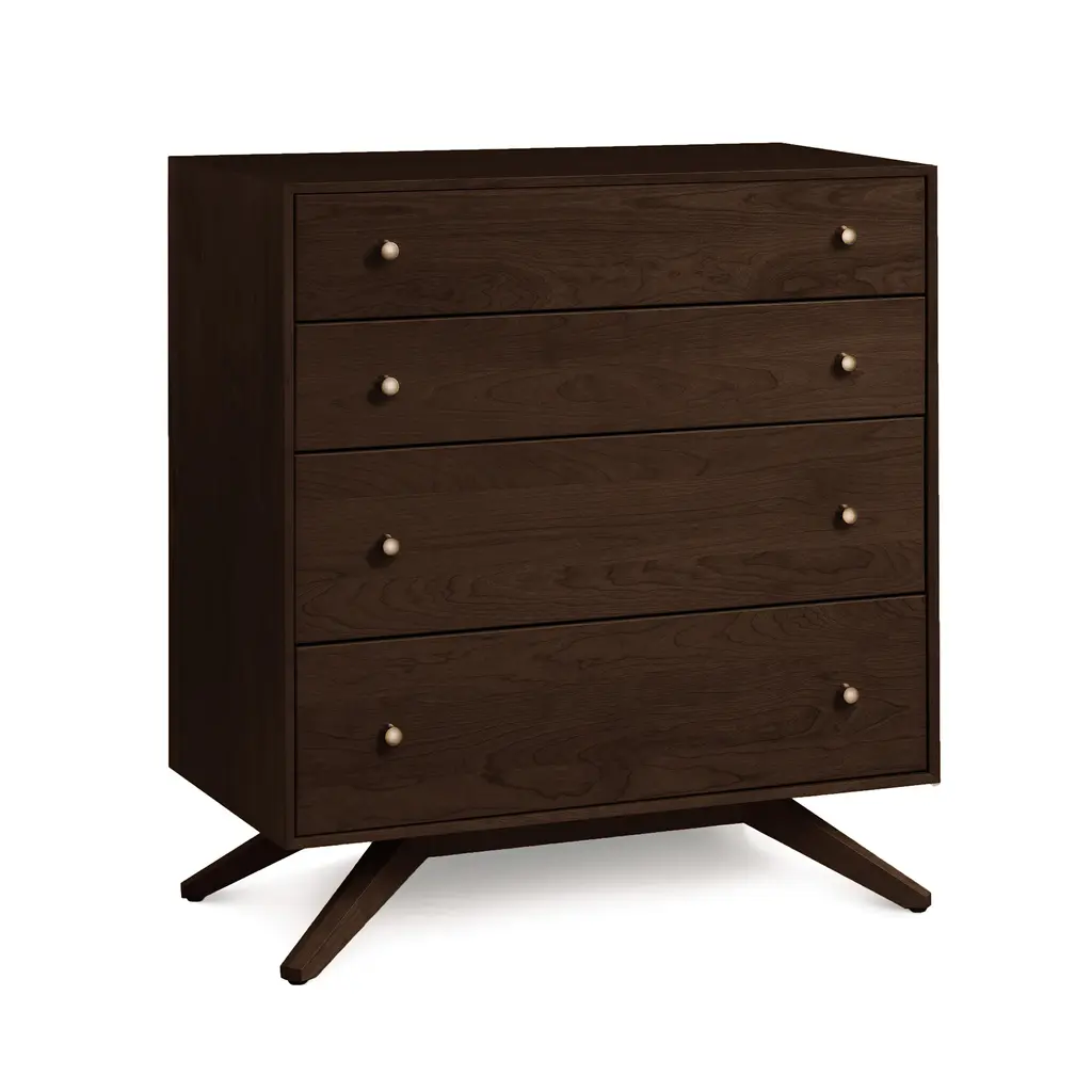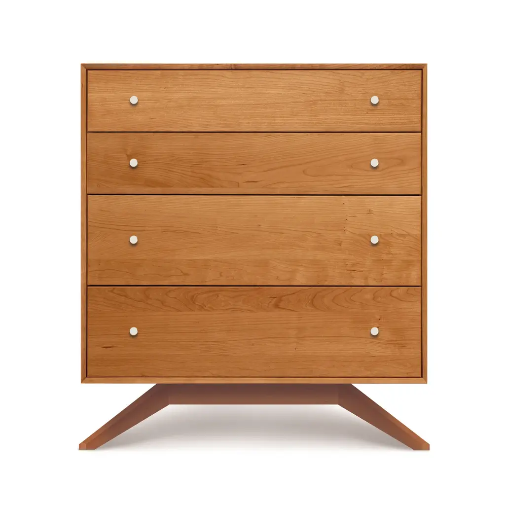 Copeland's dramatic, contemporary Astrid 4-Drawer Chest of Drawers is handcrafted in Vermont of natural solid North American hardwood. Customize online in your choice of wood type and stain.Modern American design features deeply splayed legs producing dramatic, futuristic cantilevers. The Astrid Bedroom Furniture Collection, named after a beautiful Scandinavian goddess, is an engineering feat that defies expectations and inspires a sense of possibility. Handmade in Vermont using eco-friendly, sustainably harvested solid cherry and walnut wood, Astrid's clean, simple design creates an oasis of quiet harmony for the high-end urban bedroom.Base price represents natural solid cherryShown in natural solid cherry Matching furniture available in our Astrid Furniture CollectionNatural variations in solid wood and hand applied finishes make each piece unique. Slight grain and finish irregularities tell you that the furniture has been crafted from solid wood and are considered hallmarks of quality.