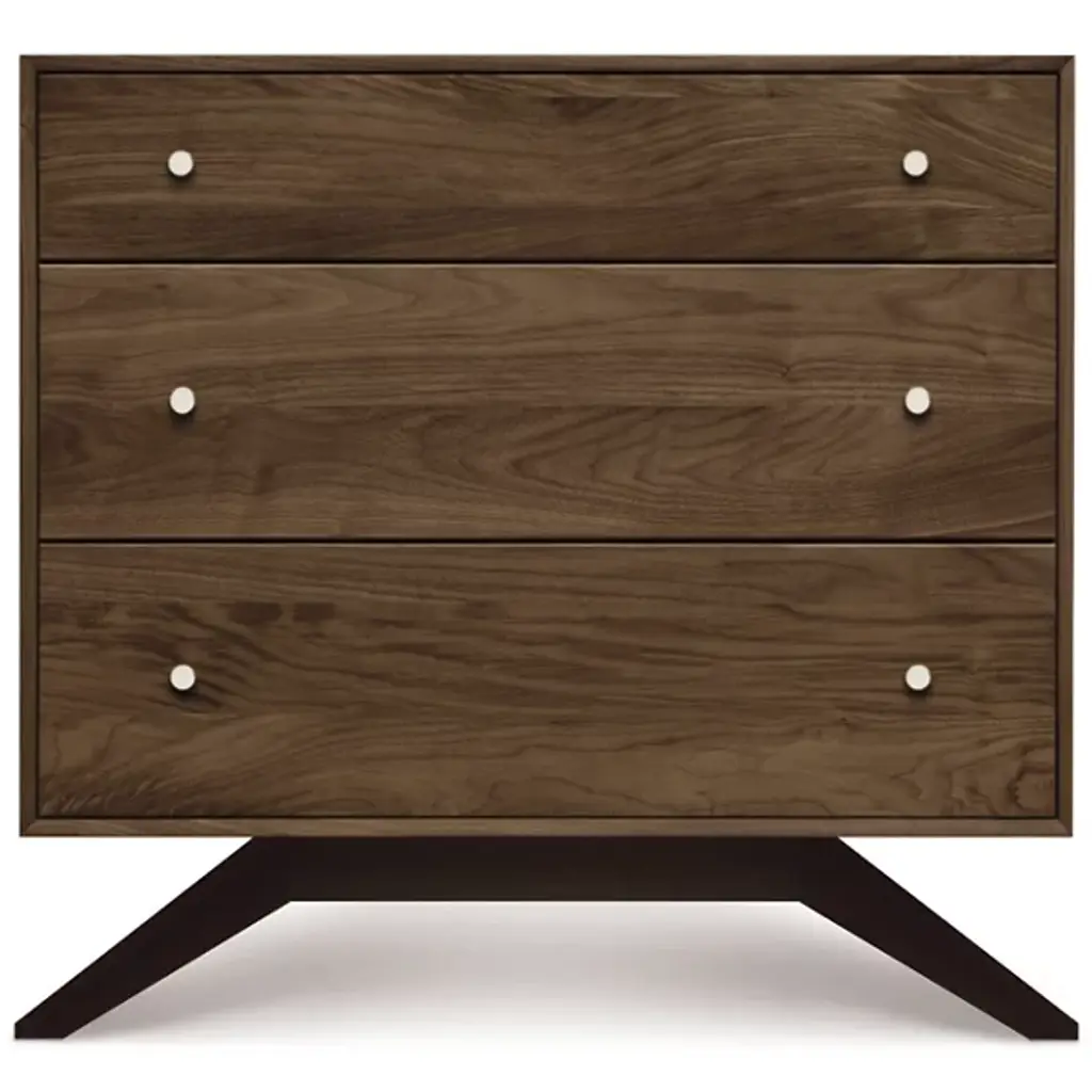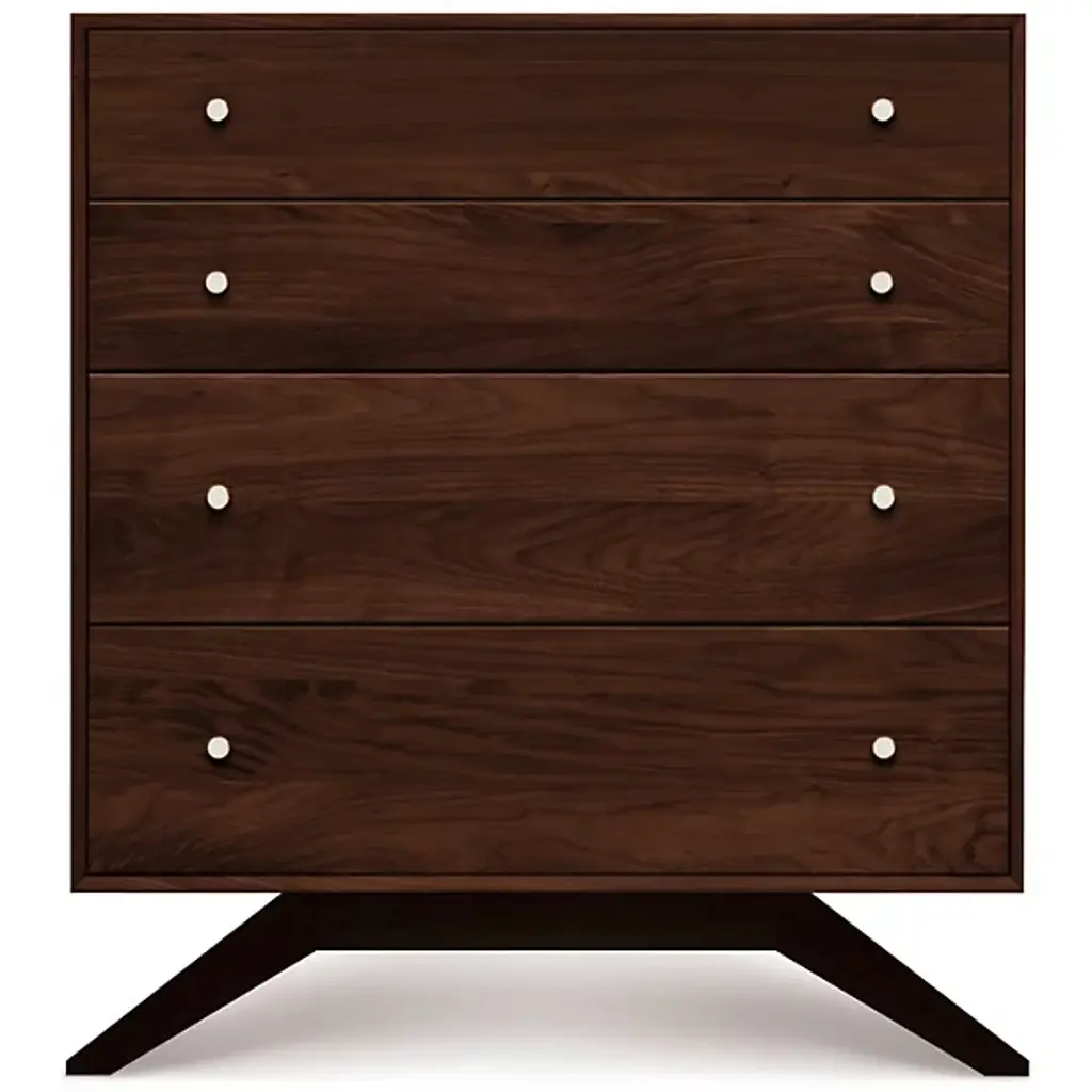 With its unusual and elegant splayed legs, the Copeland Furniture Astrid 4 Drawer Dresser adds style as well as storage. It includes two deeper drawers for shirts and pants and two narrower drawers great for socks and undergarments. It is made out of solid cherry, maple or walnut, available in a range of finishes and a Greenguard certified top coat.