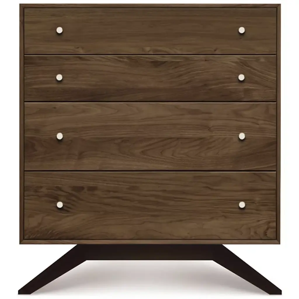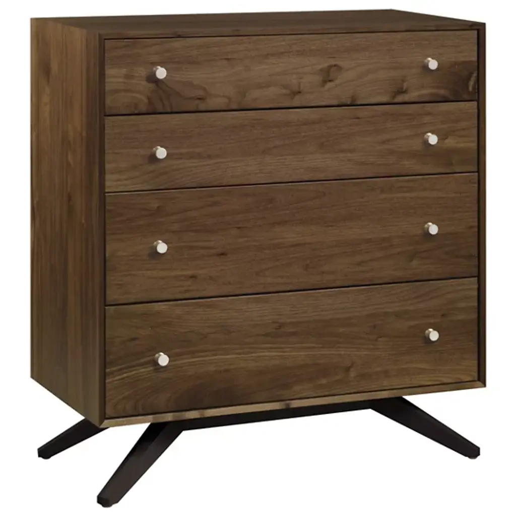 With its unusual and elegant splayed legs, the Copeland Furniture Astrid 4 Drawer Dresser adds style as well as storage. It includes two deeper drawers for shirts and pants and two narrower drawers great for socks and undergarments. It is made out of solid cherry, maple or walnut, available in a range of finishes and a Greenguard certified top coat.