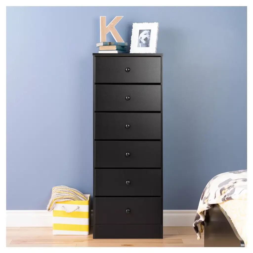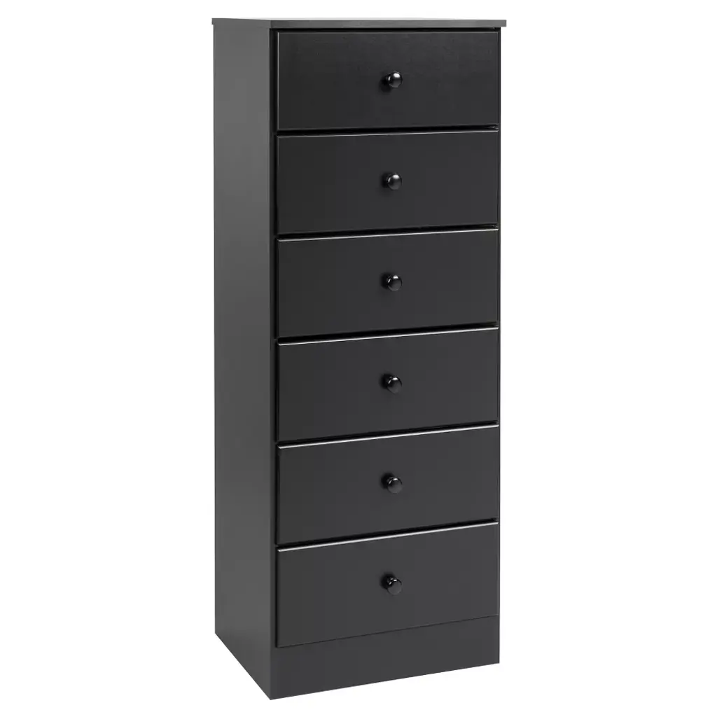 This Astrid 6-Drawer Tall Chest with Crystal Knobs is your small space bedroom solution. It’s contemporary design and clean lines will complement any decor. Profiled drawer fronts and acrylic crystal knobs add a beautifying touch. Use on its own or pair it with other matching pieces from the Astrid Collection.