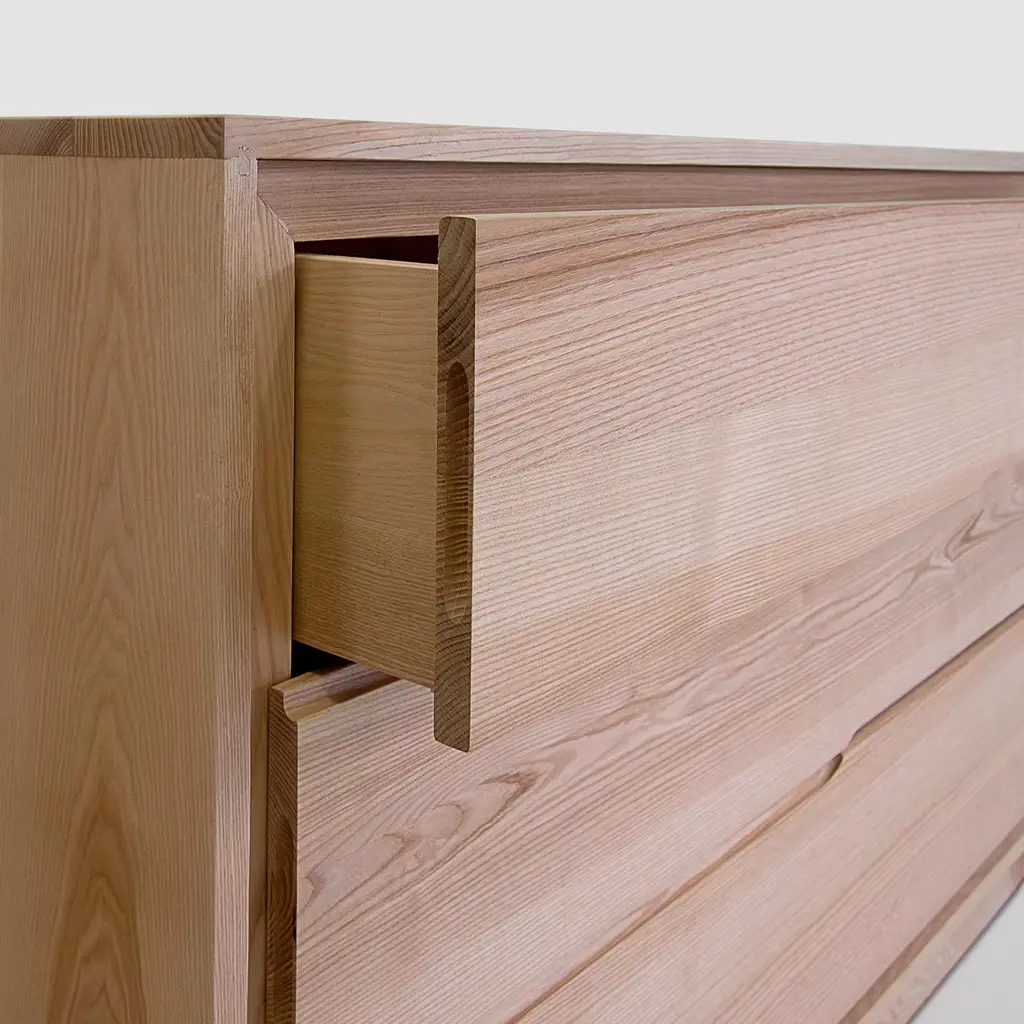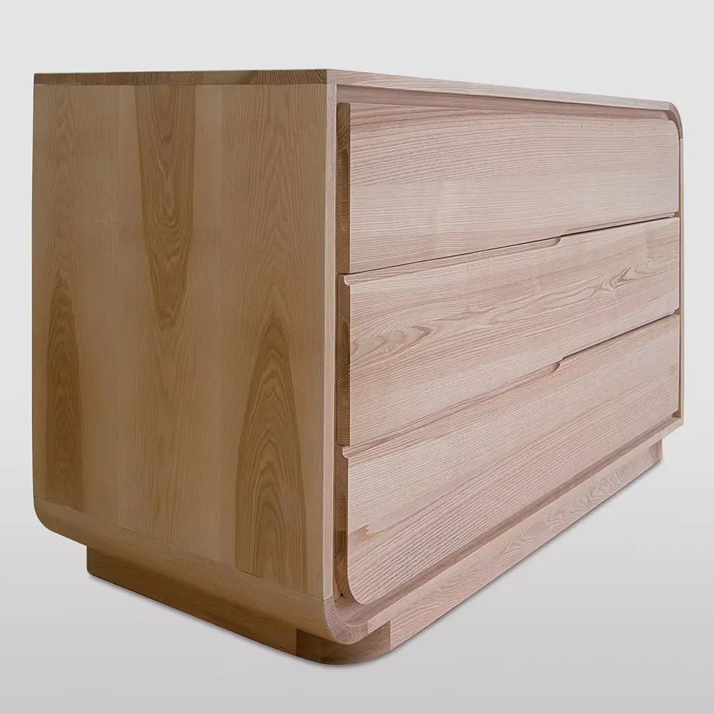 Clean lines enlivened by delicate, asymmetrical edges define the look of this precious dresser handcrafted of solid ash, showcased in its superb natural finish enhanced by hand-applied beeswax. Raised on a plinth base with rounded corners, it provides ample storage space with its three ample drawers, featuring recessed handles and equipped with Blum hidden guides and Blumotion closing system. Please ask the Concierge for customizations and tailor-made options.