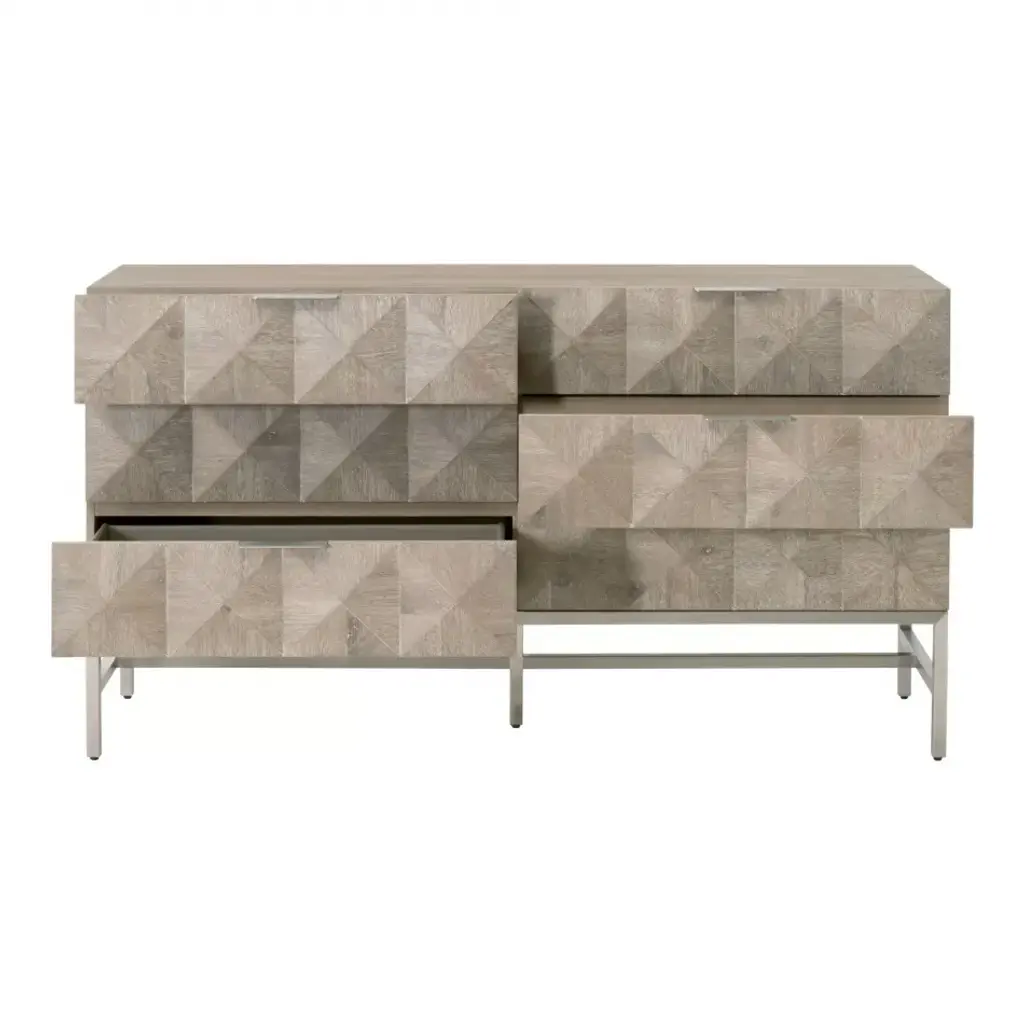 Transitional style double dresser featuring Raised Diamond pattern door panels and Natural Gray finish with Brushed Stainless Steel base.