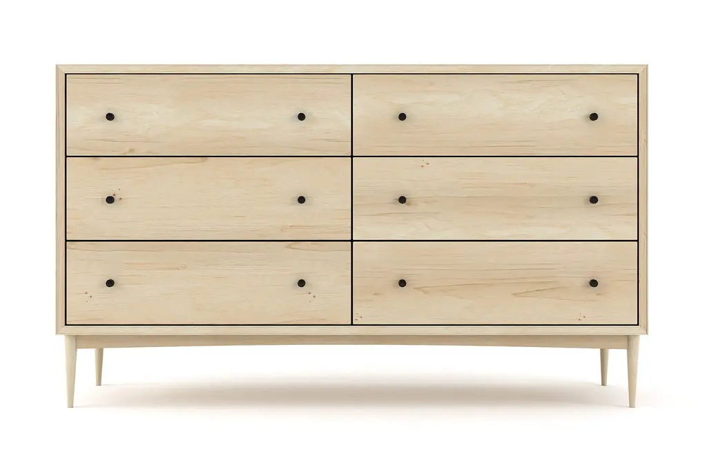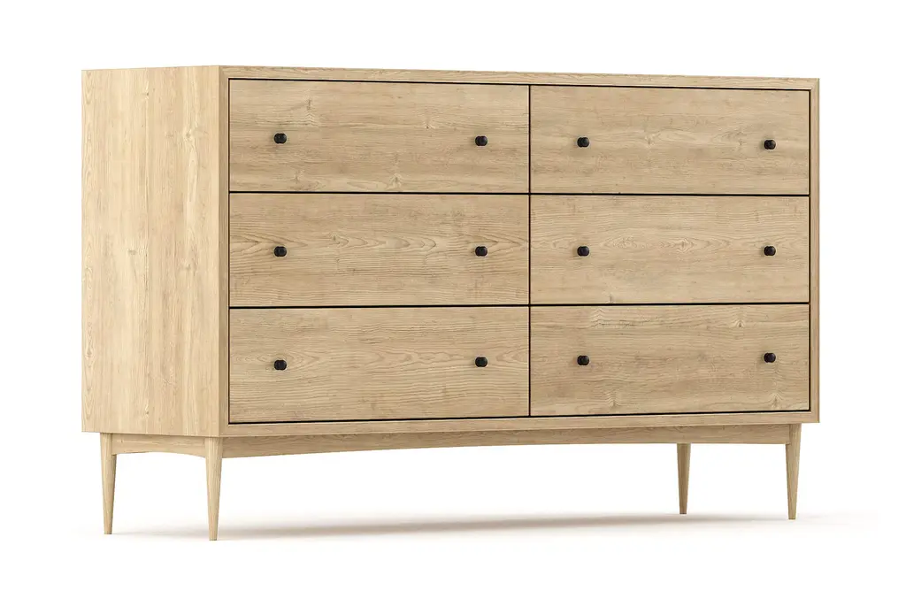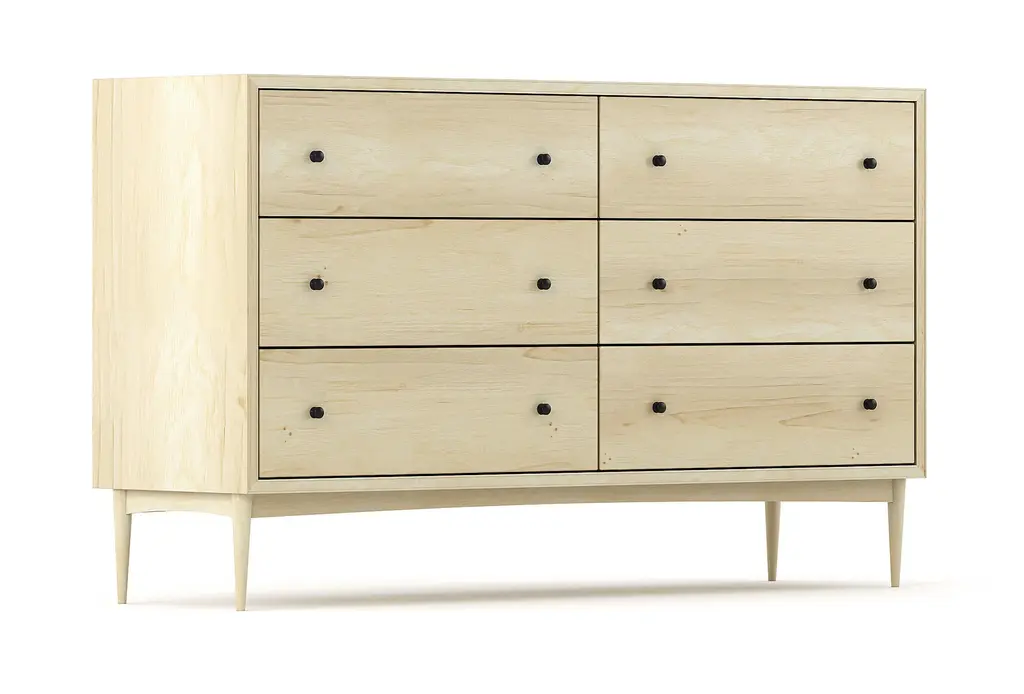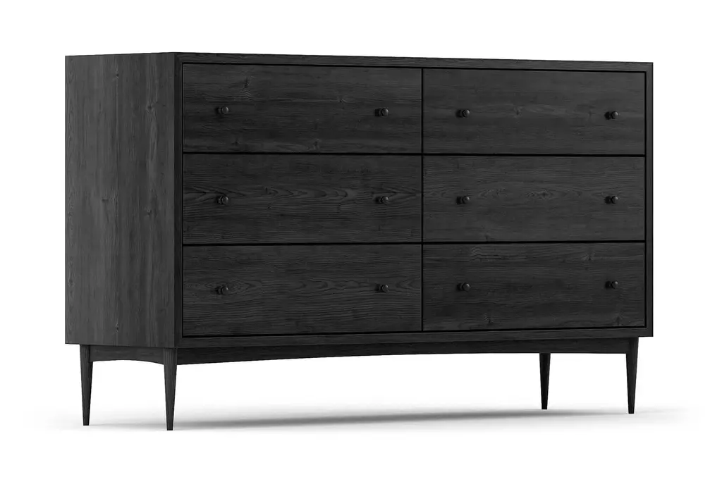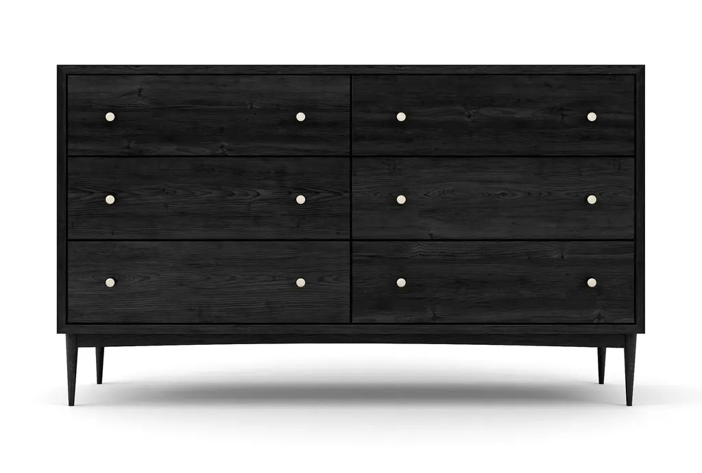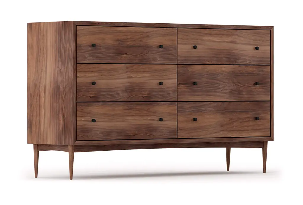 Our Atten 6-Drawer Wide Dresser features two columns of wide, spacious storage bliss: you'll never need to cram your socks and underwear together again. Handcrafted with beautiful joinery, durable mount drawer hardware, and soft close drawers. Also available in 3 and 4-drawer versions.Tops and sides crafted in your choice of beautiful, 100% solid hard White Maple, White Oak, American Walnut, or Black Stained White Oak. For additional strength and lightness, FSC-certified, low-VOC CARB 2 compliant Maple or Walnut hardwood plywood is used elsewhere.