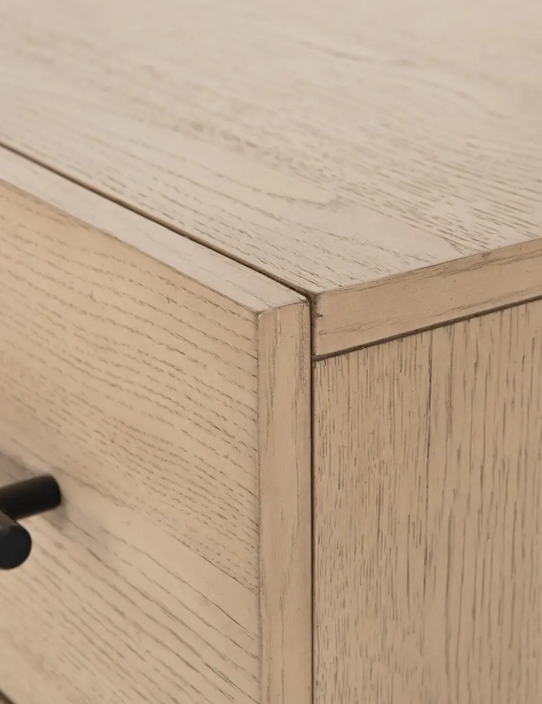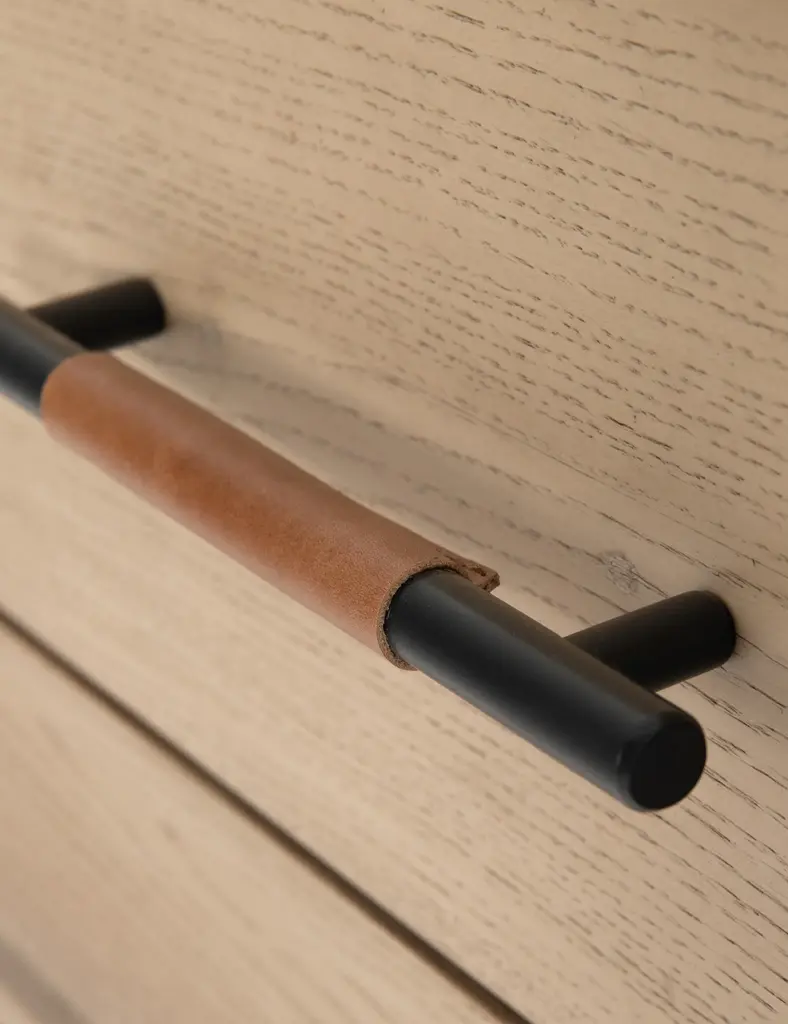 With its clean lines, sandy finish, and leather accents, this tall dresser brings a refined, minimalist effect to your bedroom. Constructed from solid oak and an oak veneer, it's complemented by iron hardware and wrapped in tan top-grain leather. Six roomy drawers provide tons of storage space.