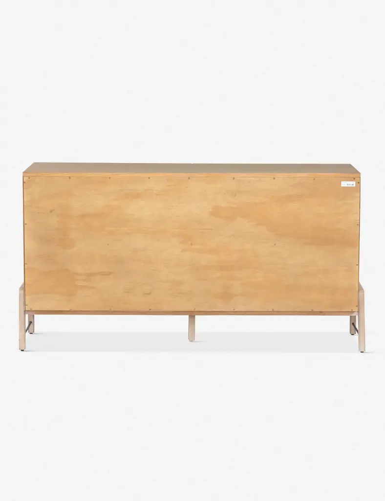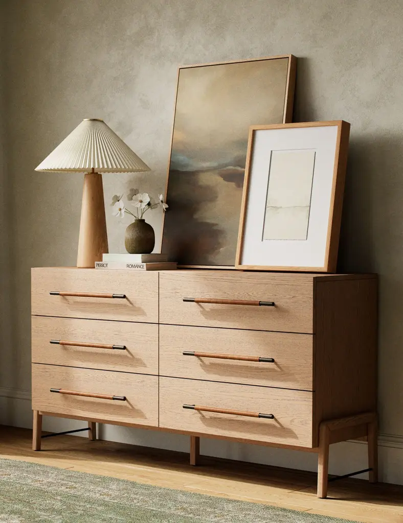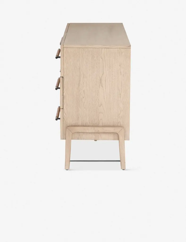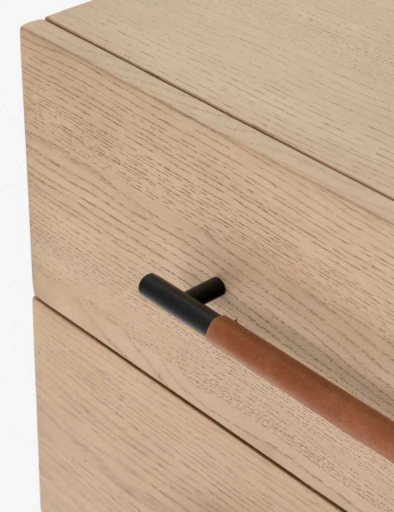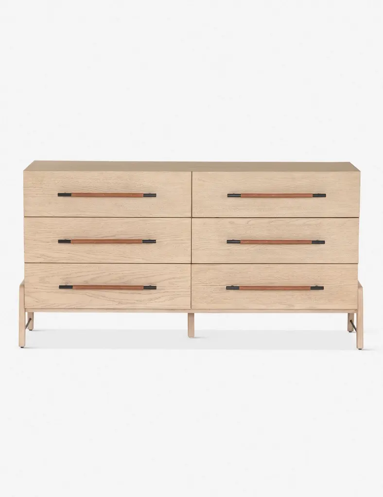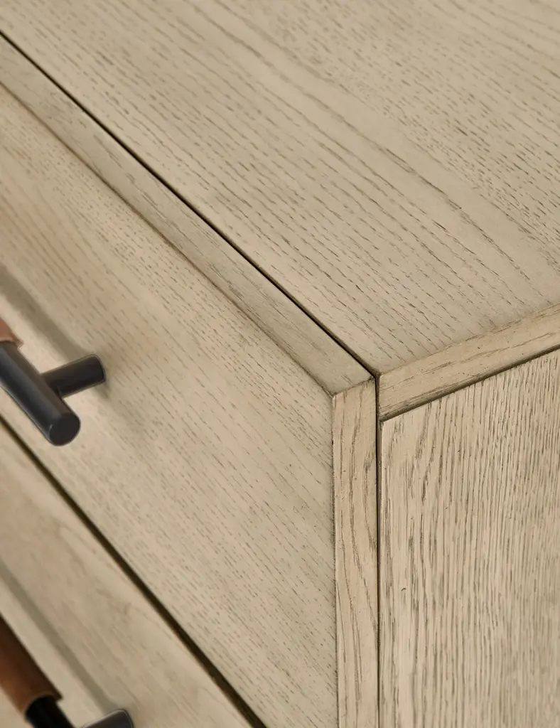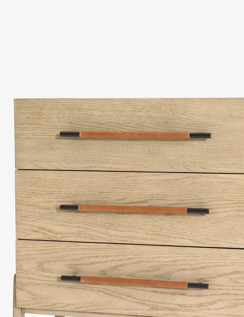 With its clean lines, sandy finish, and leather accents, this dresser brings a refined, minimalist effect to your bedroom. Constructed from solid oak and an oak veneer, it's complemented by iron hardware and wrapped in tan top-grain leather. Six roomy drawers provide tons of storage space.