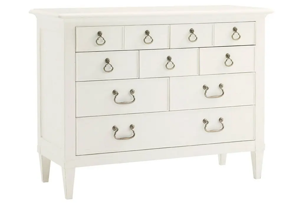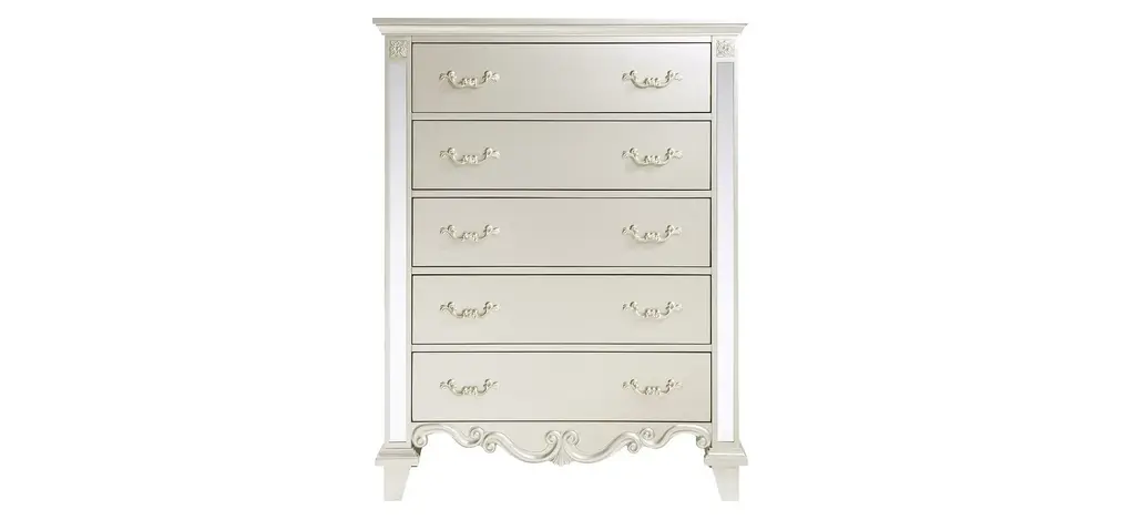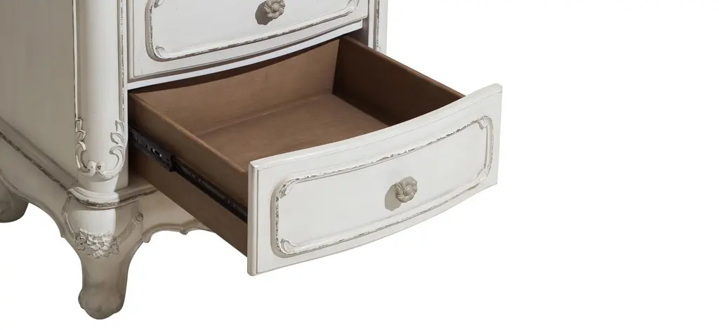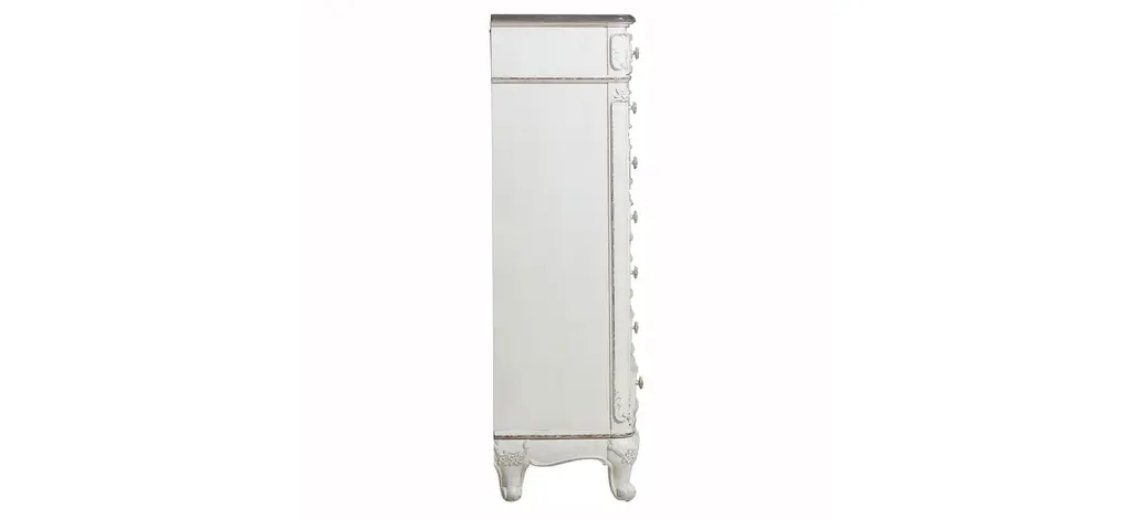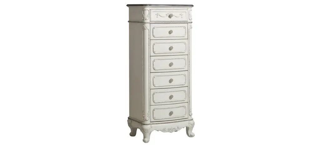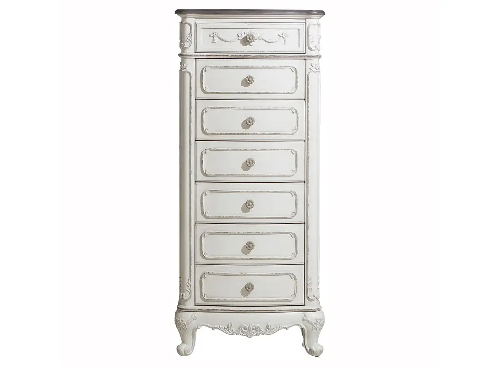 The Averny 7-Drawer bedroom chest is your little child's fantasy dream come true. The Victorian styling incorporates floral motif hardware and traditional carving details on the white with gray rub-through finished chest that will create the feeling of stepping into a fairy tale.