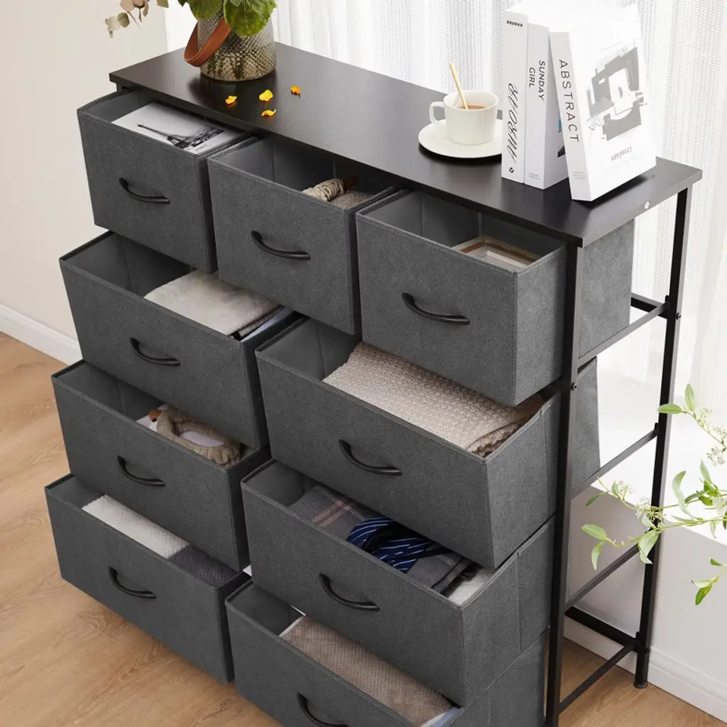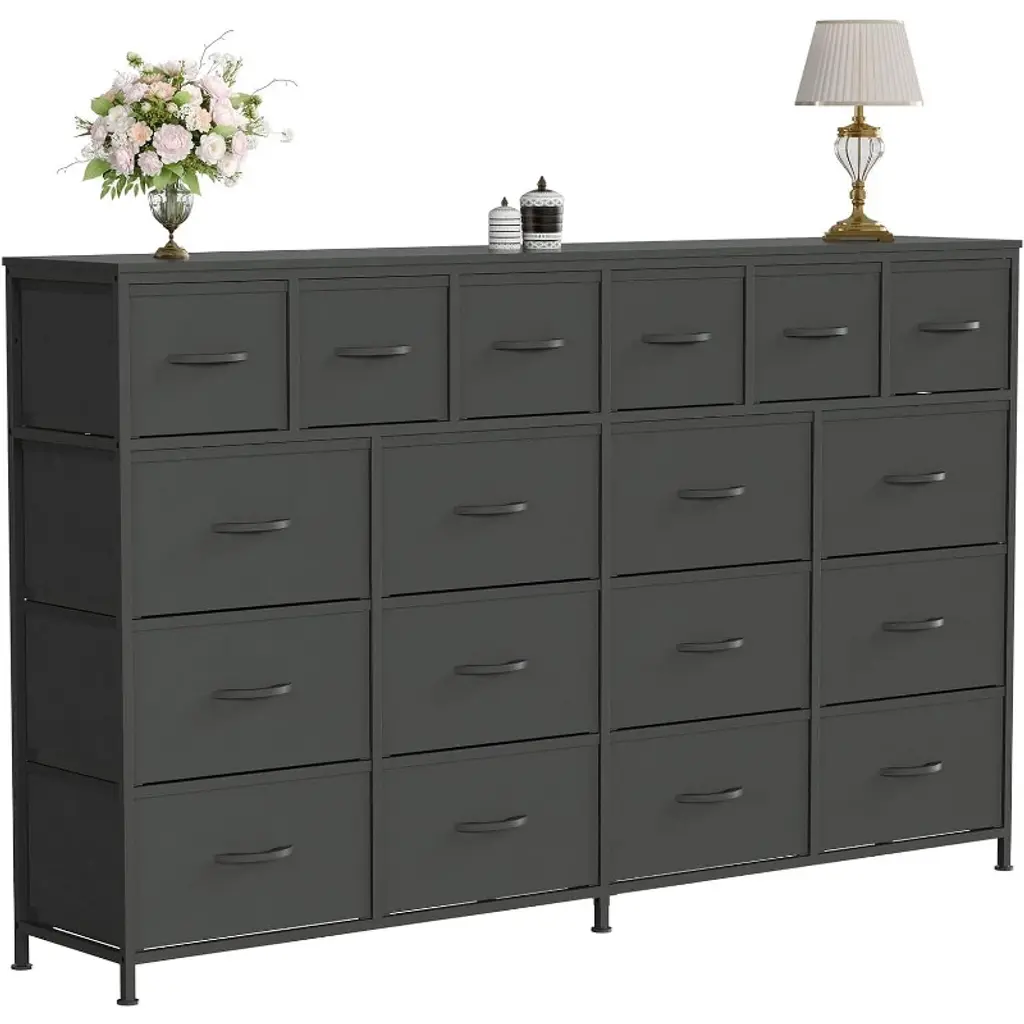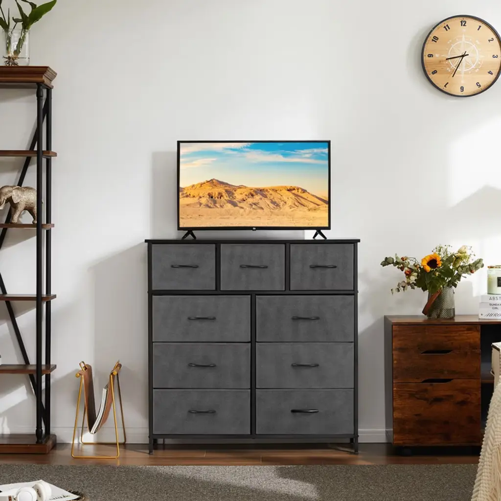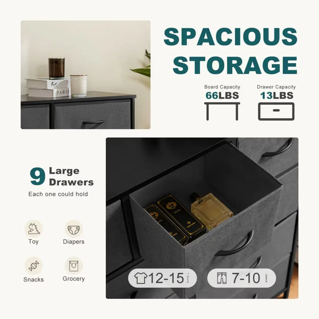 Elevate your home organization with this multifunctional dresser, designed to fit seamlessly into closets, nurseries, and entryways. It offers ample storage with a mix of large and medium drawers, keeping your space orderly and items accessible. The dresser is built to last with a durable design that is safe for kids and easy to clean. Assembly is a breeze with included tools and guidance, backed by responsive customer support.