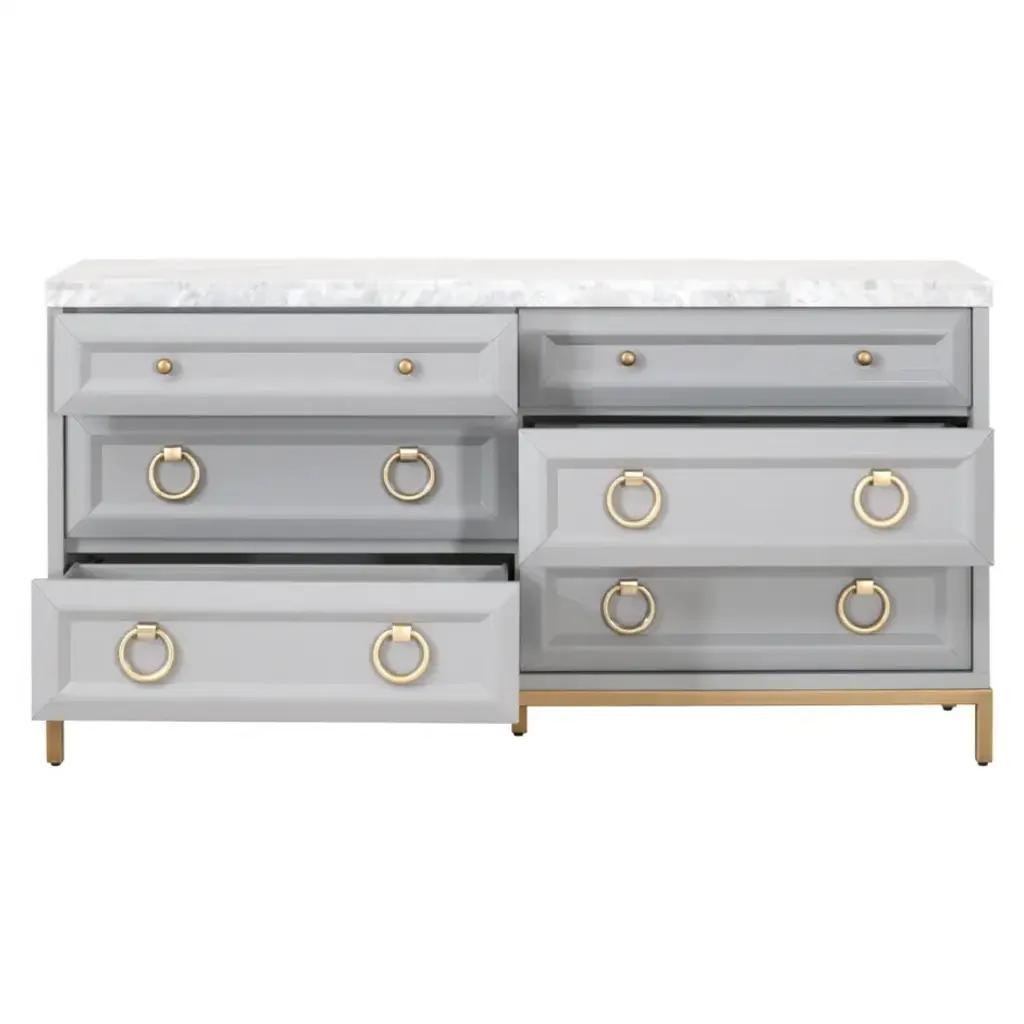 This stunning marble-topped double dresser is the perfect combination of elegance and functionality. It is constructed with gray and white Italian marble and dove gray colored wood with brushed gold hardware. The six storage drawers feature full extension metal glides for accessing your items with ease, and the two top drawers are lined with felt for a plush place to store clothes and other items. This dresser will make a lovely addition to any transitional bedroom setting.