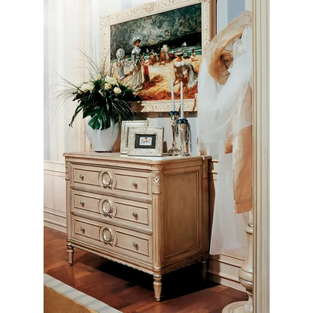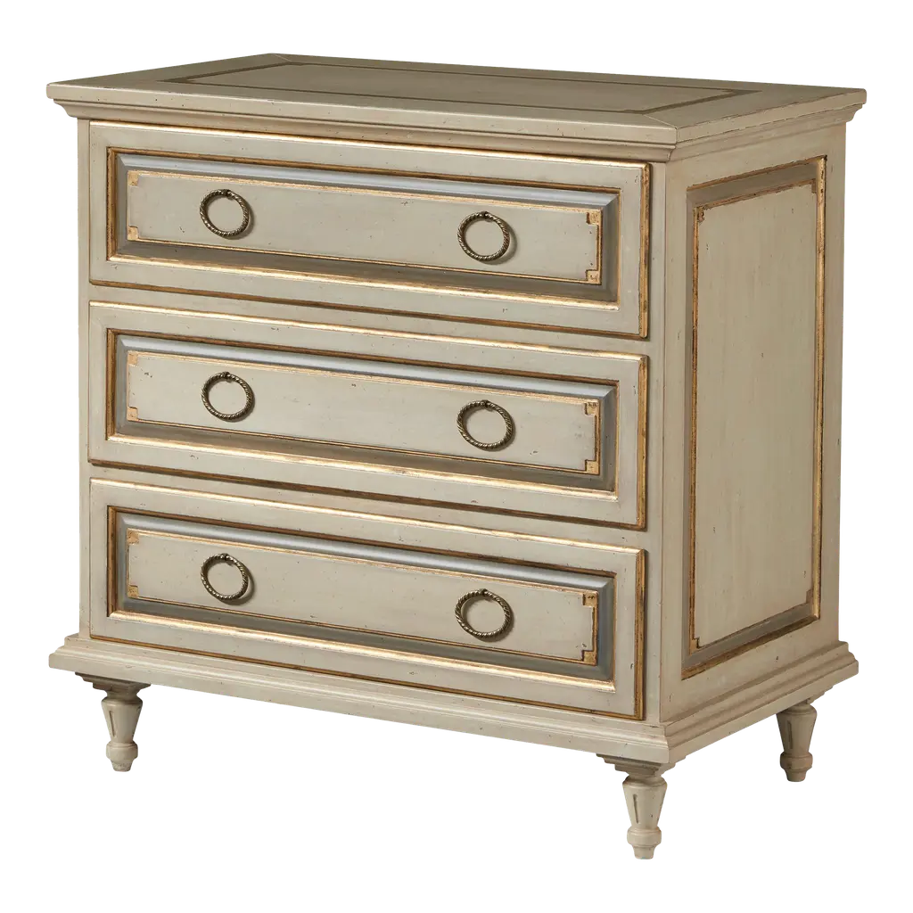 Capturing the vintage charm of the coastal South, the Charleston three-drawer accent chest has carved drawer fronts with bird, floral, and diamond motifs and tapered legs. Featuring 3 self-closing drawers with drawer interiors to match the exterior, the chest is crafted of maple veneers and resin. This weathered color represents years of low country heat and moisture degrading the pure pigment color, creating a truly venerable aesthetic. The round knobs are finished in an antique bronze color.