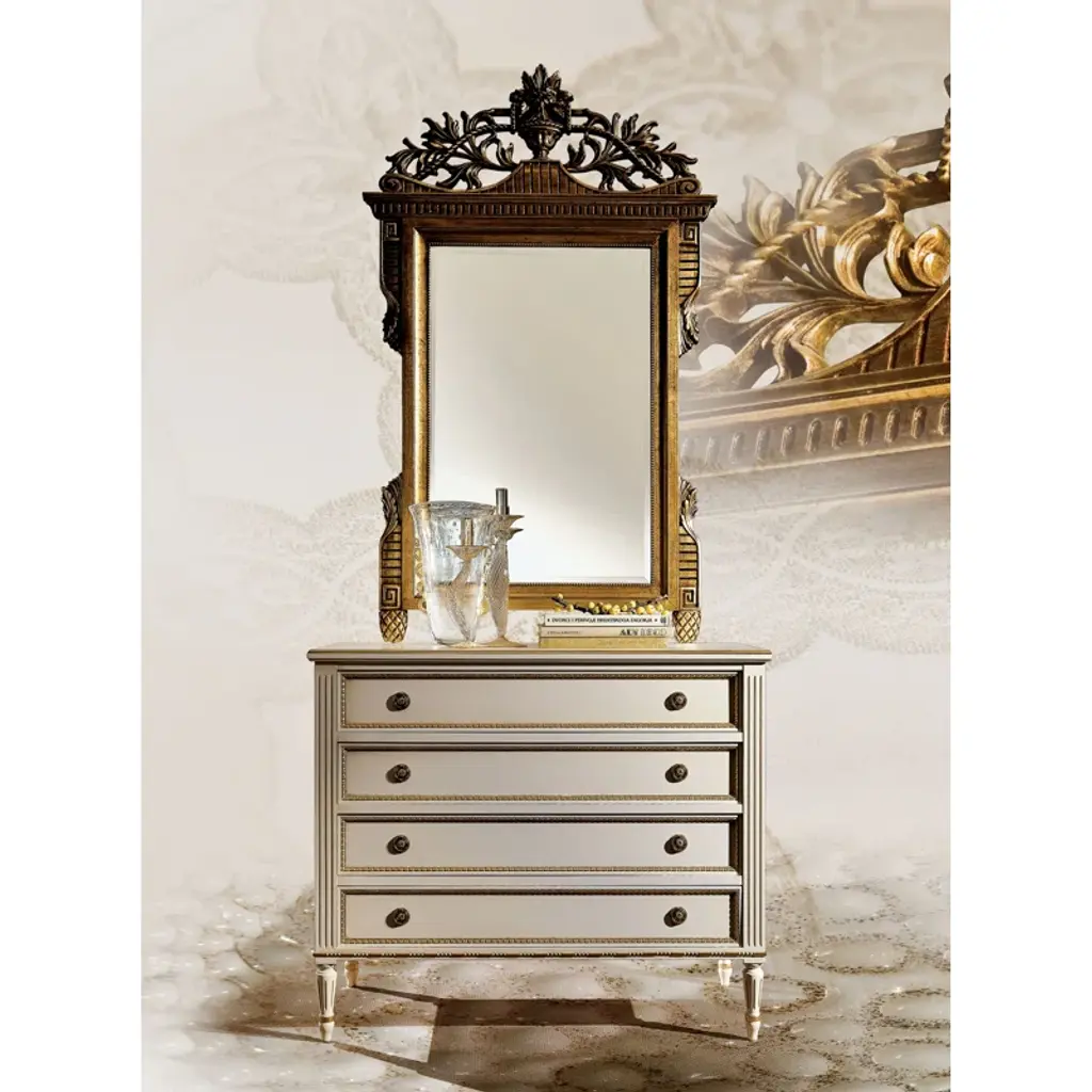 Modernly rustic, this accent chest is the perfect accent piece for your home. With three finished mirrored herringbone oak parquetry drawers, classically tapered legs, and six Verde bronze finish handle, this hand-carved chest will complement several different styles.
