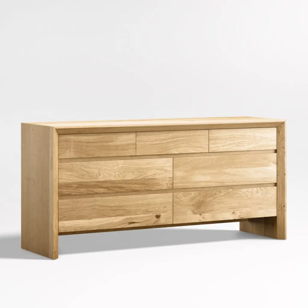 Named after the natural beauty found in the Baja Peninsula, this bedroom dresser celebrates the organic richness of solid white oak. Simple geometry and a natural stain put the focus on the wood's unique grain, knots and markings. Reverse chamfer edges bring dimension to the clean waterfall silhouette, while seven drawersthree small and four largedevote their clean, flat fronts to the wood's lively grain and warm color. Rustic and timeless, the Baja natural oak dresser is a Crate & Barrel exclusive.By choosing FSC ®-certified furniture, you are supporting responsible management of the world's forests.