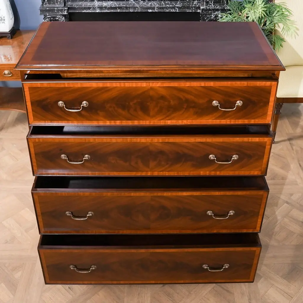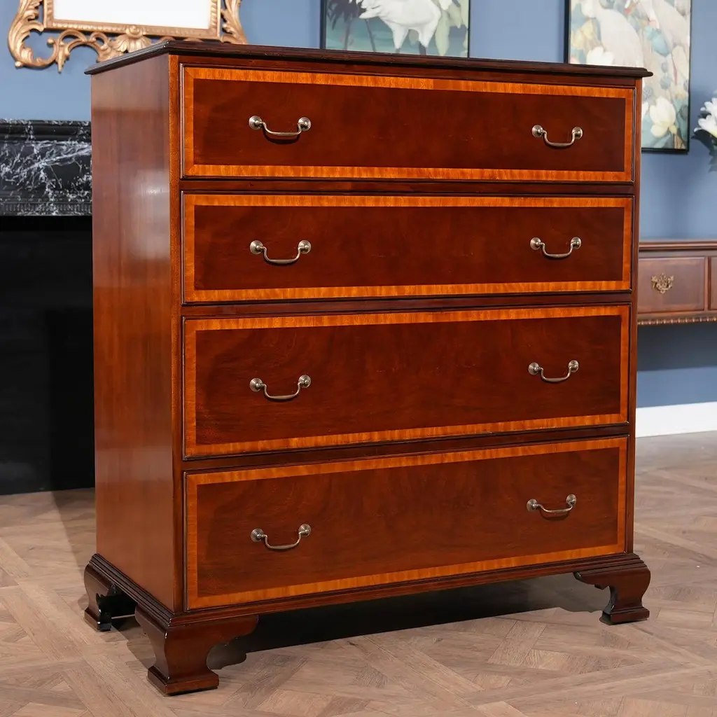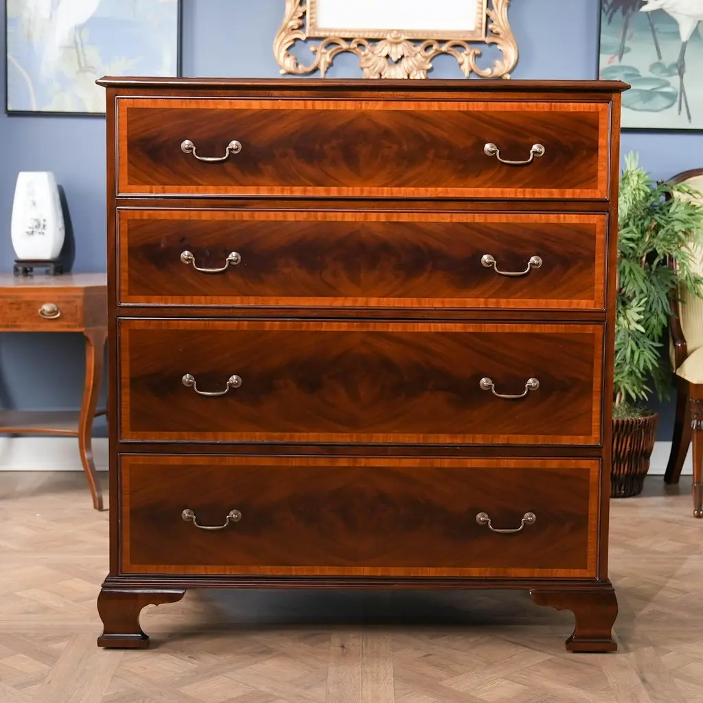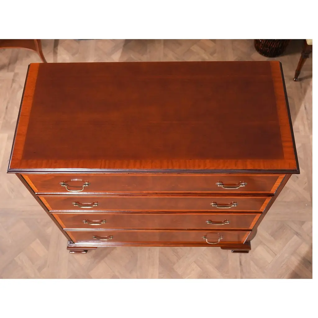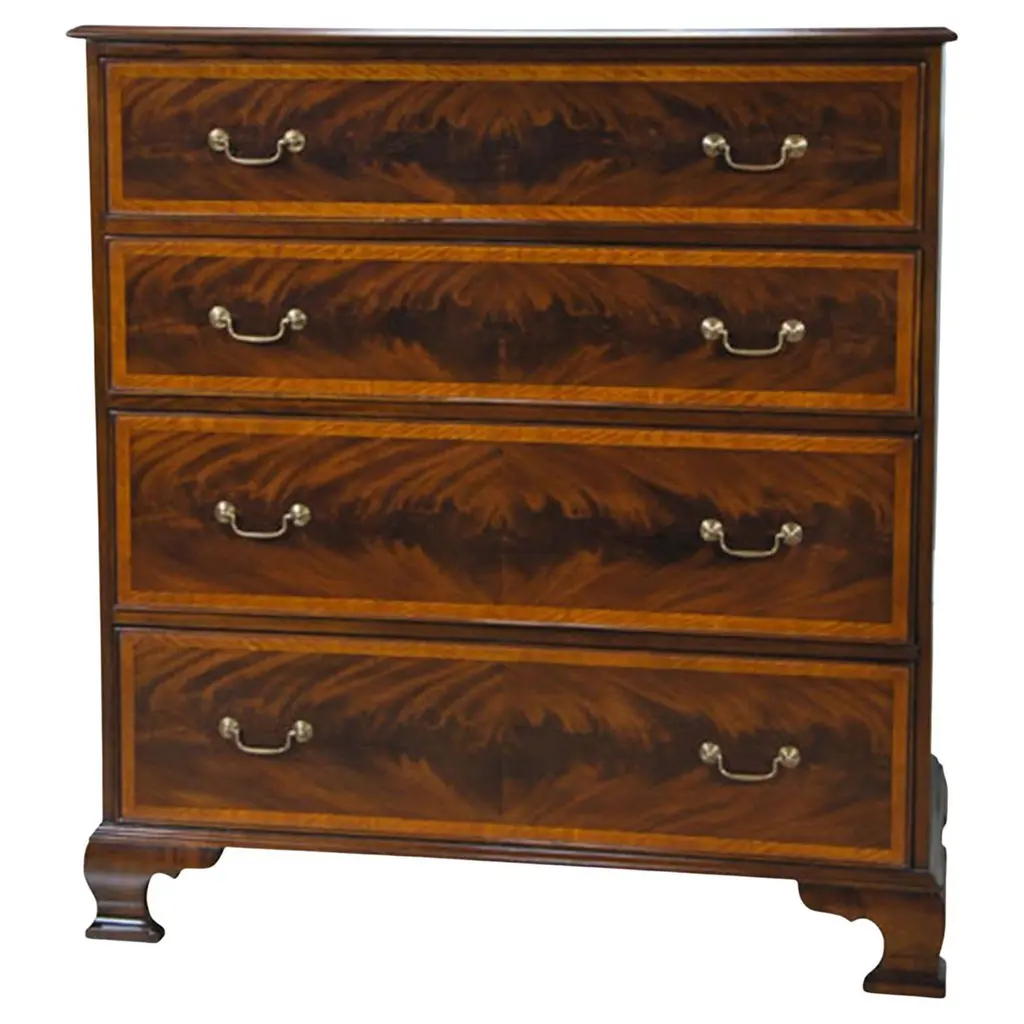 Decorative and functional best describe this high quality Banded Mahogany Chest. Banded Mahogany Chest is a reproduction of an English antique chest from the Eighteenth Century. Both decorative and useful the chest is a pleasure to behold while offering a large amount of useful storage in the deep dovetailed drawers. Created using figural grained mahogany veneers and accented with satinwood banding and brass hardware, this chest features four graduated, dovetailed drawers supported by shaped ogee bracket feet. Ideal in the bedroom our banded mahogany chest is also at home in public living spaces such as a front hallway or in the living room.Measures 45″w x 22″d x 48″h