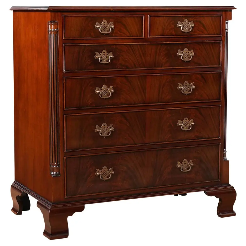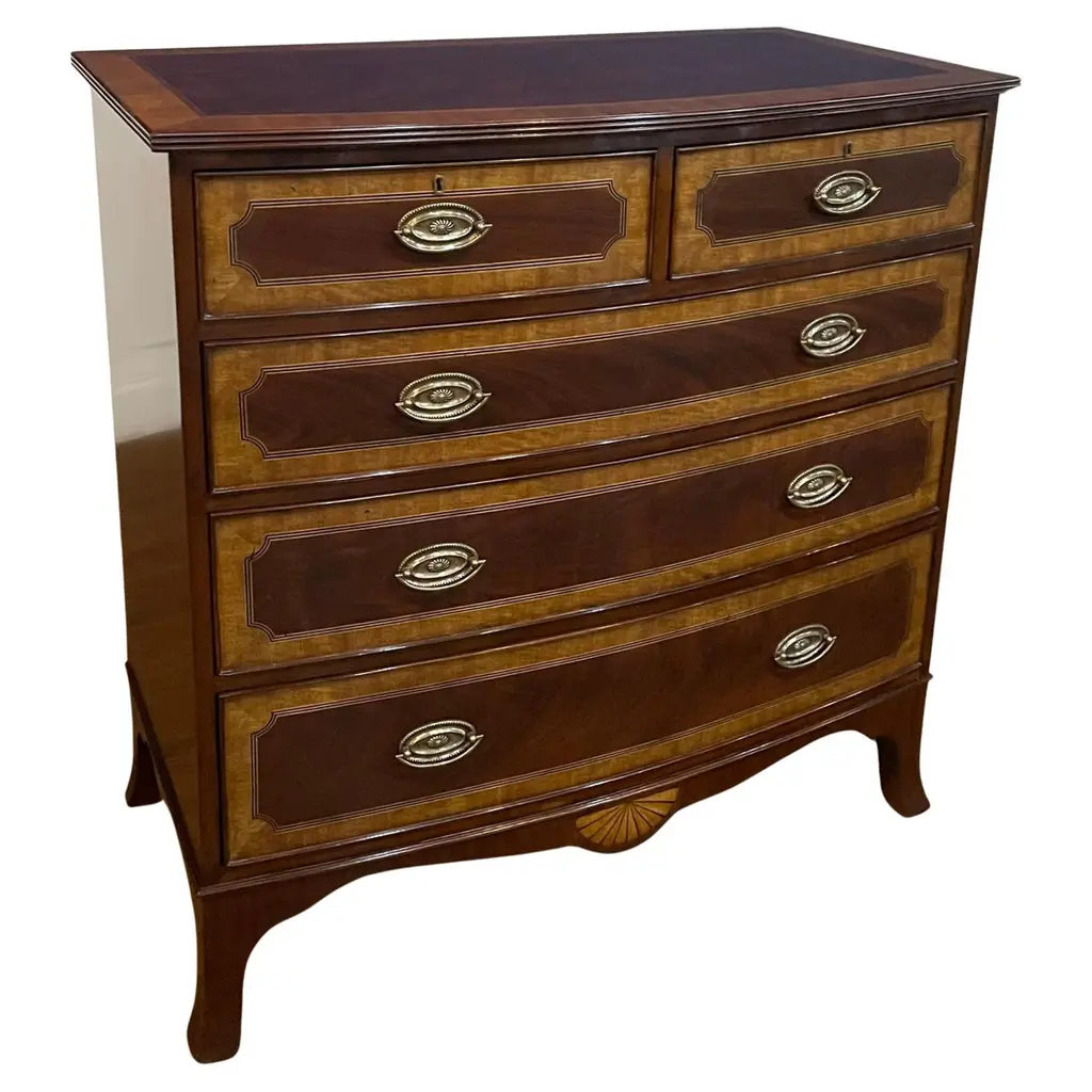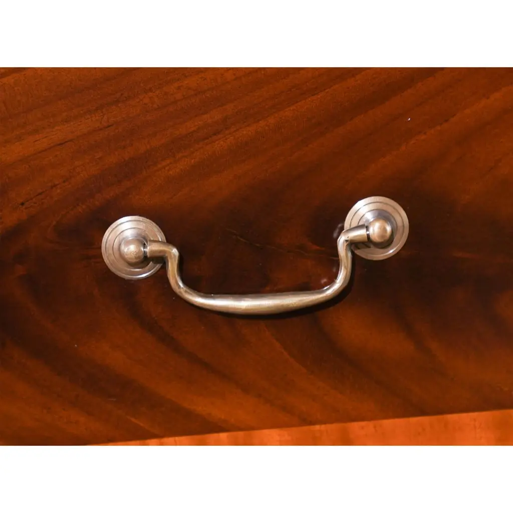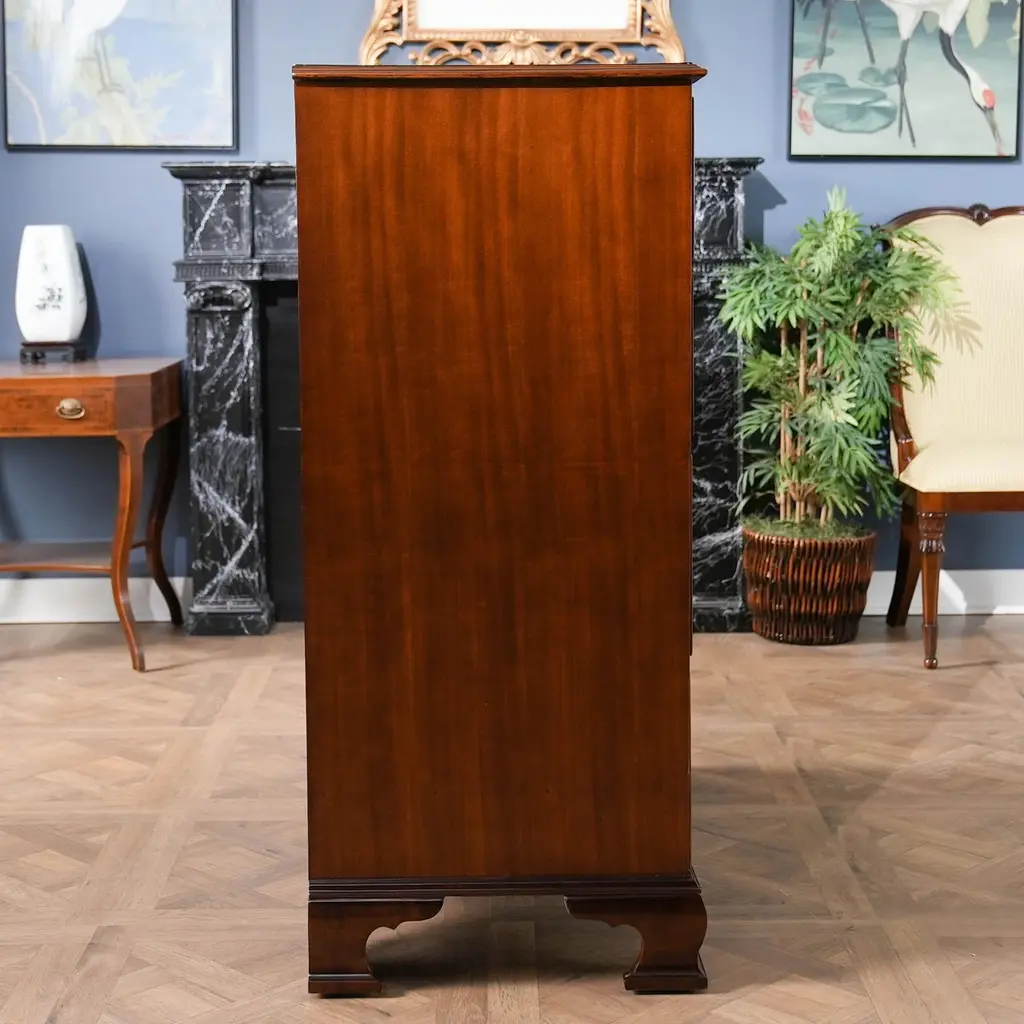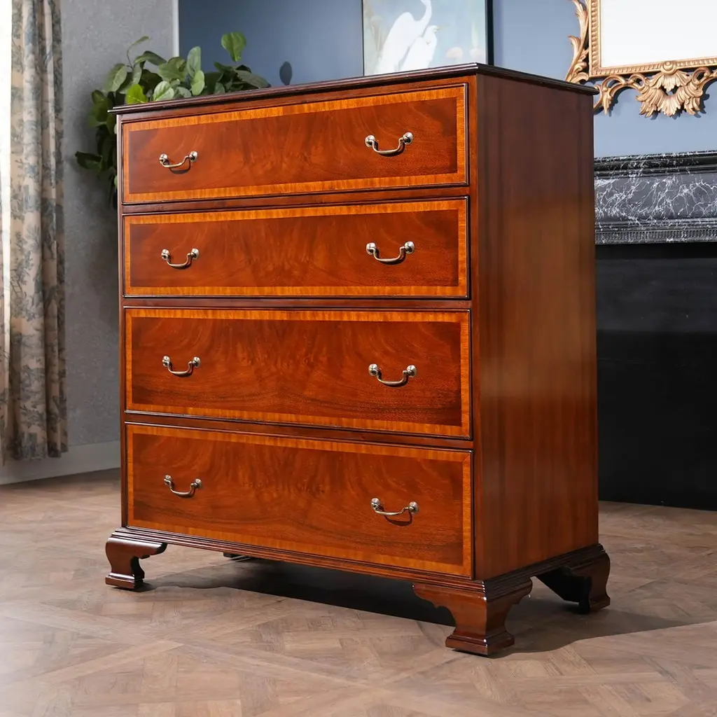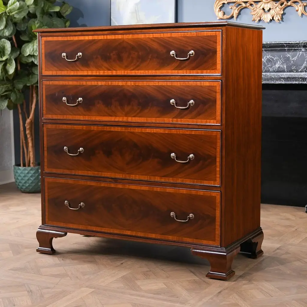 Decorative and functional best describe this high quality Banded Mahogany Chest. Banded Mahogany Chest is a reproduction of an English antique chest from the Eighteenth Century. Both decorative and useful the chest is a pleasure to behold while offering a large amount of useful storage in the deep dovetailed drawers. Created using figural grained mahogany veneers and accented with satinwood banding and brass hardware, this chest features four graduated, dovetailed drawers supported by shaped ogee bracket feet. Ideal in the bedroom our banded mahogany chest is also at home in public living spaces such as a front hallway or in the living room.Measures 45″w x 22″d x 48″h