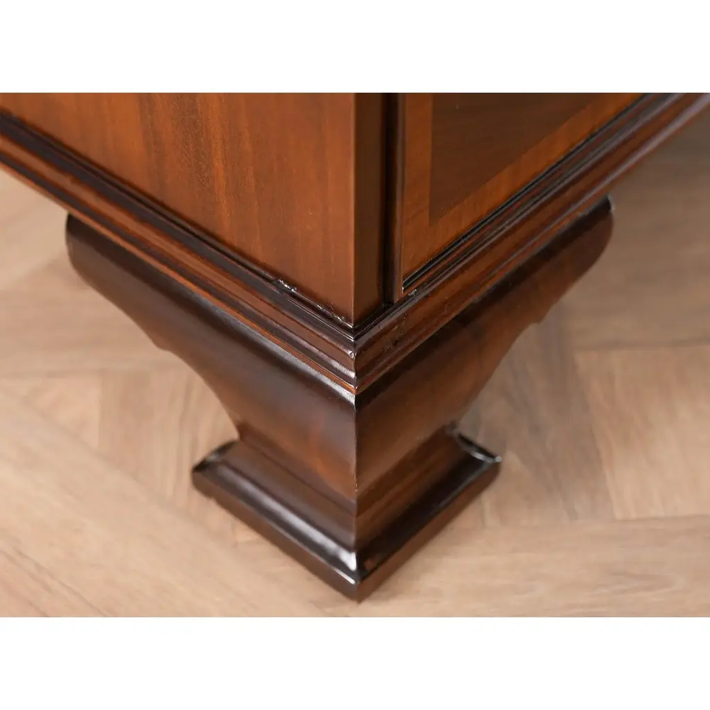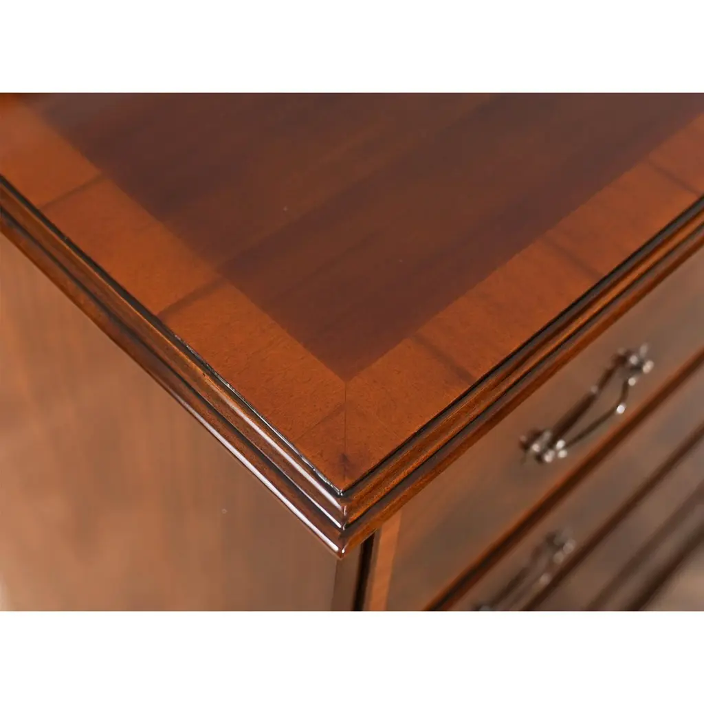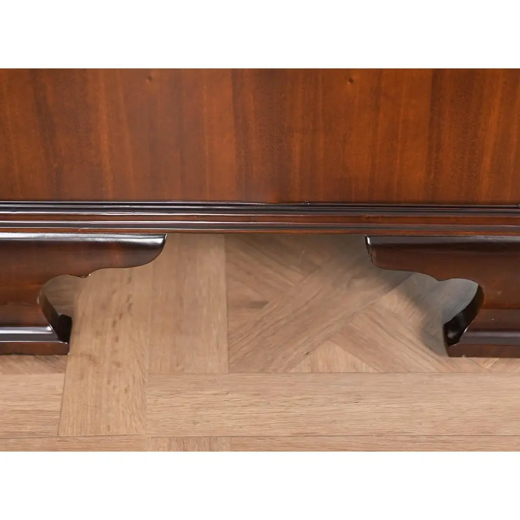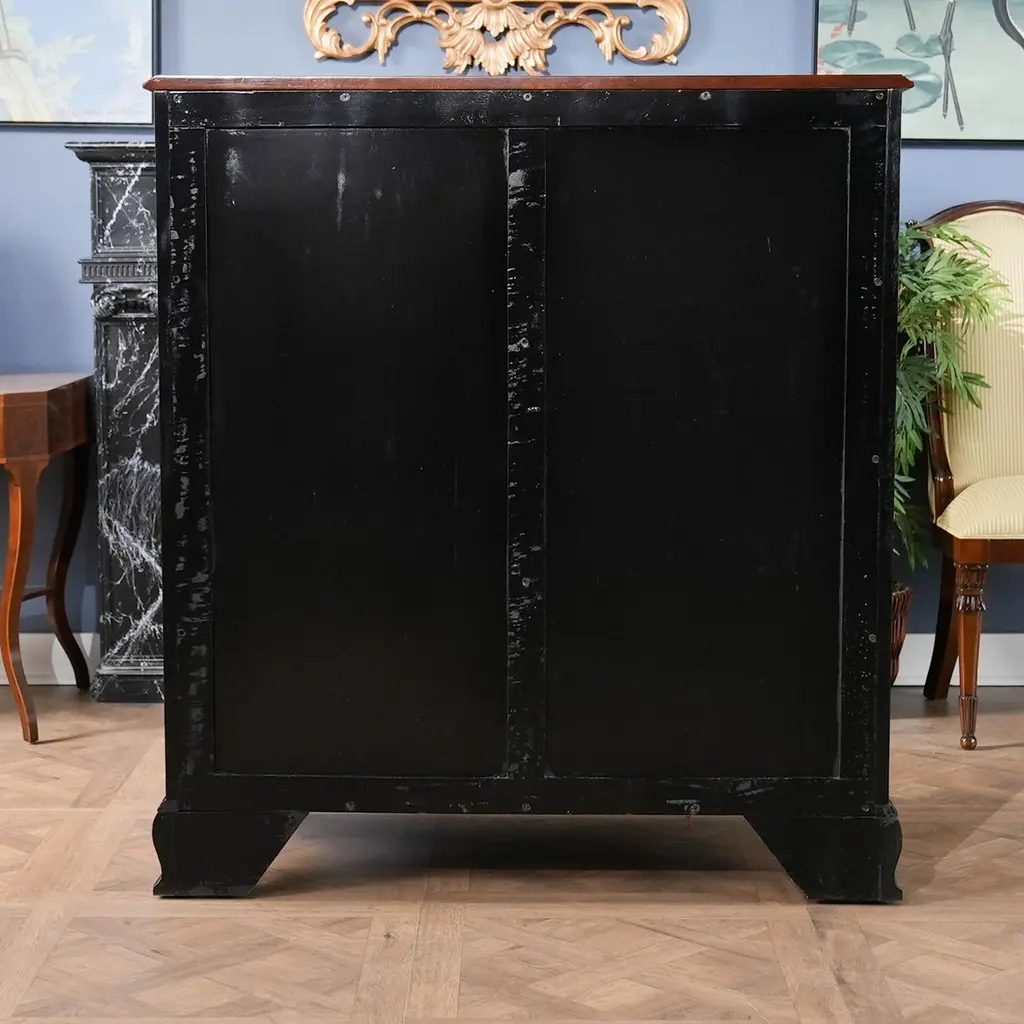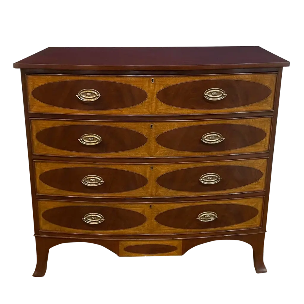 Decorative and functional best describe this high quality Banded Mahogany Chest. Banded Mahogany Chest is a reproduction of an English antique chest from the Eighteenth Century. Both decorative and useful the chest is a pleasure to behold while offering a large amount of useful storage in the deep dovetailed drawers. Created using figural grained mahogany veneers and accented with satinwood banding and brass hardware, this chest features four graduated, dovetailed drawers supported by shaped ogee bracket feet. Ideal in the bedroom our banded mahogany chest is also at home in public living spaces such as a front hallway or in the living room.Measures 45″w x 22″d x 48″h