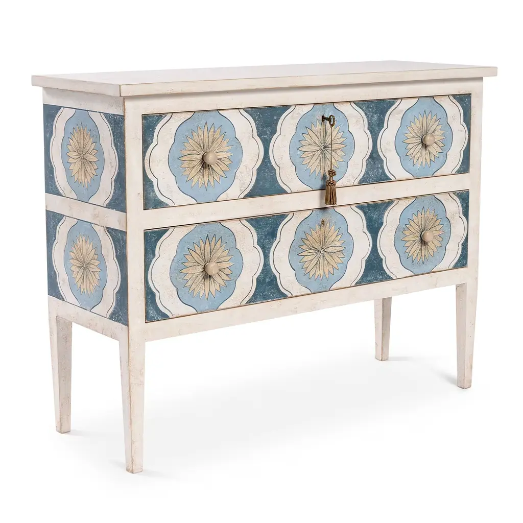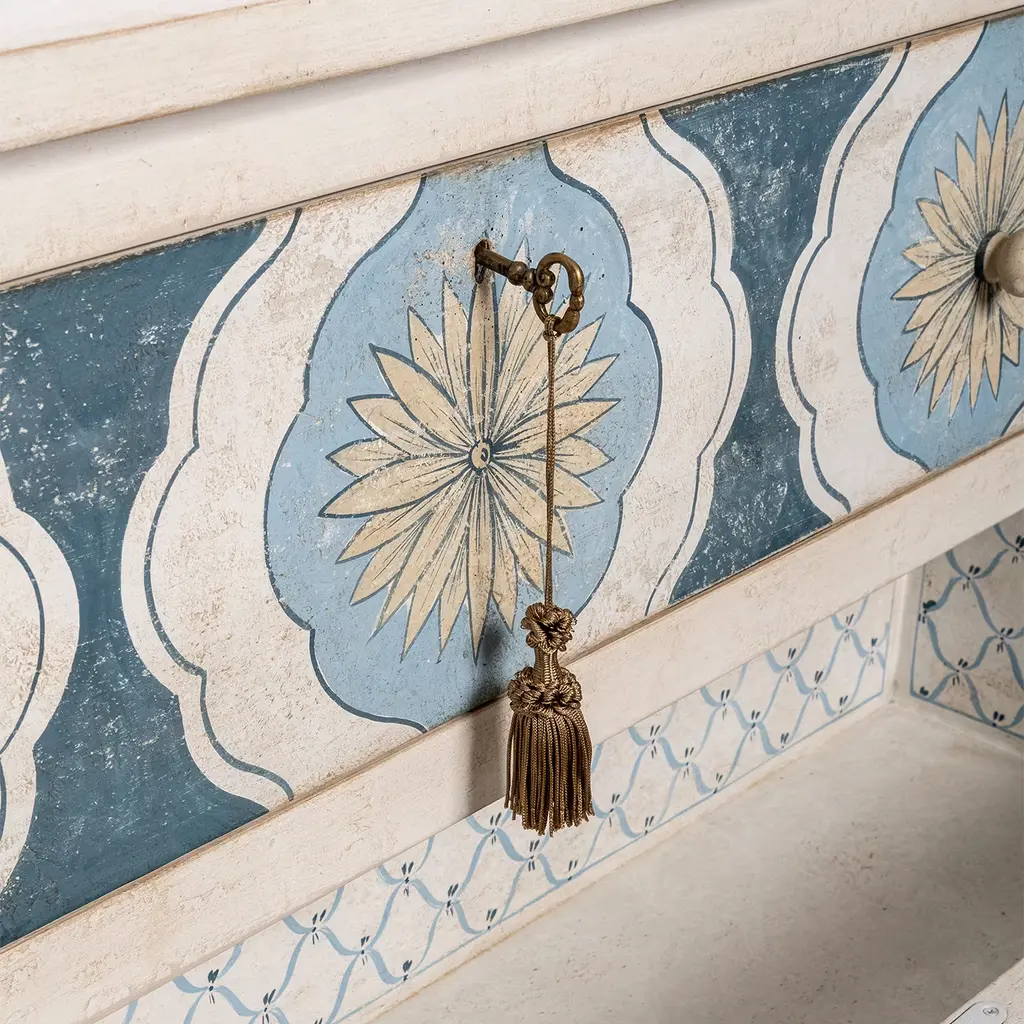 Introducing Barberini Chest with sunflower decor in deep sea blue and parma blue tones. The ribbon decoration inside the drawers adds a delightful touch. Customizable in size and design. Please, ask the Concierge service for further information.