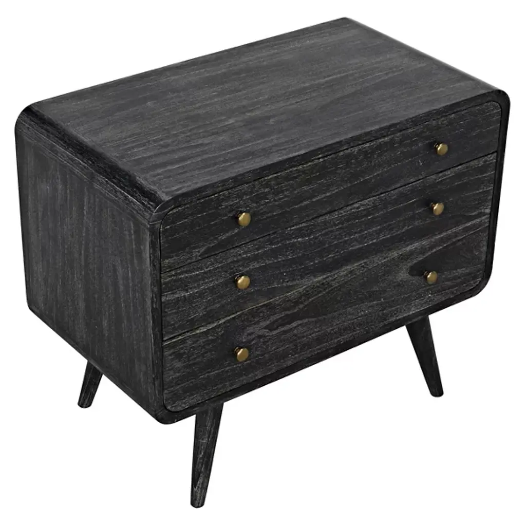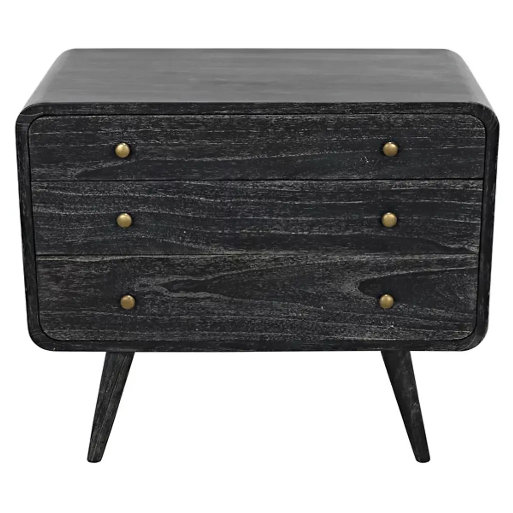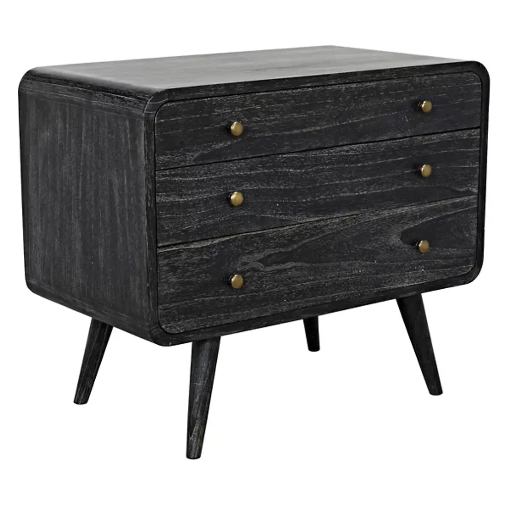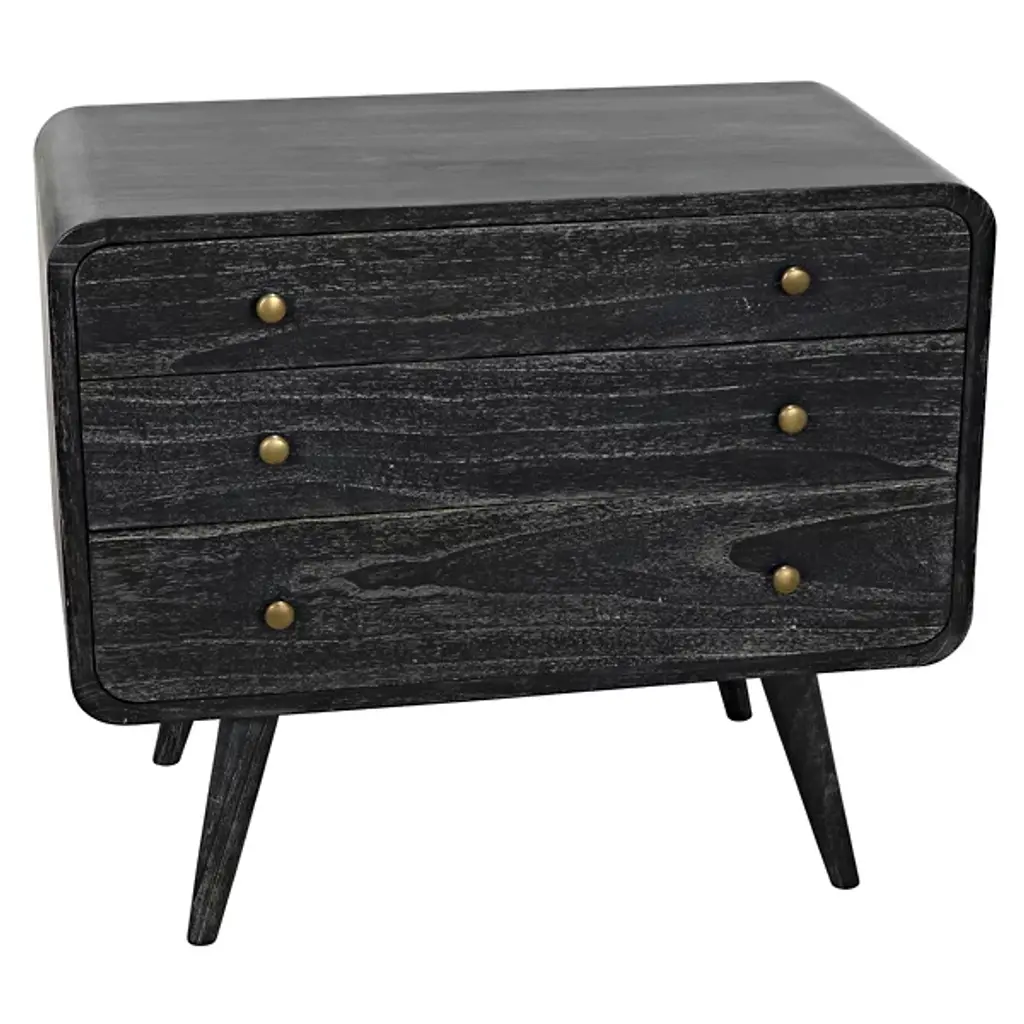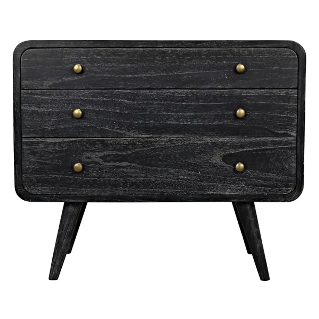 The Bart Chest from Noir curves at every edge, softening what would otherwise be a rectangular form. Mindi wood grain runs horizontally across three drawers, creating natural patterning that complements the chest's mid-century lines. Six brass pulls punctuate the front face, providing necessary contrast against the dark finish. The tapered legs angle outward slightly, lifting the body of the piece off the floor and enhancing its buoyant quality. This chest works equally well as bedroom storage or as an unexpected media console in living spaces.
