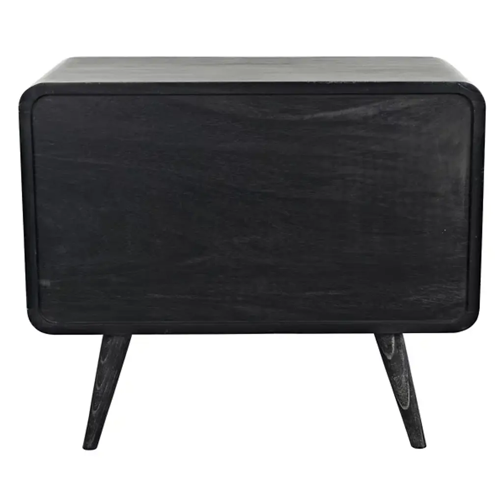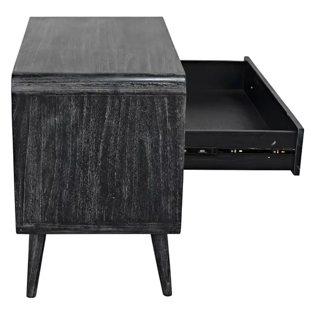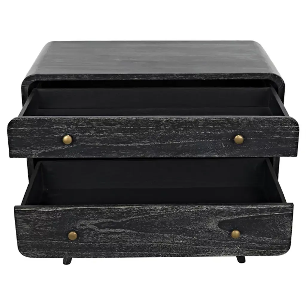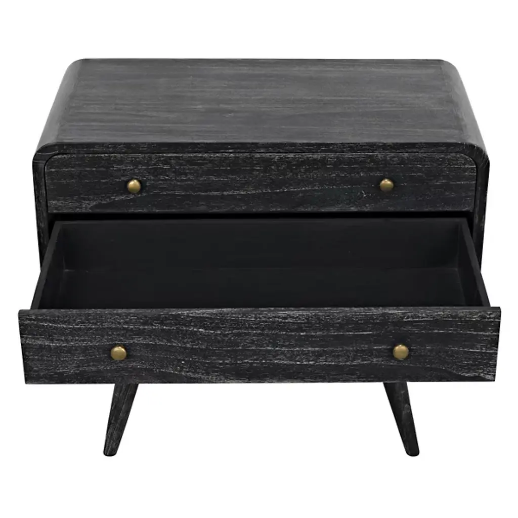 The Bart Chest from Noir curves at every edge, softening what would otherwise be a rectangular form. Mindi wood grain runs horizontally across three drawers, creating natural patterning that complements the chest's mid-century lines. Six brass pulls punctuate the front face, providing necessary contrast against the dark finish. The tapered legs angle outward slightly, lifting the body of the piece off the floor and enhancing its buoyant quality. This chest works equally well as bedroom storage or as an unexpected media console in living spaces.