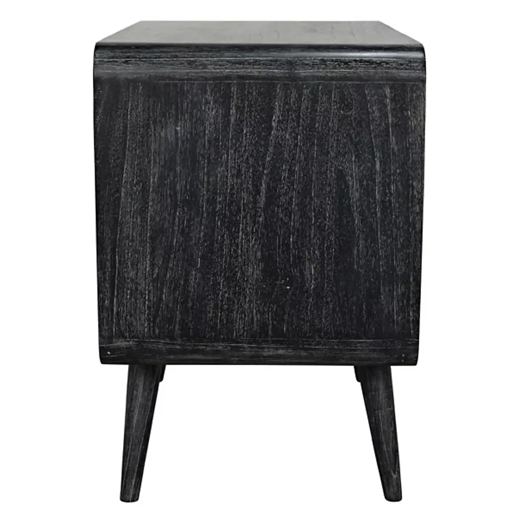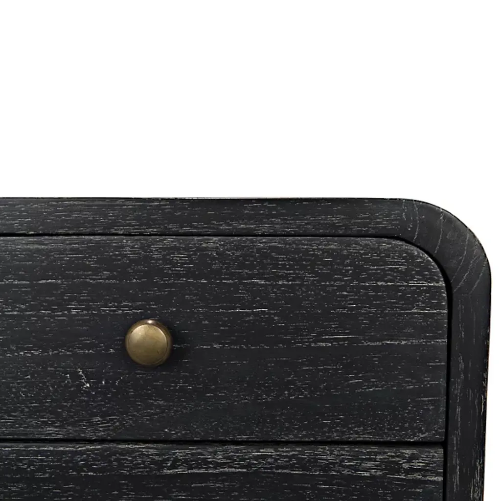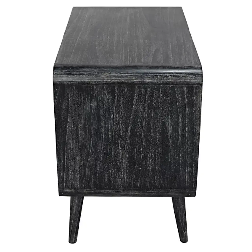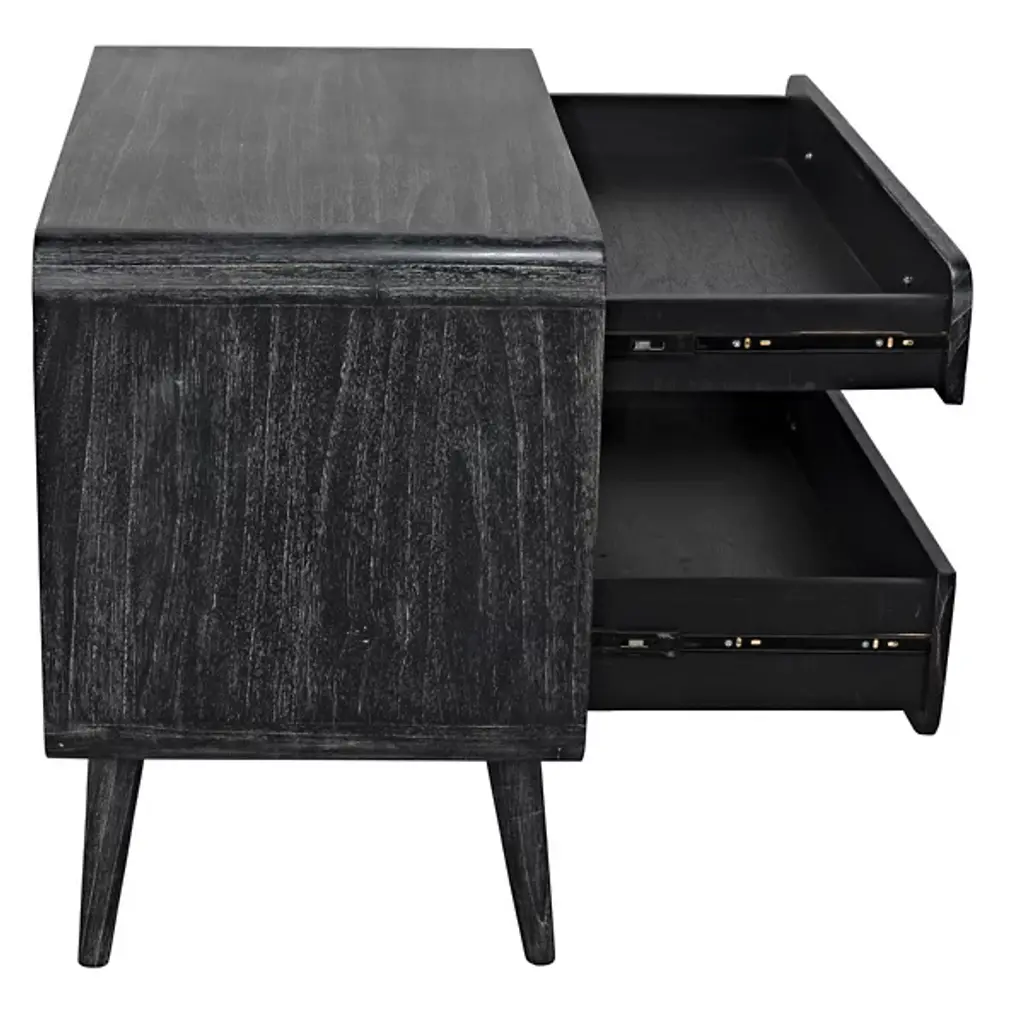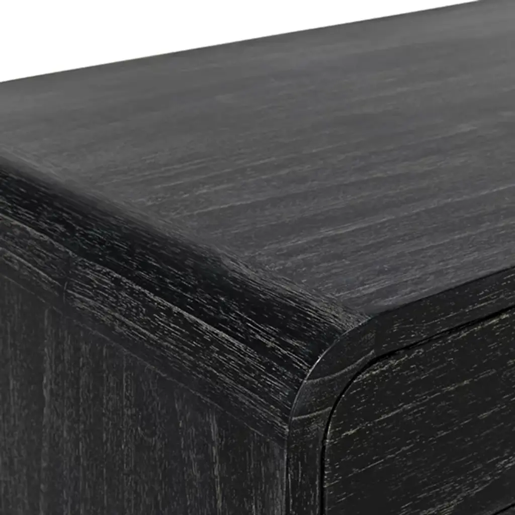 The Bart Chest from Noir curves at every edge, softening what would otherwise be a rectangular form. Mindi wood grain runs horizontally across three drawers, creating natural patterning that complements the chest's mid-century lines. Six brass pulls punctuate the front face, providing necessary contrast against the dark finish. The tapered legs angle outward slightly, lifting the body of the piece off the floor and enhancing its buoyant quality. This chest works equally well as bedroom storage or as an unexpected media console in living spaces.