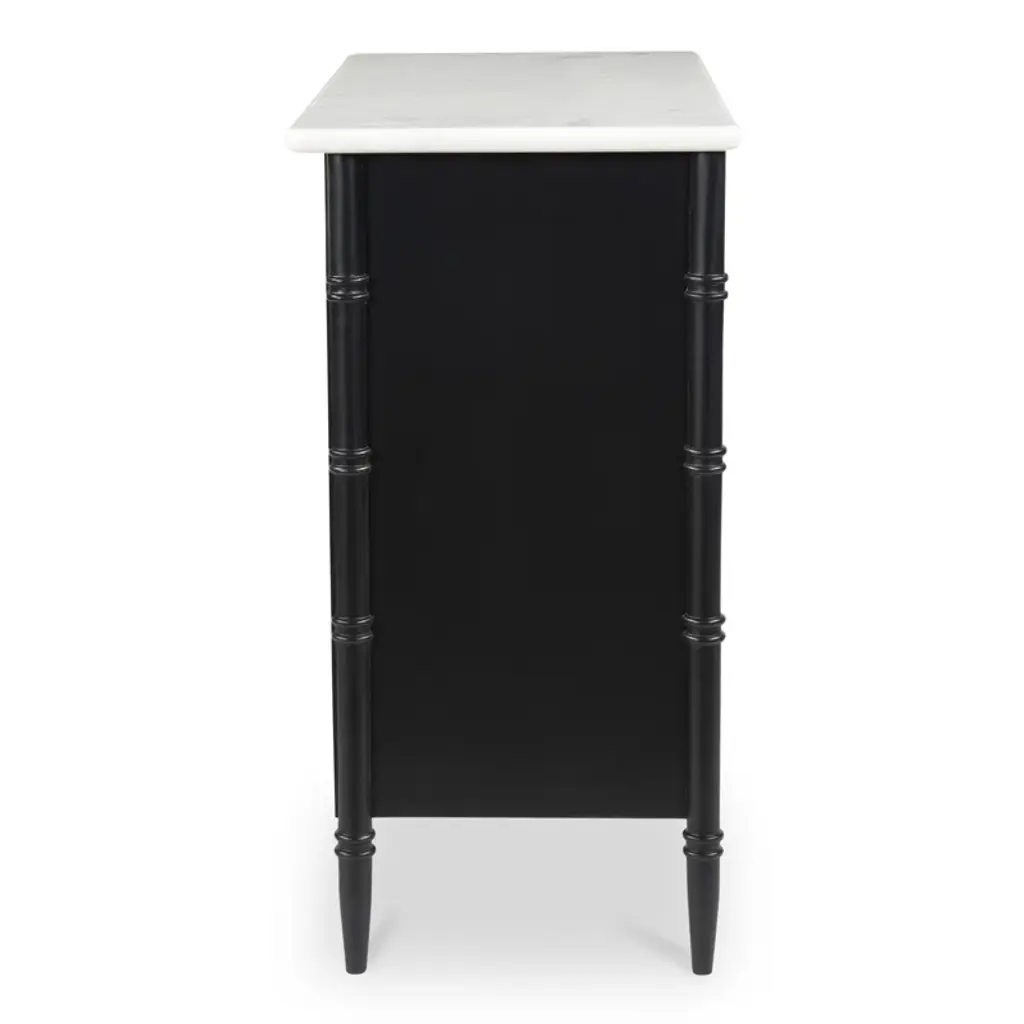 Inspired by the everyday grace of Provence style, the Berlin 5-drawer chest showcases a classically graceful profile with distinctive turned details. Crafted from Mango wood, this piece is crowned with an expressive marble top and finished with solid antique finished brass finish handles, adding a touch of timeless sophistication and natural beauty.