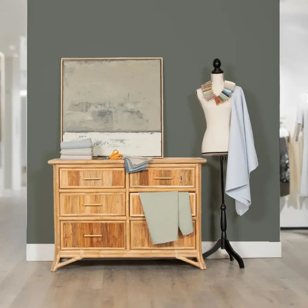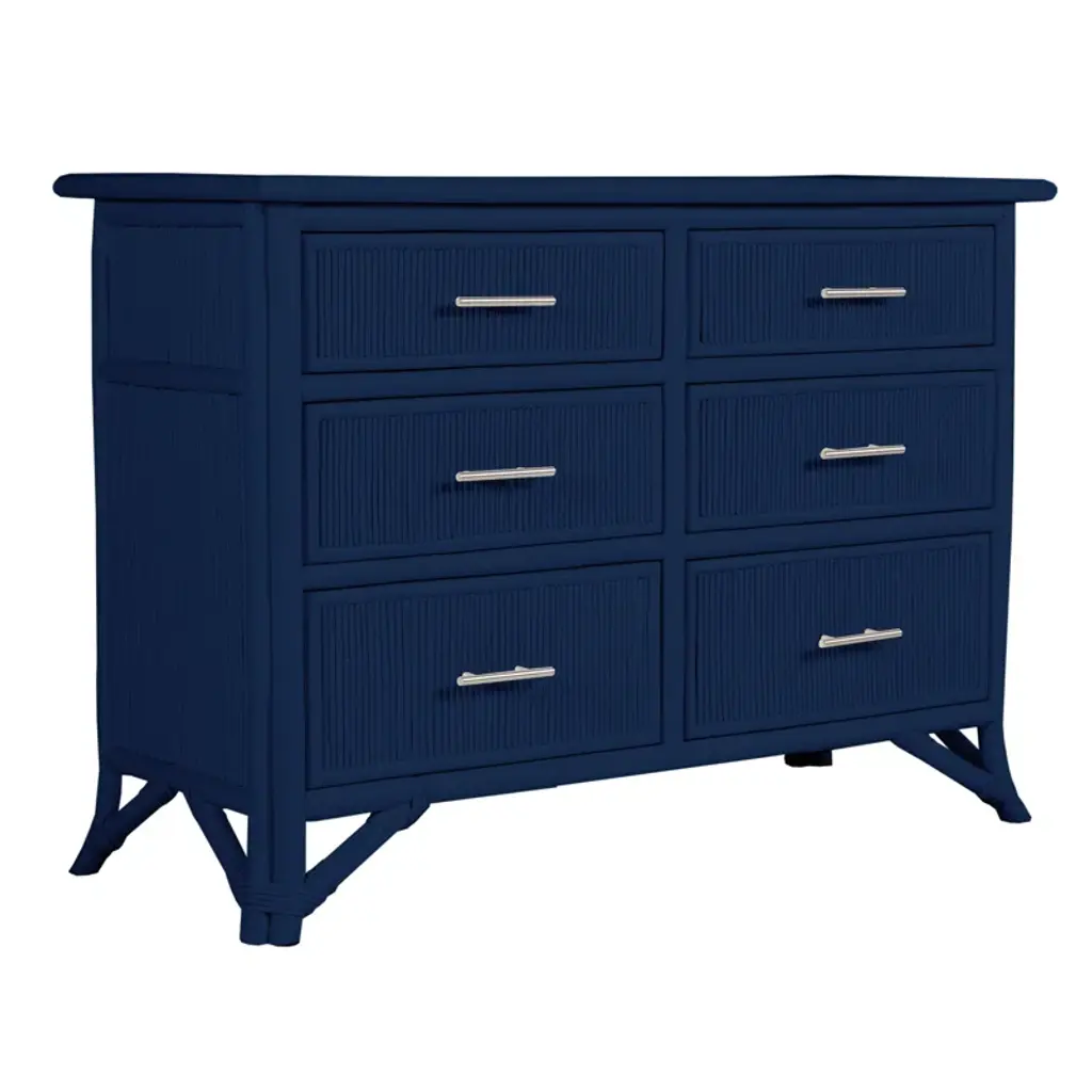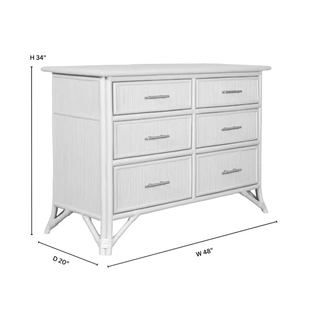 Versatile and highly functional, the Bermuda 6 Drawer 48" W Double Dresser captures the carefree elegance of the coast. Featuring a pencil rattan top, sides, and drawer facings the Bermuda dresser promises to compliment any space. The six-drawers feature wooden drawer glides and brushed silver drawer pulls. The six drawers offer plenty of storage, while the spacious top provides a space for decorative accessories or framed photos. Each David Francis dresser is hand-finished and made to order, please allow time for delivery.