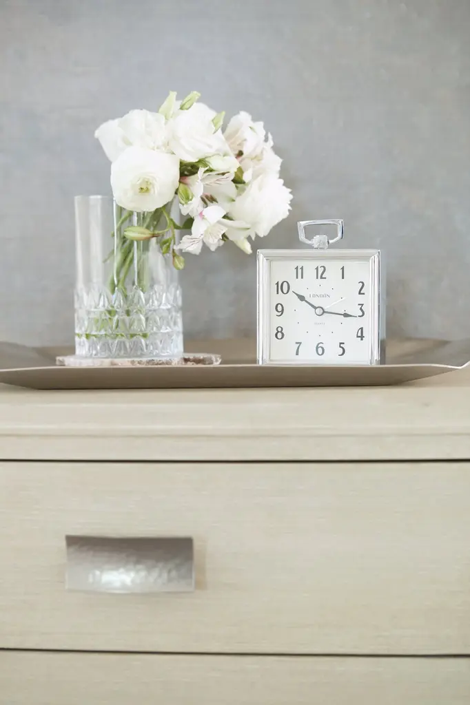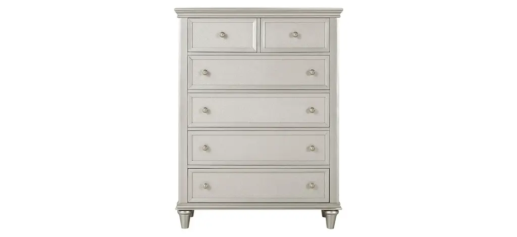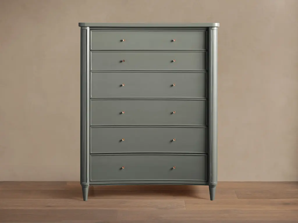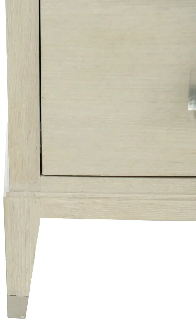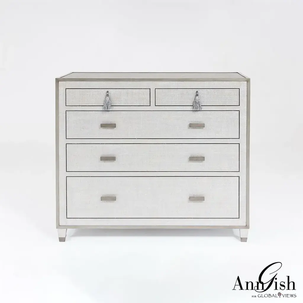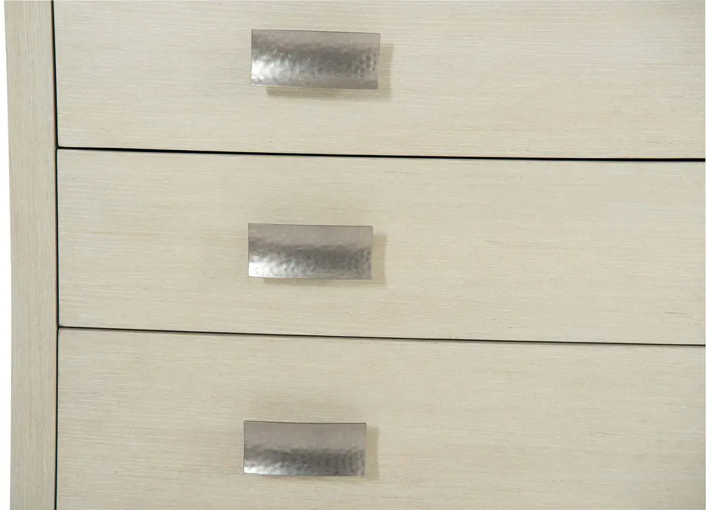 Discover the subtle elegance of the Bernhardt East Hampton Tall Chest, which would look great in any refined living area. With a Cerused Linen finish that highlights the stunning linear wood grain of its quartered ash veneers, this tall chest is the result of painstaking attention to detail. The East Hampton Tall Chest's delicate proportions and beautiful lines accentuate its minimalist design, giving it a modest yet sophisticated presence. The hardware, which has a soft, concave shape and is made of die-cast nickel-plated zinc with an aged silver finish, gives the item a subtle sheen and a hint of texture. The chest's elegant appearance is enhanced with metal ferrules and wood beading, which further highlight the careful design. With its flawless combination of design and utility, the East Hampton Tall Chest is a classic piece that will look great in both modern and traditional settings. This tall chest is a statement item that radiates serene luxury in addition to being a useful storage solution. The East Hampton Tall Chest will last for many years as a treasured addition to your furniture collection thanks to the clever design components and premium materials.