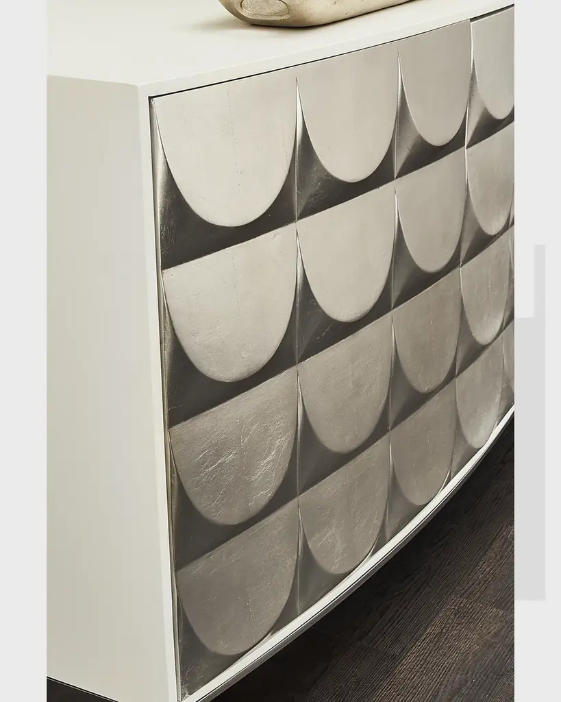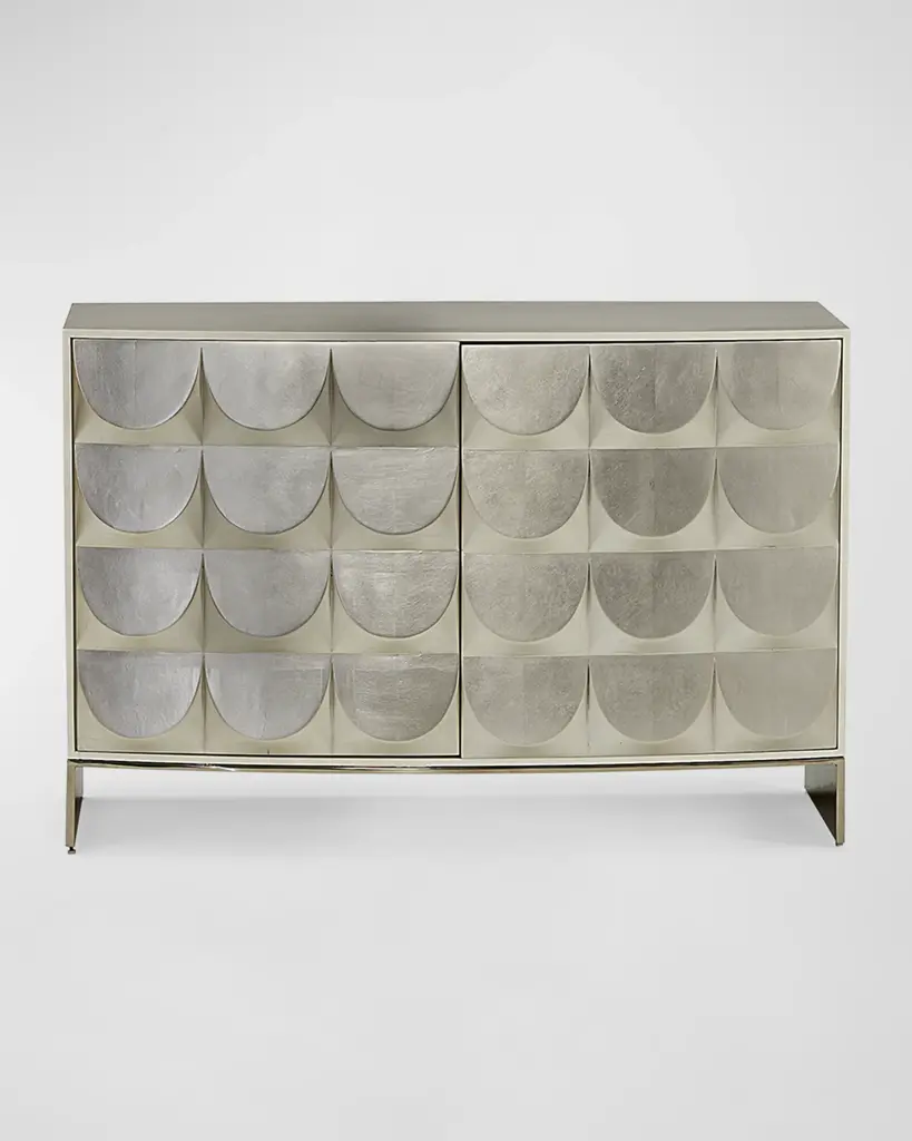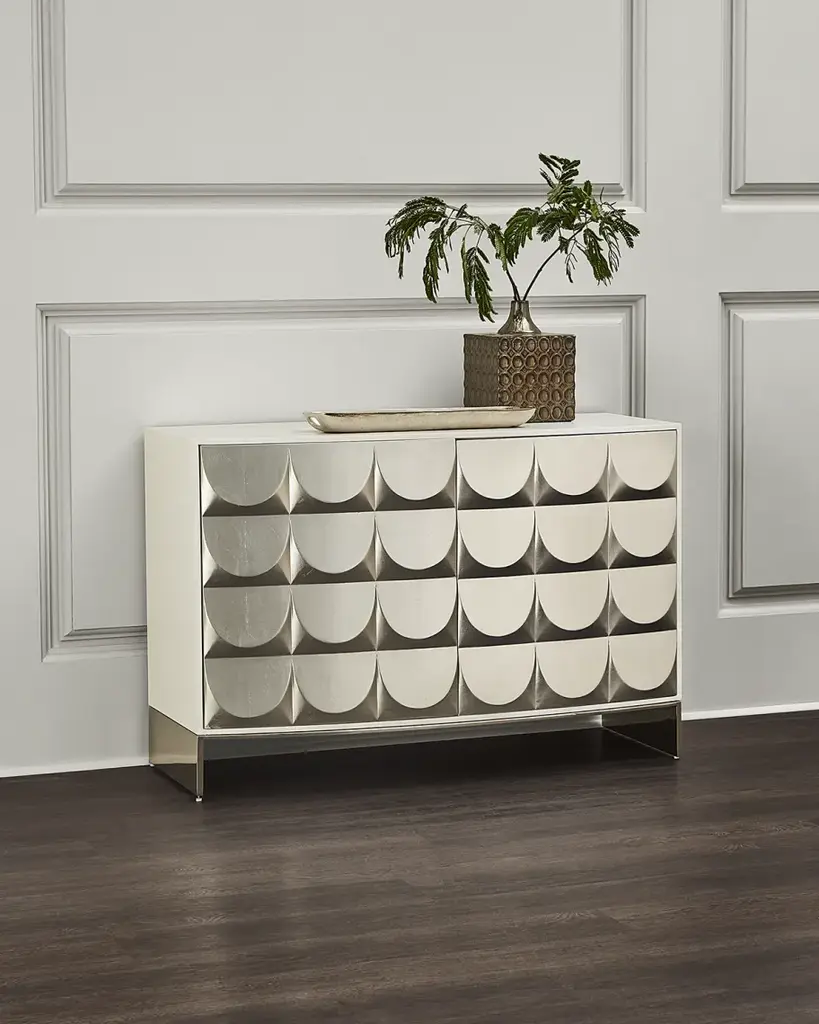 The Calliope 2-Door Chest is inspired by art deco design with its scalloped cast resin overlays in silver leaf finish. The case has a white plaster finish, a white-painted interior, and a polished stainless steel base. Handcrafted of engineered hardwood, stainless steel, maple veneers, and cast resin White plaster finish on wood case with white-painted interior Dimensional, scalloped, cast resin overlays in silver leaf finish on door fronts Two push-to-open doors with concealed, soft-close hinges Four adjustable/removable shelves inside Polished stainless steel base with end panels to the floor Adjustable glides Includes anti-tip kit and instruction sheet Not suitable for use with TV or other media Overall, approx. 48"W x 20"D x 32"T Includes hardware Weight, 230.0 lbs Imported Boxed weight, approximately 242.0 lbs Shipping Direct from Vendor, usually ships within 30 business days. About Bernhardt: Founded in 1889 by American pioneer John Mathias Bernhardt, Bernhardt Furniture Company, Inc., is located in the foothills of western North Carolina. After the turn of the century, the company expanded its product line from the dining room into the bedroom, and managed to deliver furniture in spite of severe labor and materials shortages during both world wars. Today, Bernhardt is one of the largest family-owned and -operated marketers of fine wood and upholstered furniture in the United States.