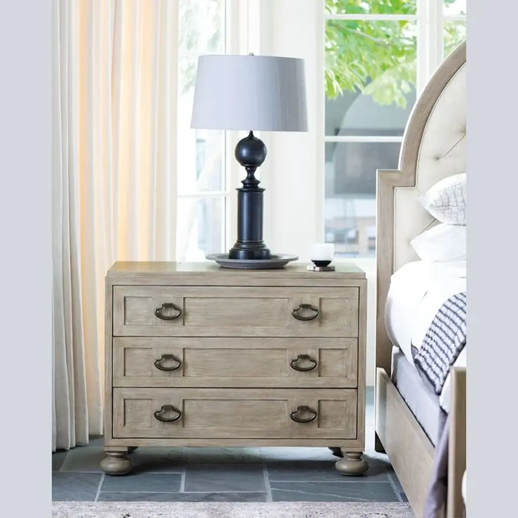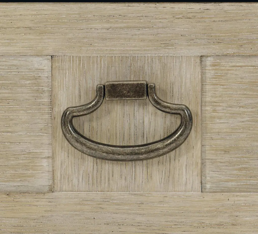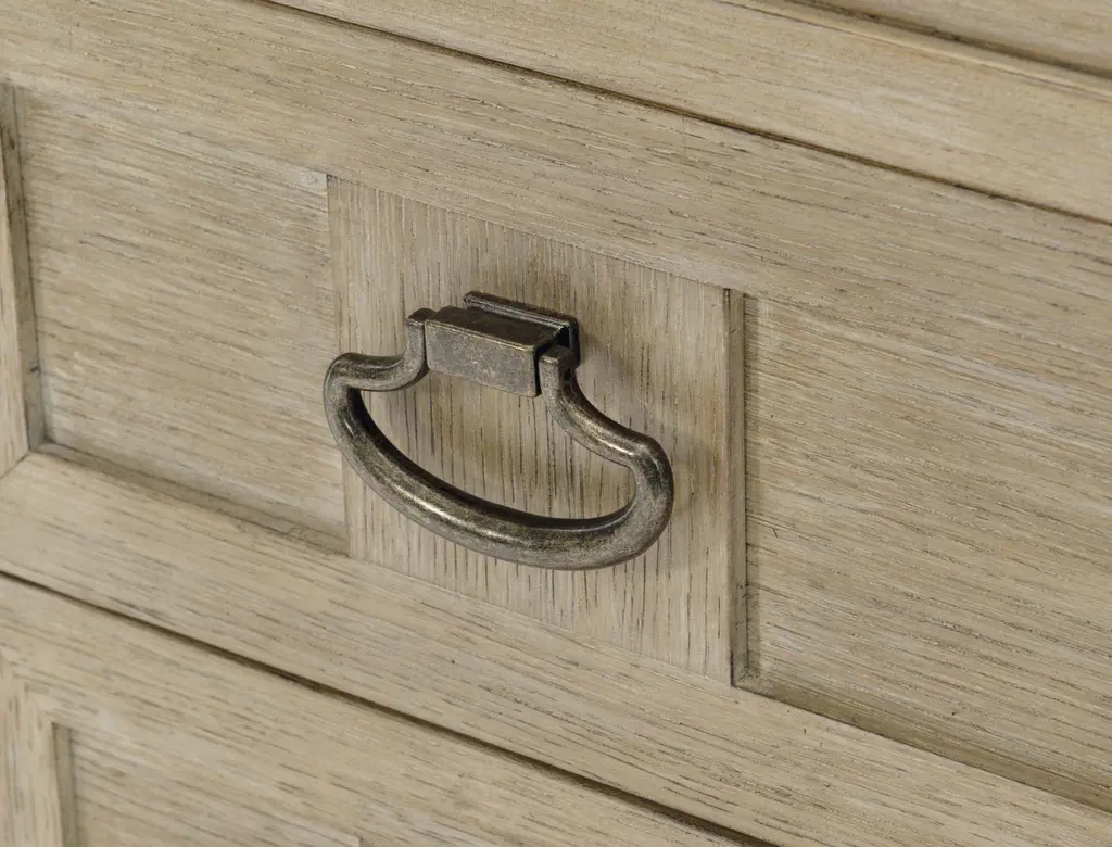 Discover how to combine modern design elements with classic elegance in the Bernhardt Santa Barbara Bachelor's Chest. This stunning item, which features wire-brushed, cerused oak veneers with delicate textures and hints of color inside the grain, is inspired by the laid-back vibe of California. The light and airy appearance of the Sandstone finish is wonderfully contrasted with the old appeal of the vintage nickel-tinted steel ring pulls. This bachelor's chest, which has three roomy drawers with elaborate overlays and is expertly crafted, will hold plenty of space for your belongings. The chest's classic beauty is further enhanced by the turned-bun feet, and its adjustable glides provide stability on any surface. An anti-tip kit is supplied for enhanced safety, providing comfort in any household environment.