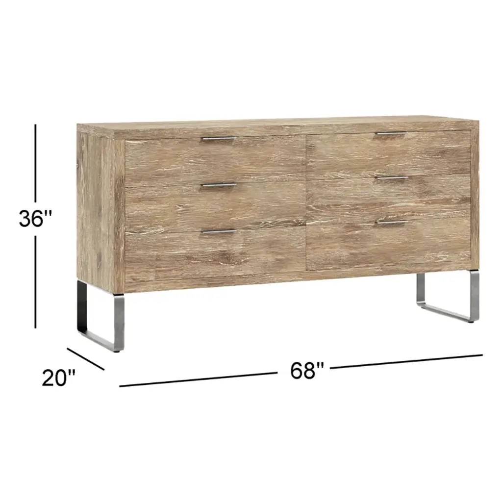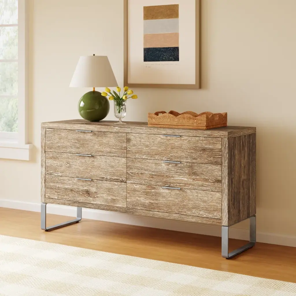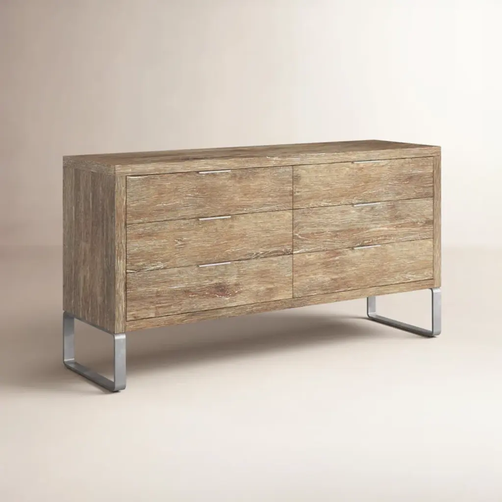 The Tribeca dresser pares traditional design to simpler lines and stunning rustic style. The details of natural wood are highlighted by the finish. Each of the six drawers has a textured metal pull tab in the finish, which is also reflected in the structural metal base.
