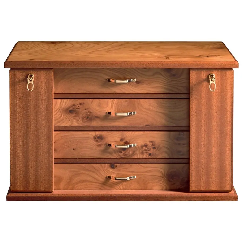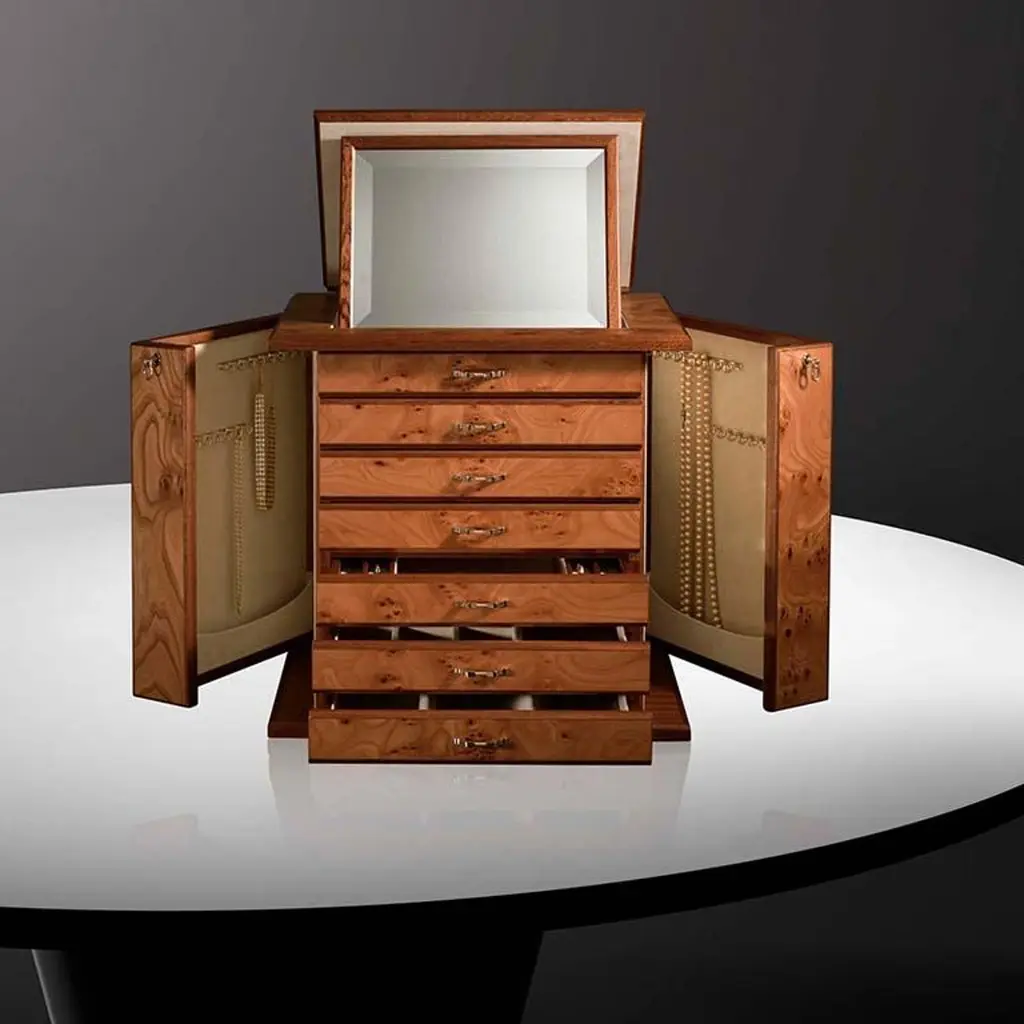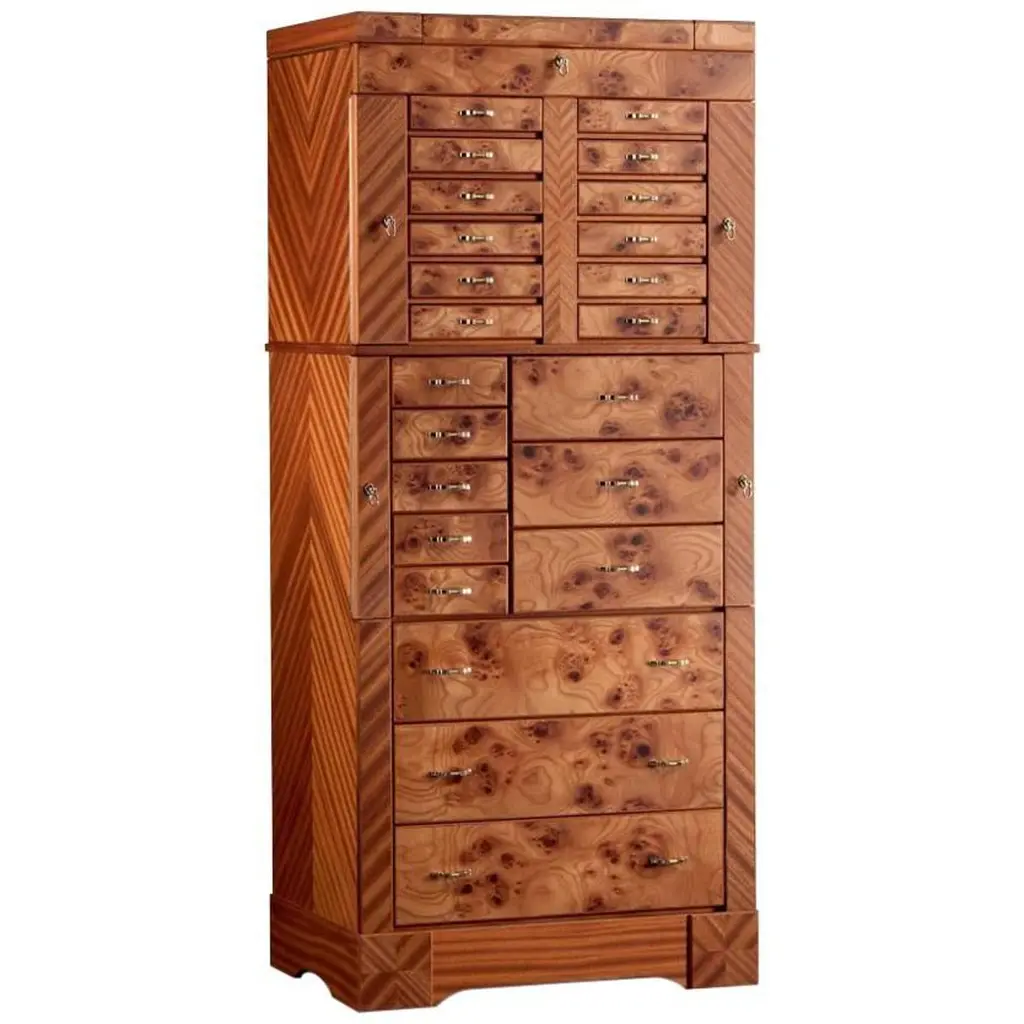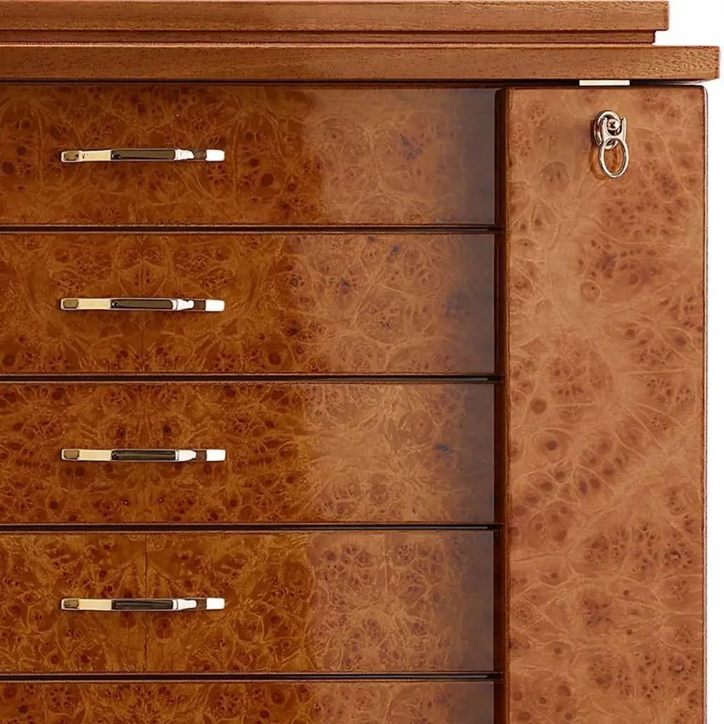 Jewelry chest in briar and mahogany, matte finish, ultrasuede lining, 24 karats gold plated brass accessories. With necklace bars, lockable doors and 6 drawers. Adjustable mirror on top part.