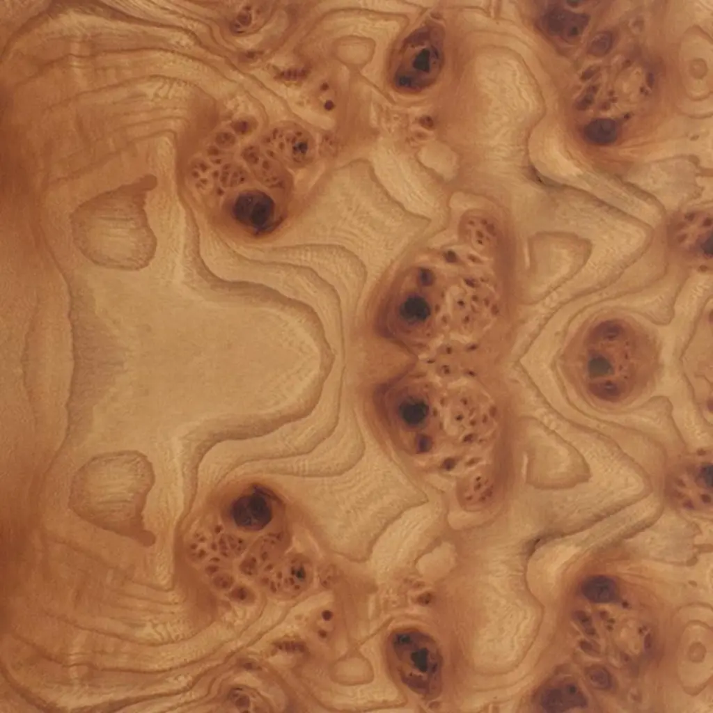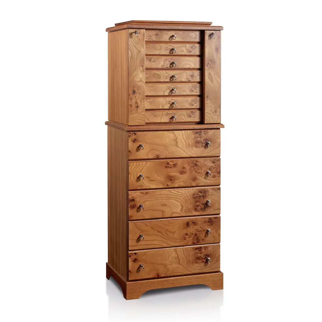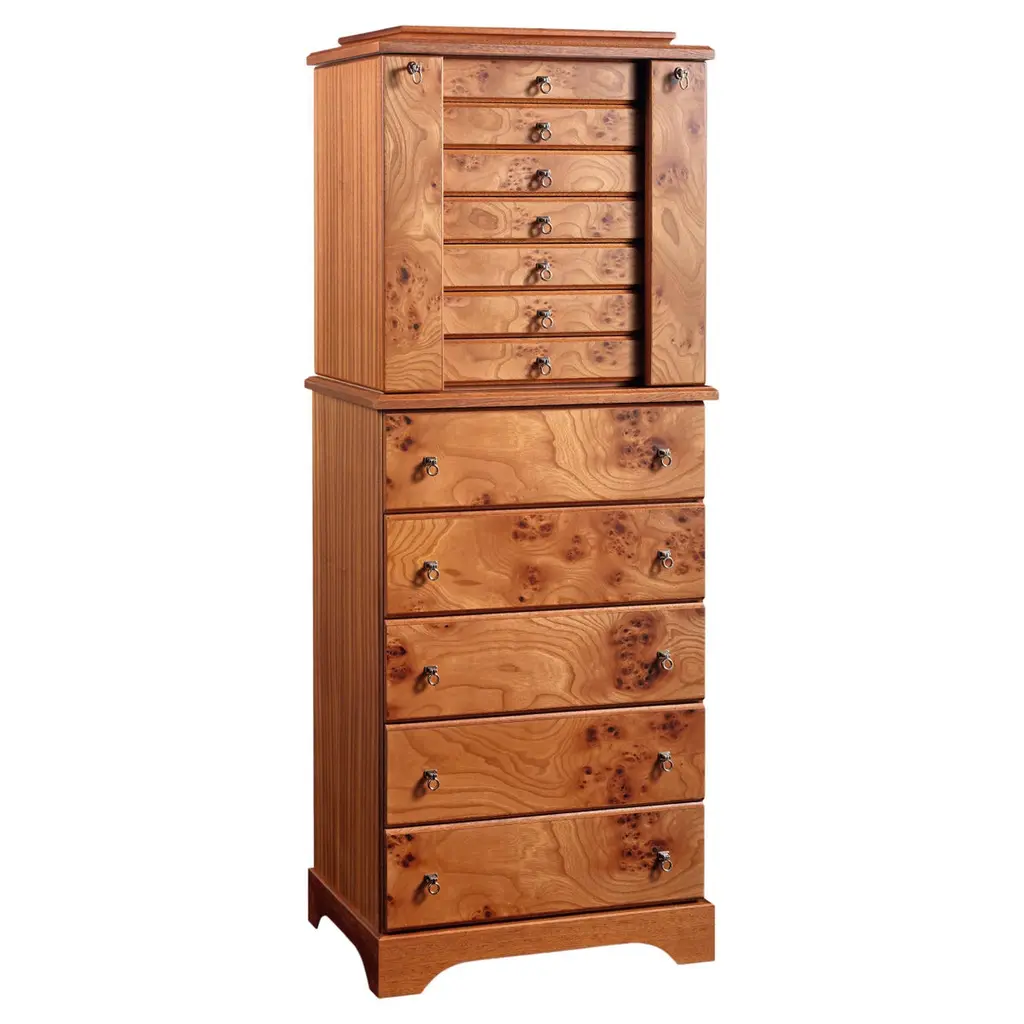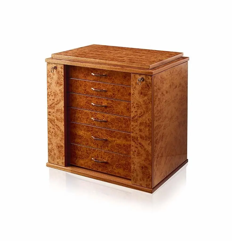 Jewelry chest in briar and mahogany, matte finish, ultrasuede lining, 24 karats gold plated brass accessories. With necklace bars, lockable doors and 6 drawers. Adjustable mirror on top part.