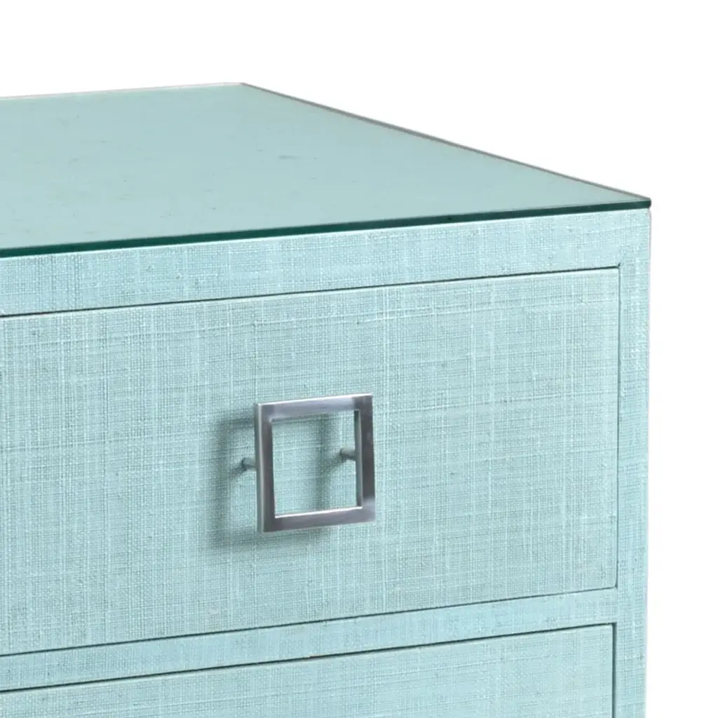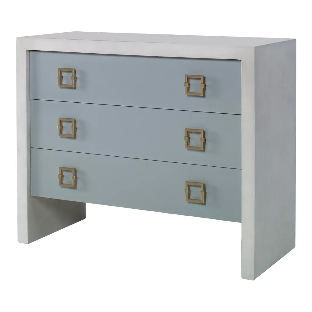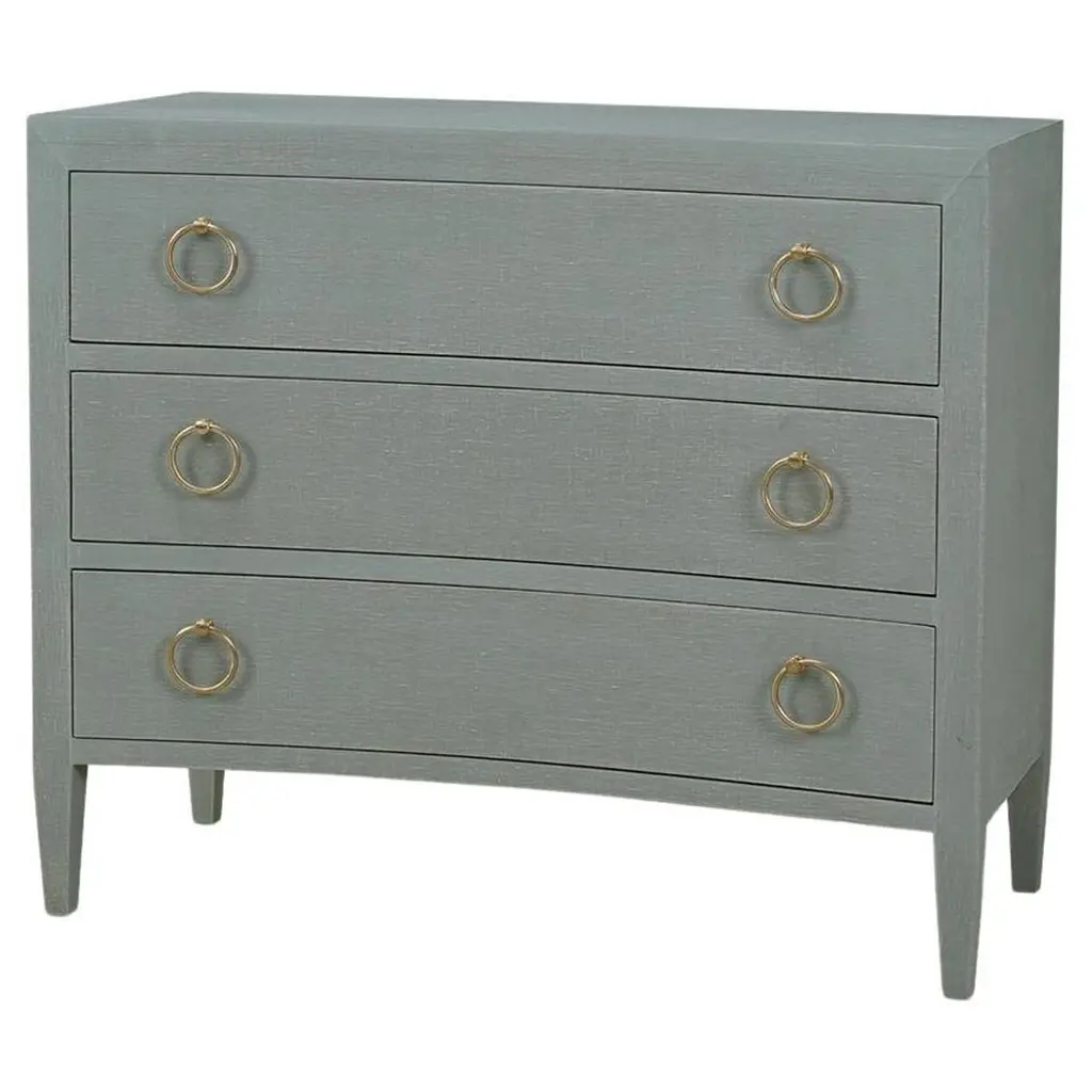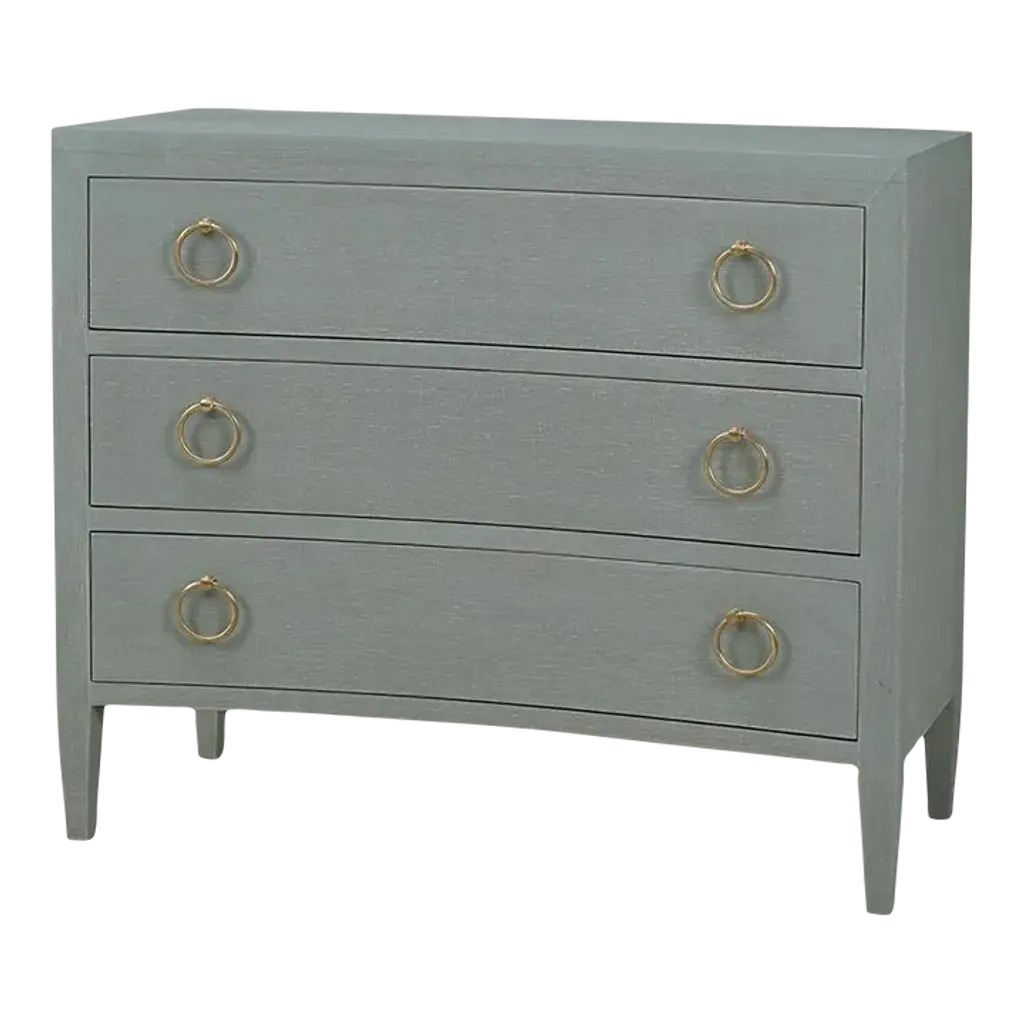 Curved front chest with three drawers-textured linen with satin brass ring hardware.