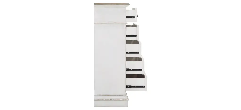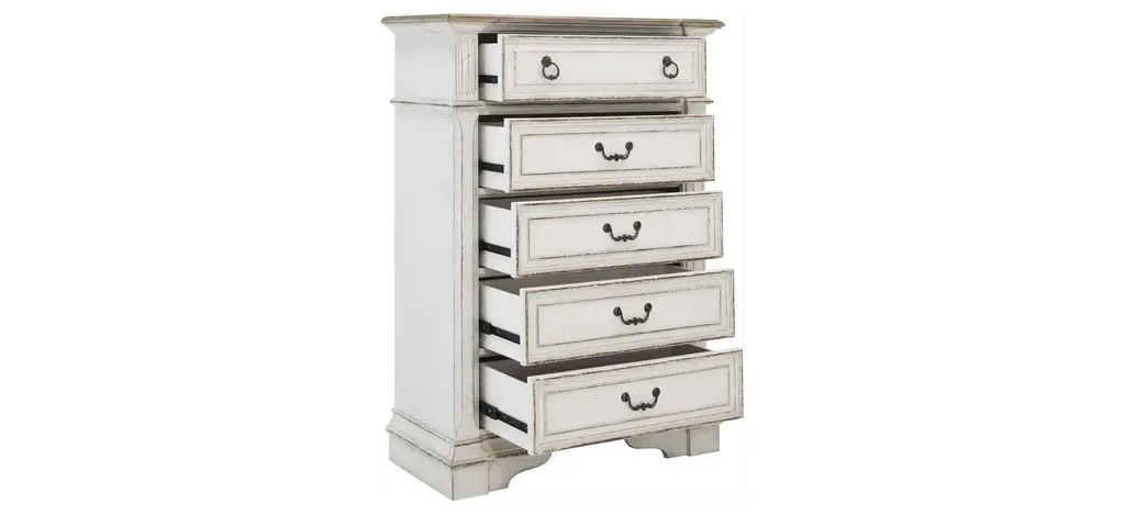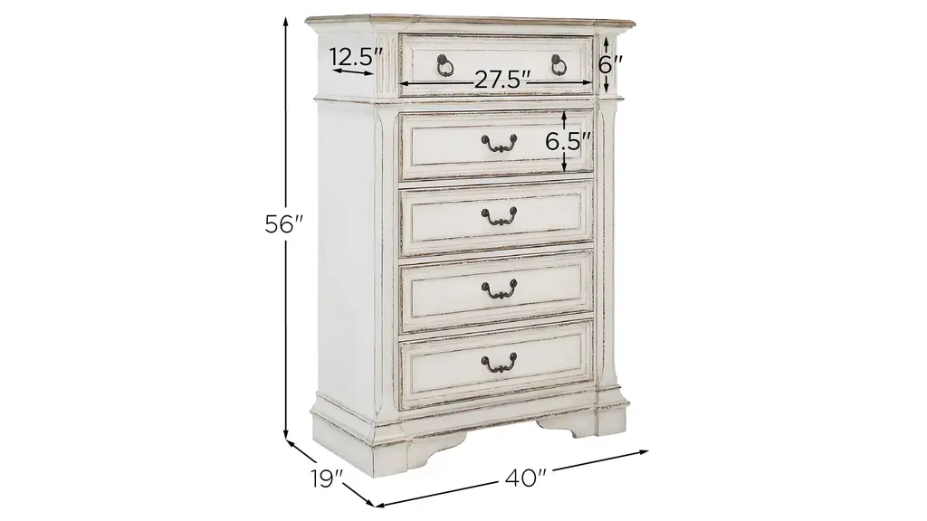 Traditional elements get a fresh new face with the Birmingham 5 drawer chest. Beautiful antique drawer pulls fasented onto a white distressed finish creates a chic yet rustic vibe. Plus, with five drawers you'll always have plenty of space.