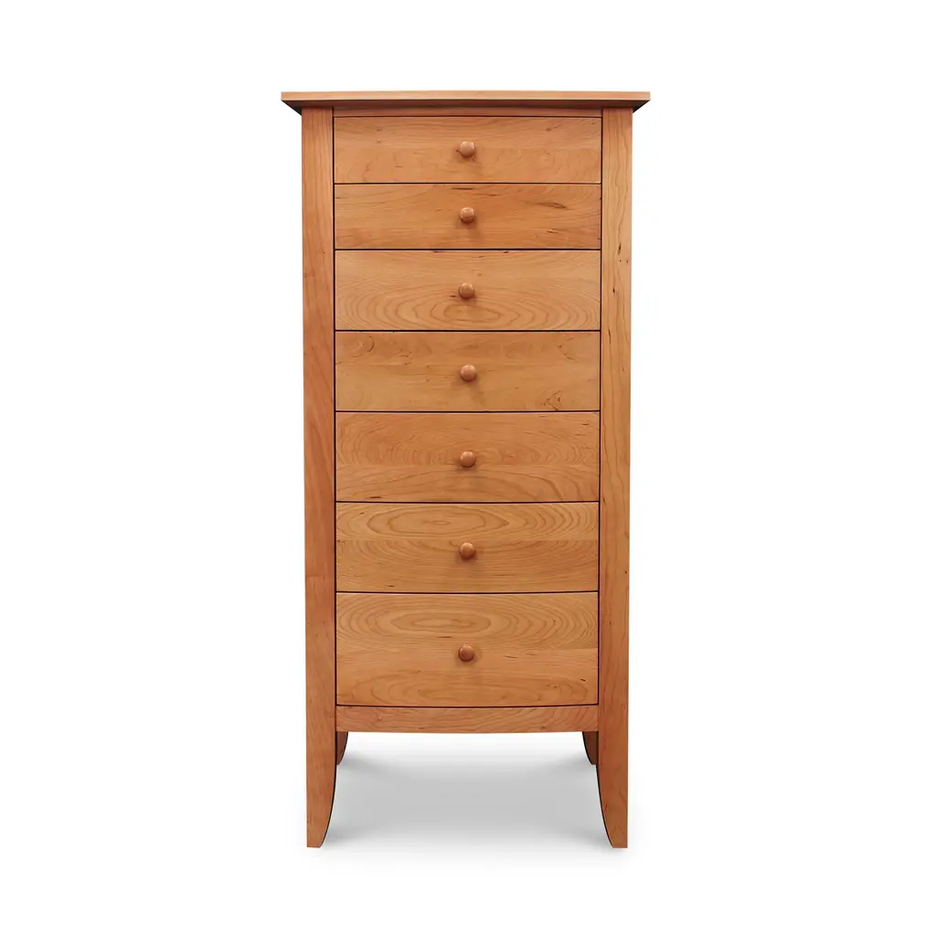 This designer Bow-Front Lingerie Chest is a great space saving bedroom piece with its 7-drawer configuration. Handmade from sustainably harvested solid hardwoods. Available in natural cherry, maple, oak and walnut. Customize with your choice of wood stains and drawer knobs. This high-quality rounded chest is built to last in your home for generations!Base price represents chest in natural cherryShown in natural cherry Matching furniture available in our Bow-Front Furniture Collection