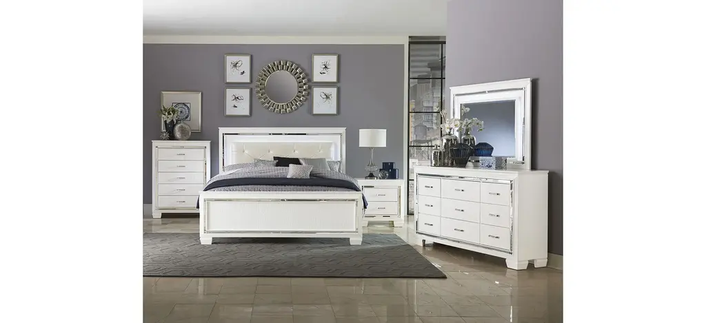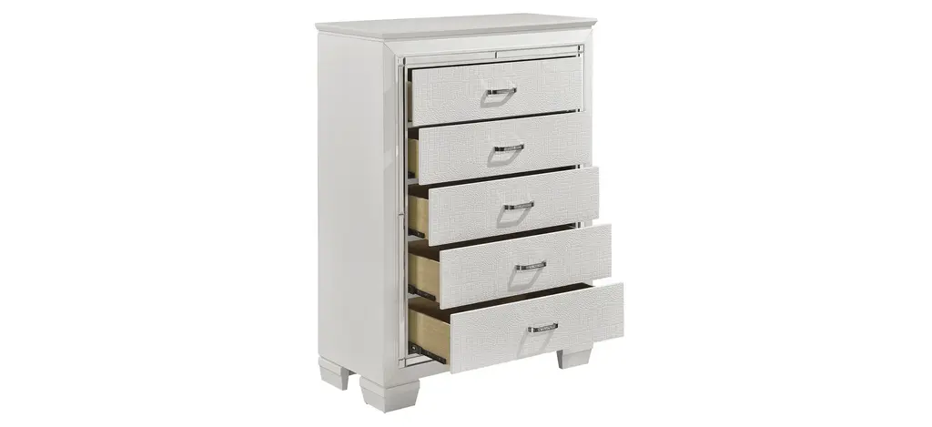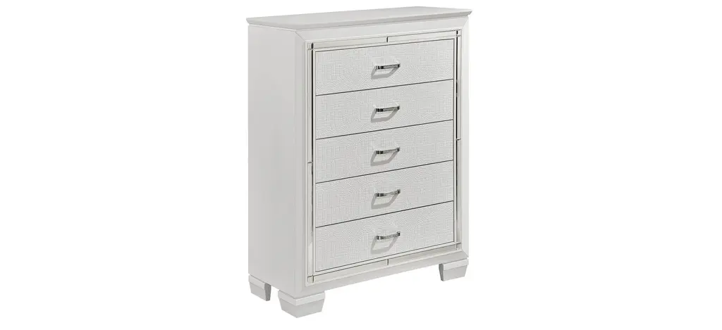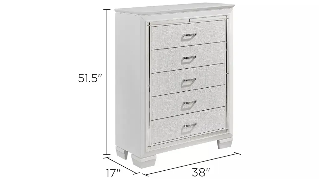 Glamour reigns in the design of the Brambley Chest. Framing the chest is a decorative beveled mirror accent. Alligator embossing and high polished crystal-enhanced hardware boldly accent the white finish.