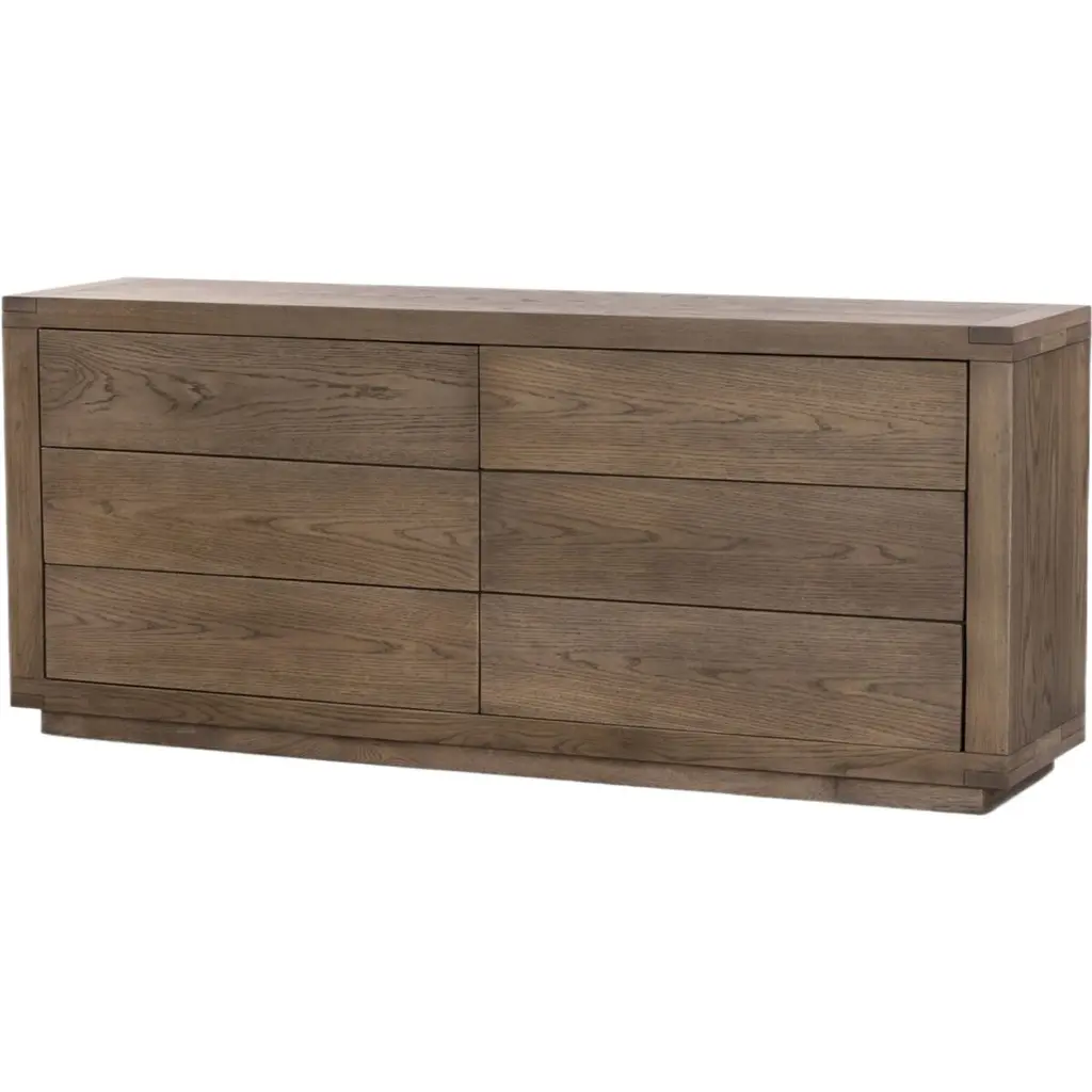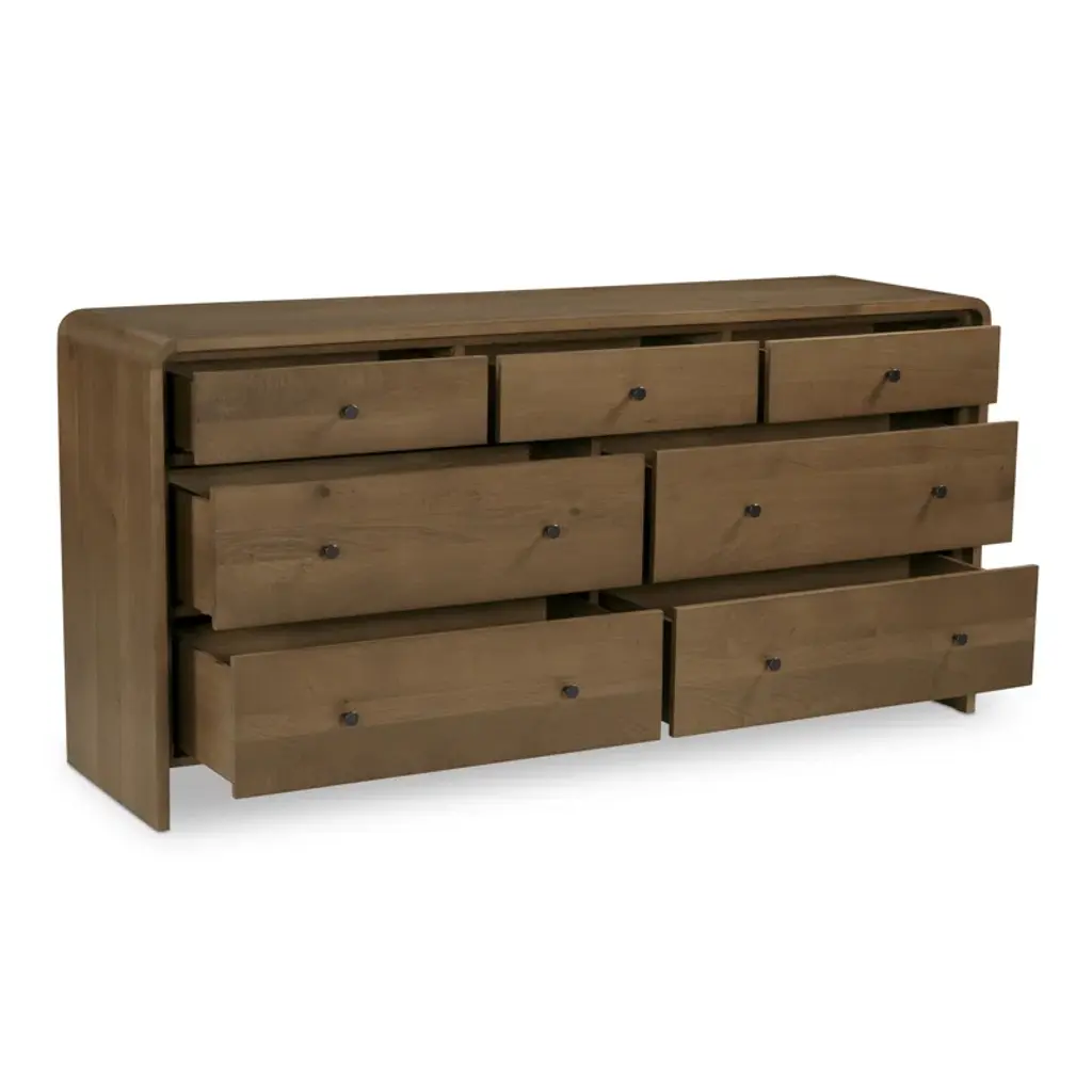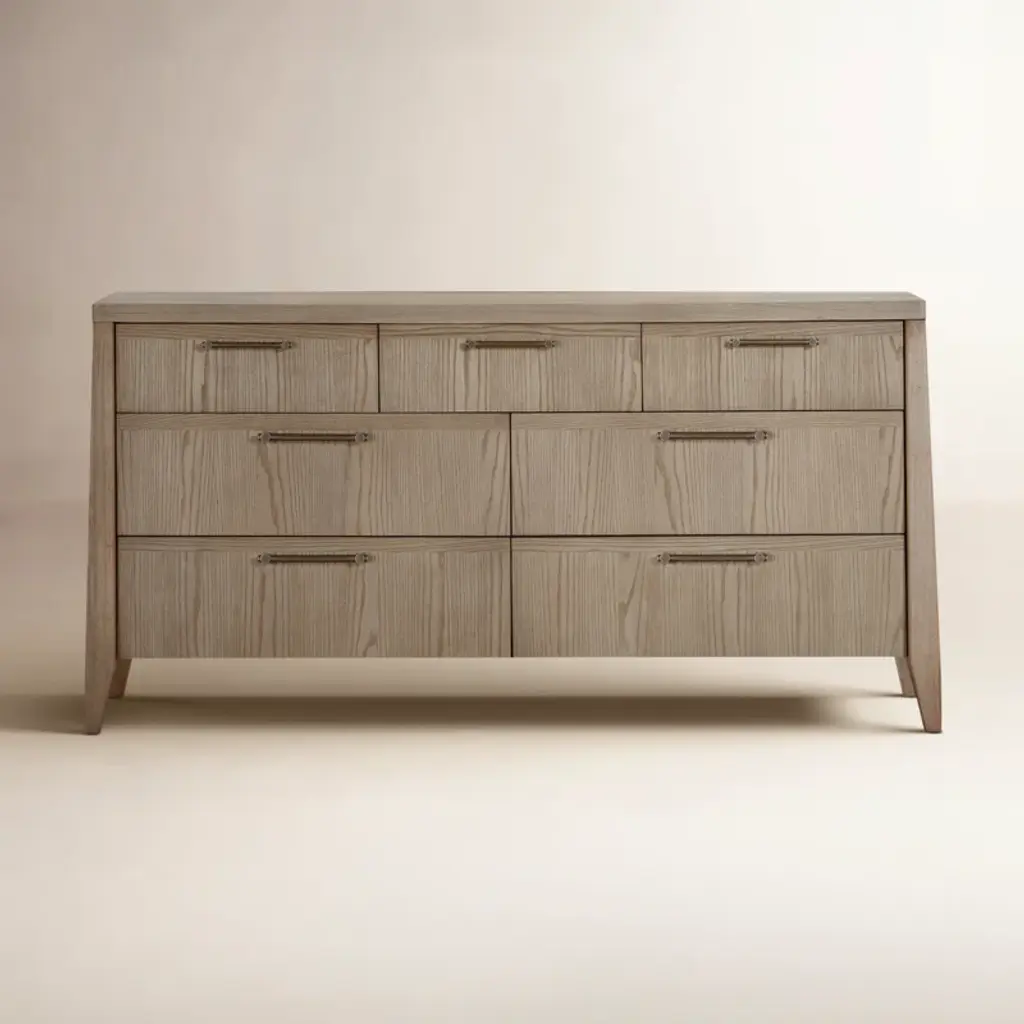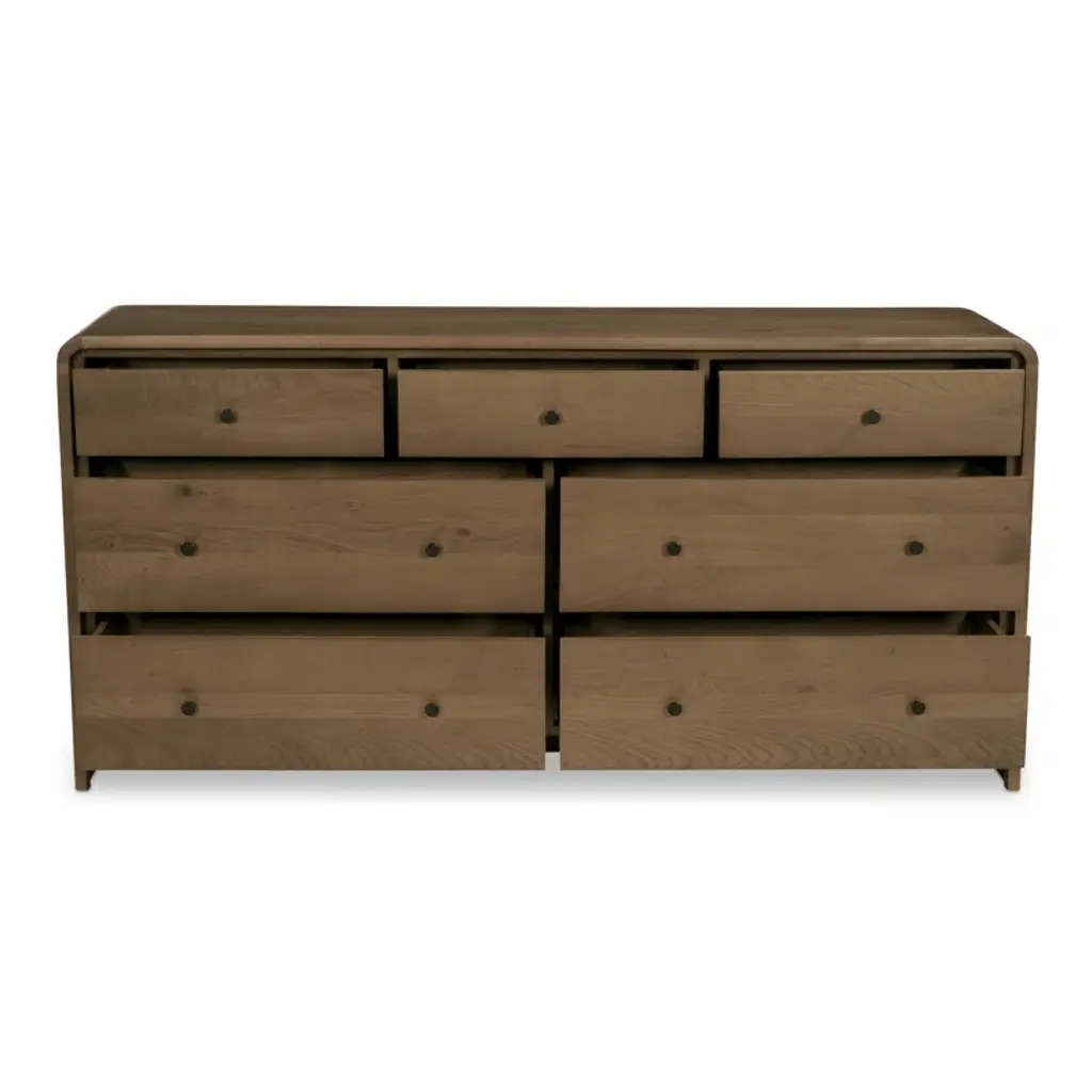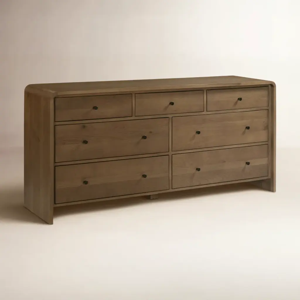 Featuring a unique waterfall edge and overhang detailing, the Branden 7-drawer dresser offers captivating visual interest, underscored by its solid oak construction. The seamless design is a timeless blend of sophistication and practicality, with ample seven-drawer storage.