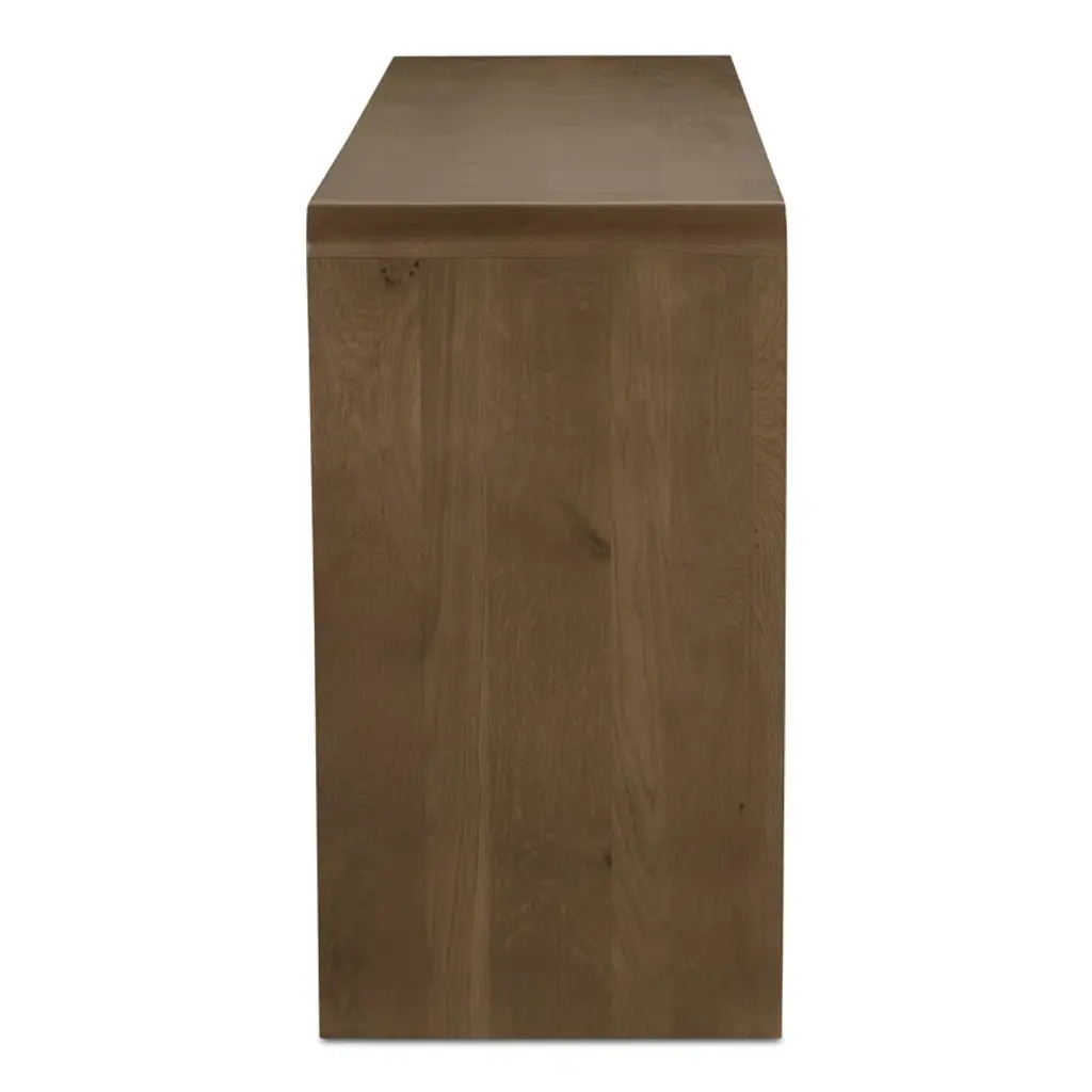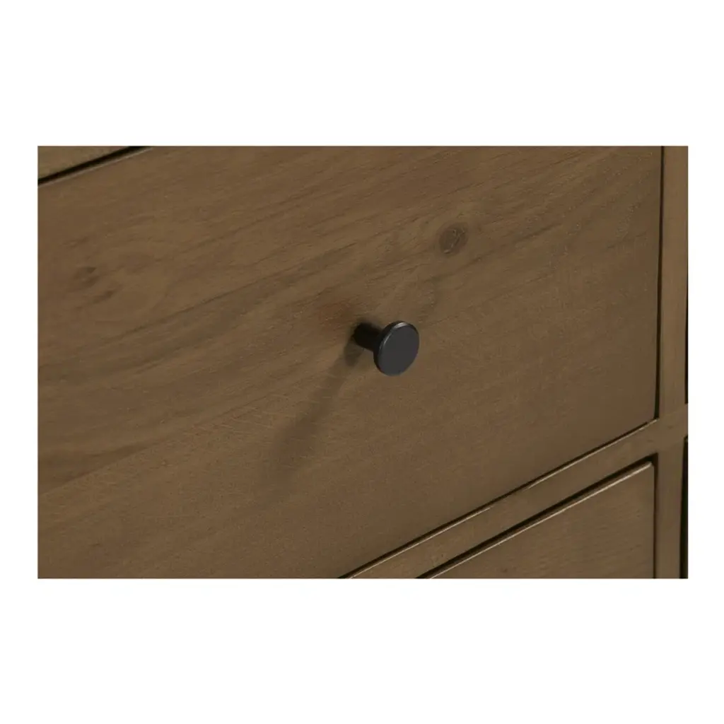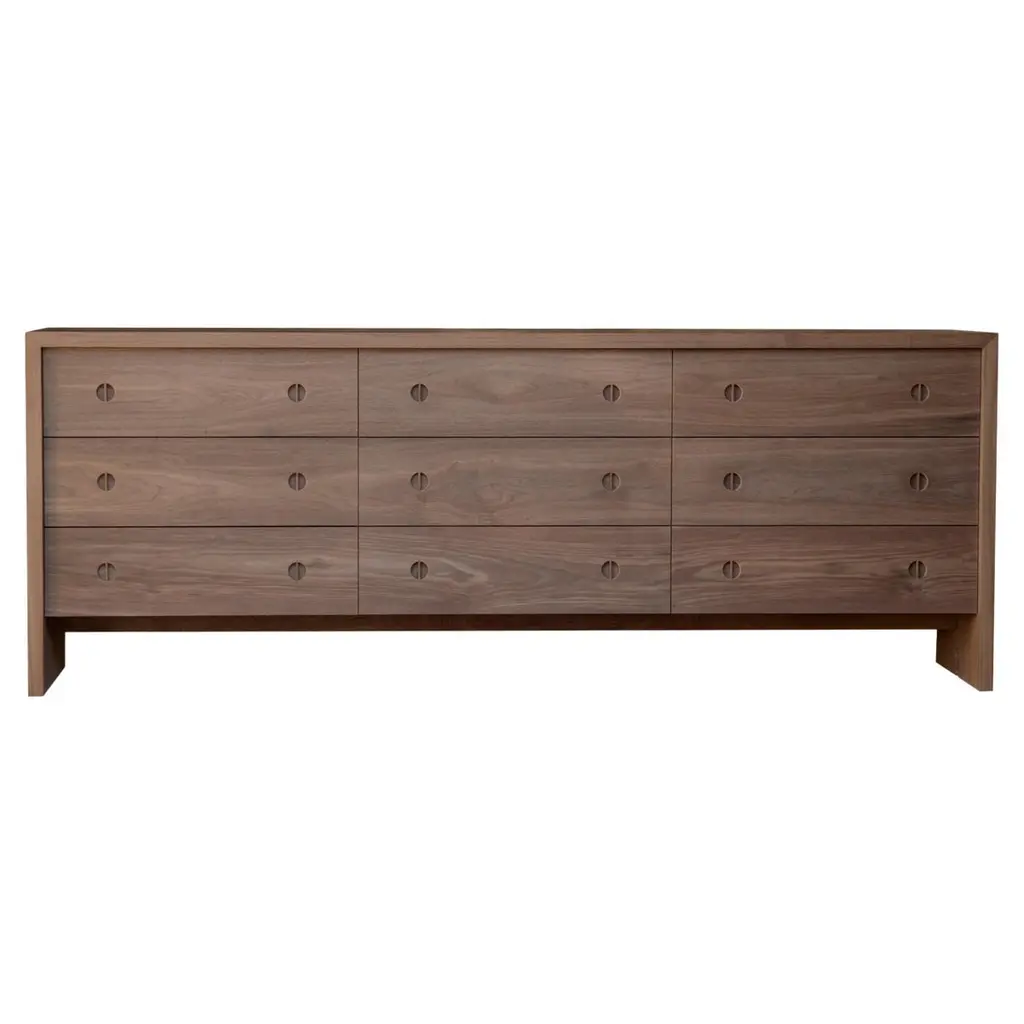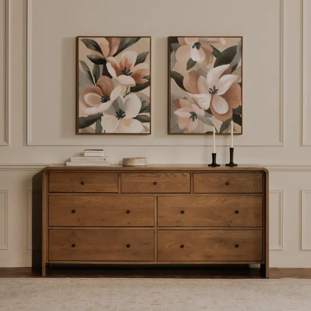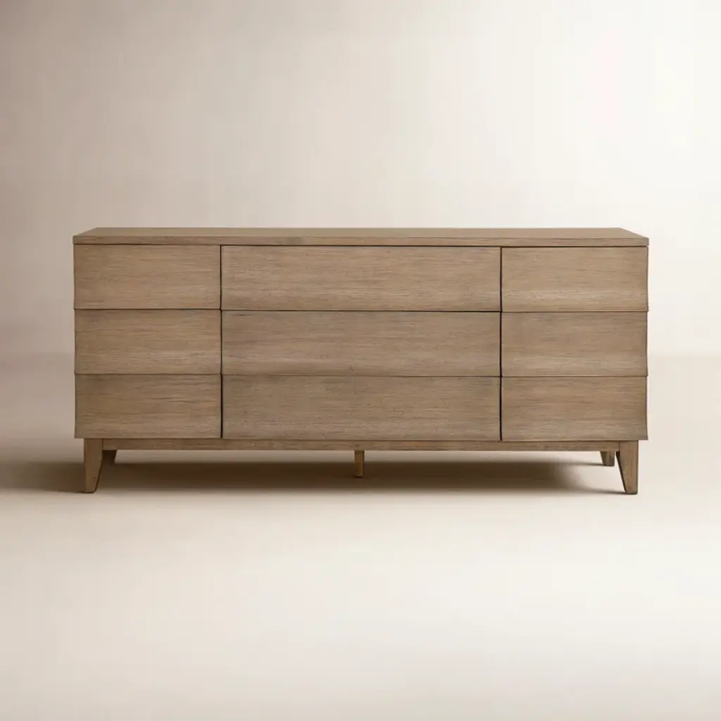 Featuring a unique waterfall edge and overhang detailing, the Branden 7-drawer dresser offers captivating visual interest, underscored by its solid oak construction. The seamless design is a timeless blend of sophistication and practicality, with ample seven-drawer storage.