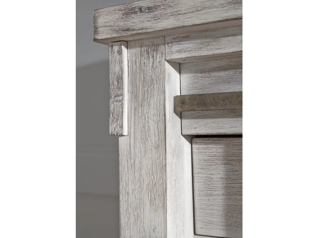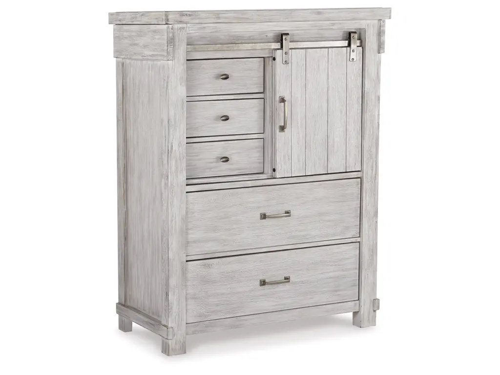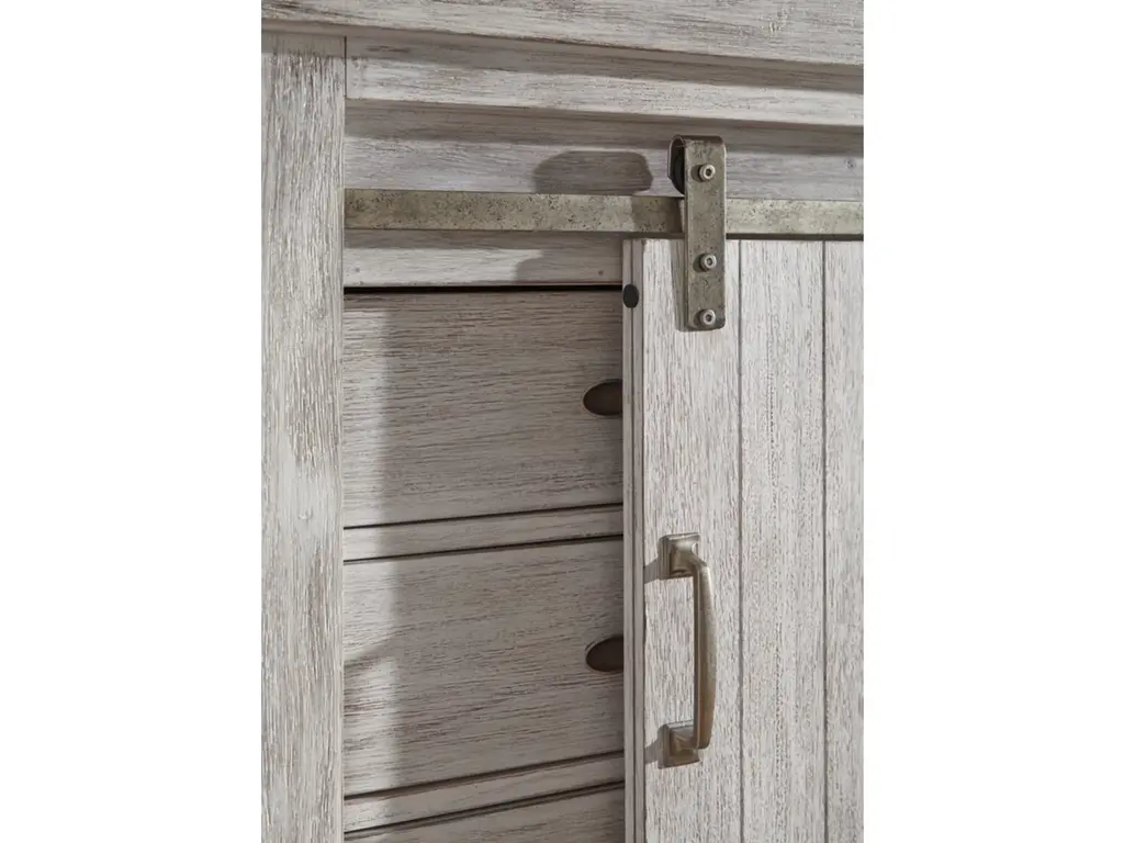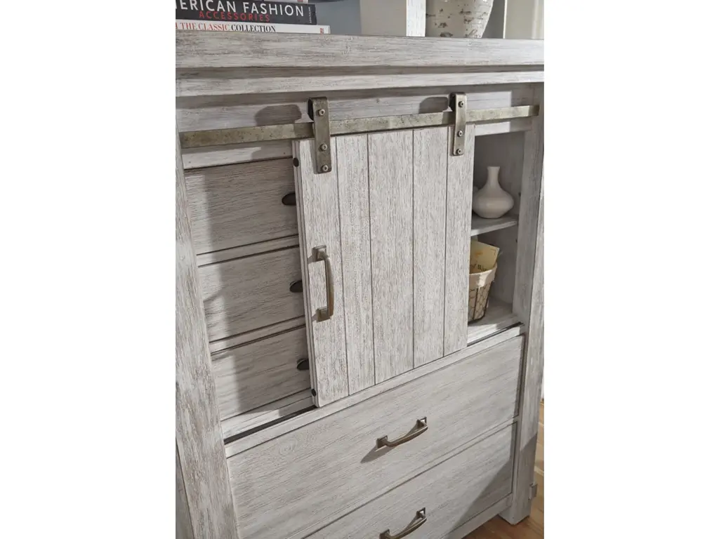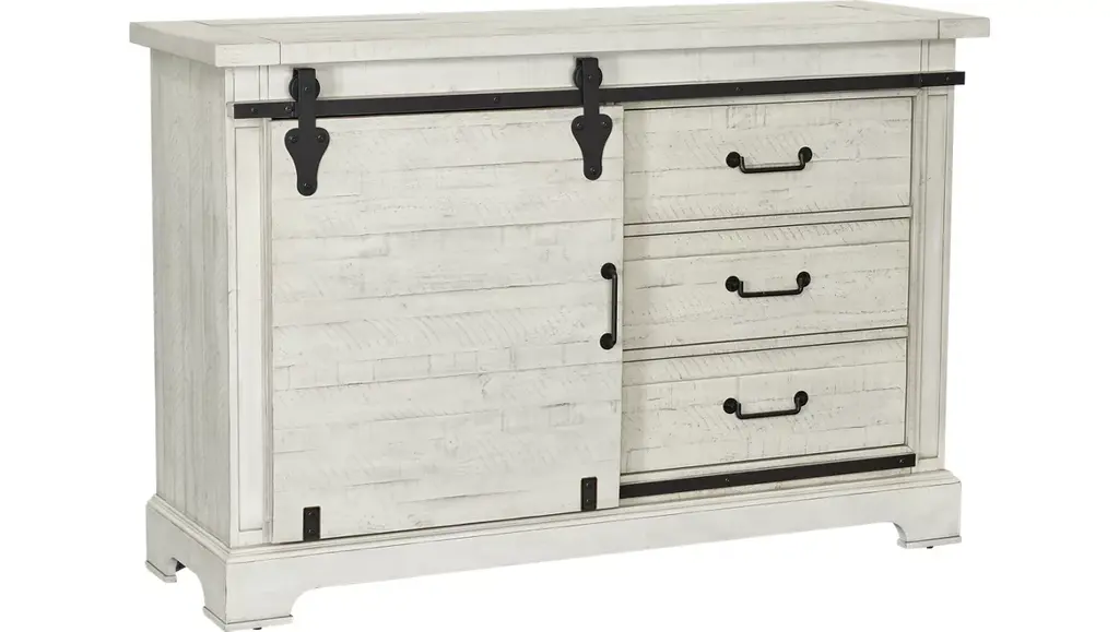 The Brashland chest of drawers brings a fresh twist to the modern farmhouse movement. Its handsome, hearty profile is made all the more interesting with a sliding “barn door” revealing shelved storage. Through-tenon styling incorporates a welcome touch of American craftsman. And the easy on the eyes, distressed white finish? Just the tone for a soothing, serene bedroom retreat.