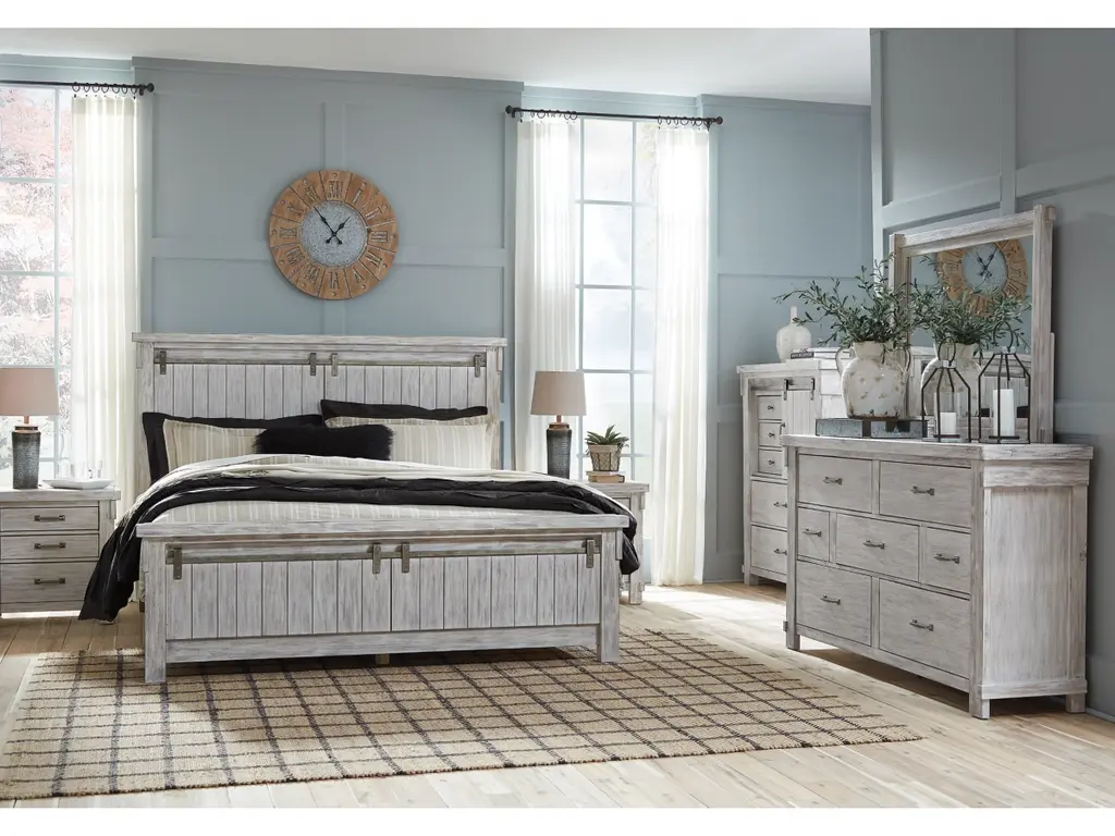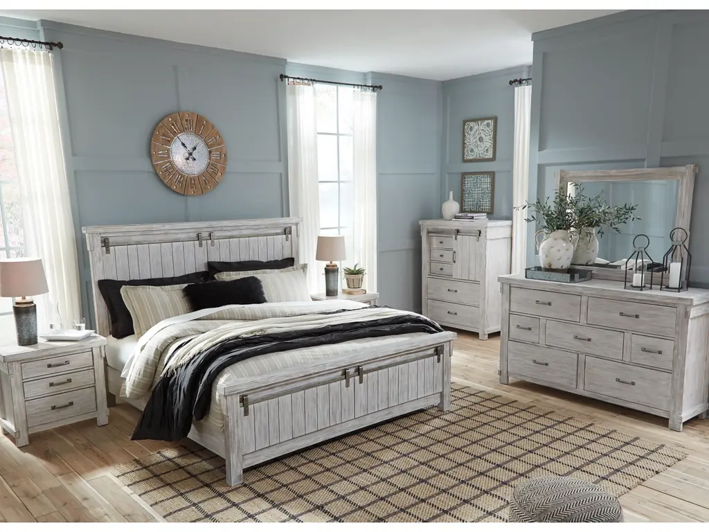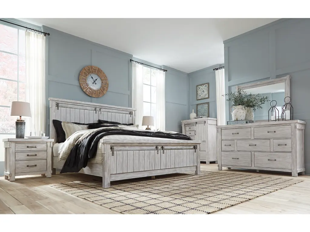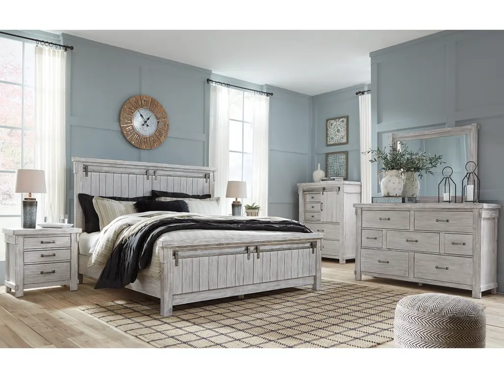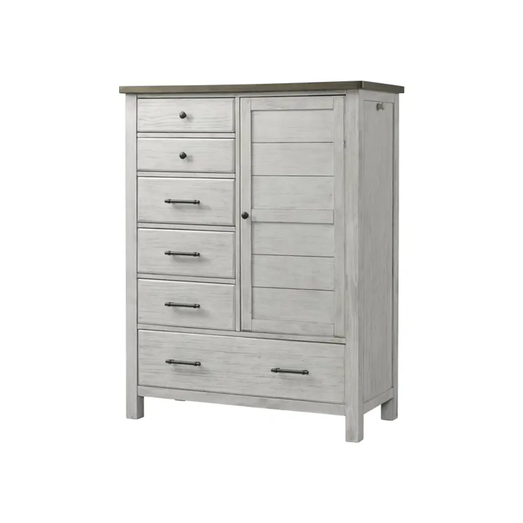 The Brashland chest of drawers brings a fresh twist to the modern farmhouse movement. Its handsome, hearty profile is made all the more interesting with a sliding “barn door” revealing shelved storage. Through-tenon styling incorporates a welcome touch of American craftsman. And the easy on the eyes, distressed white finish? Just the tone for a soothing, serene bedroom retreat.