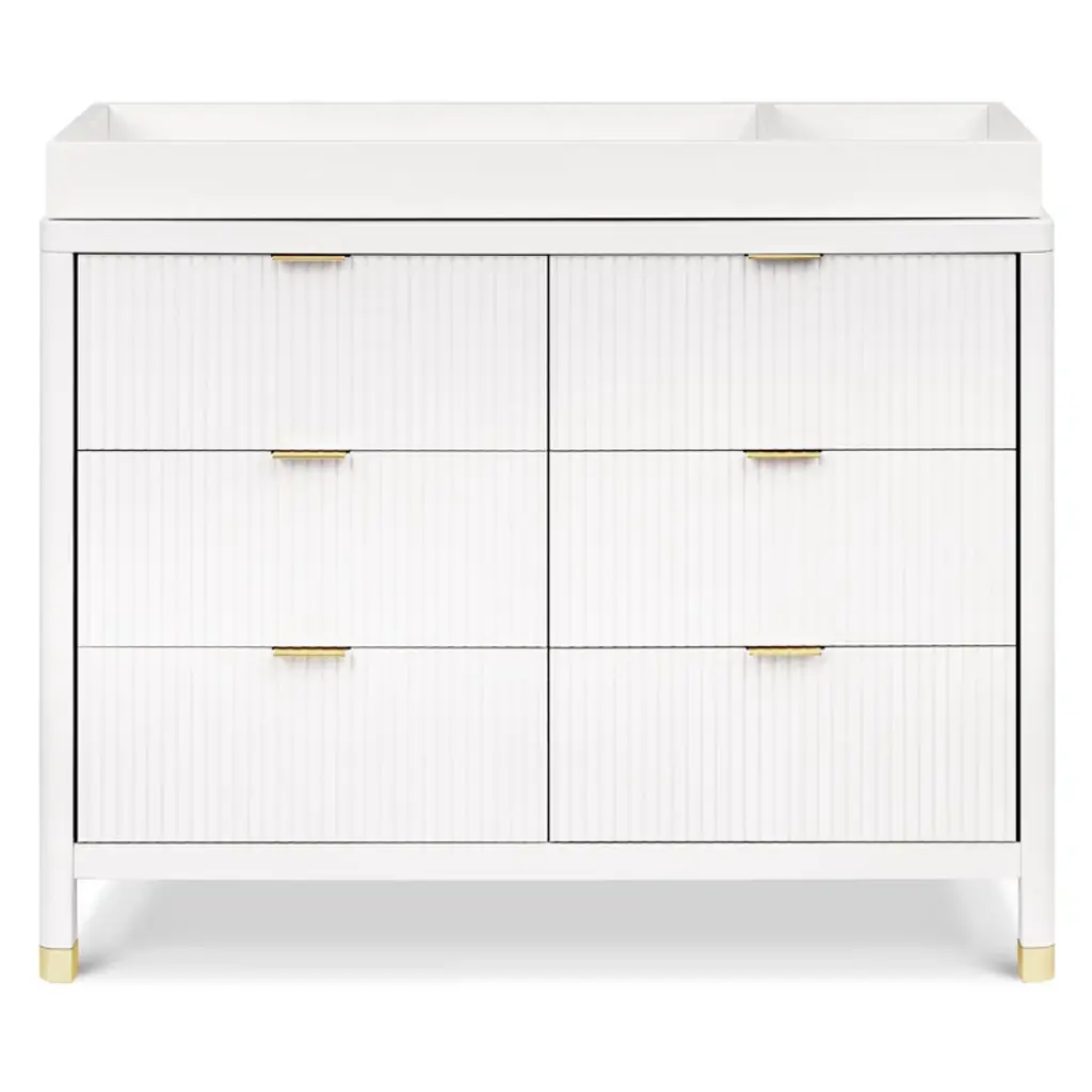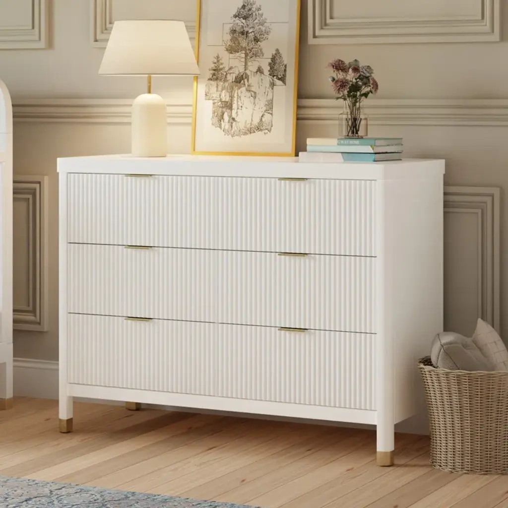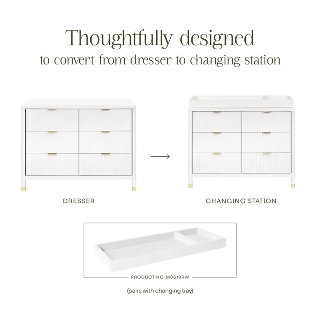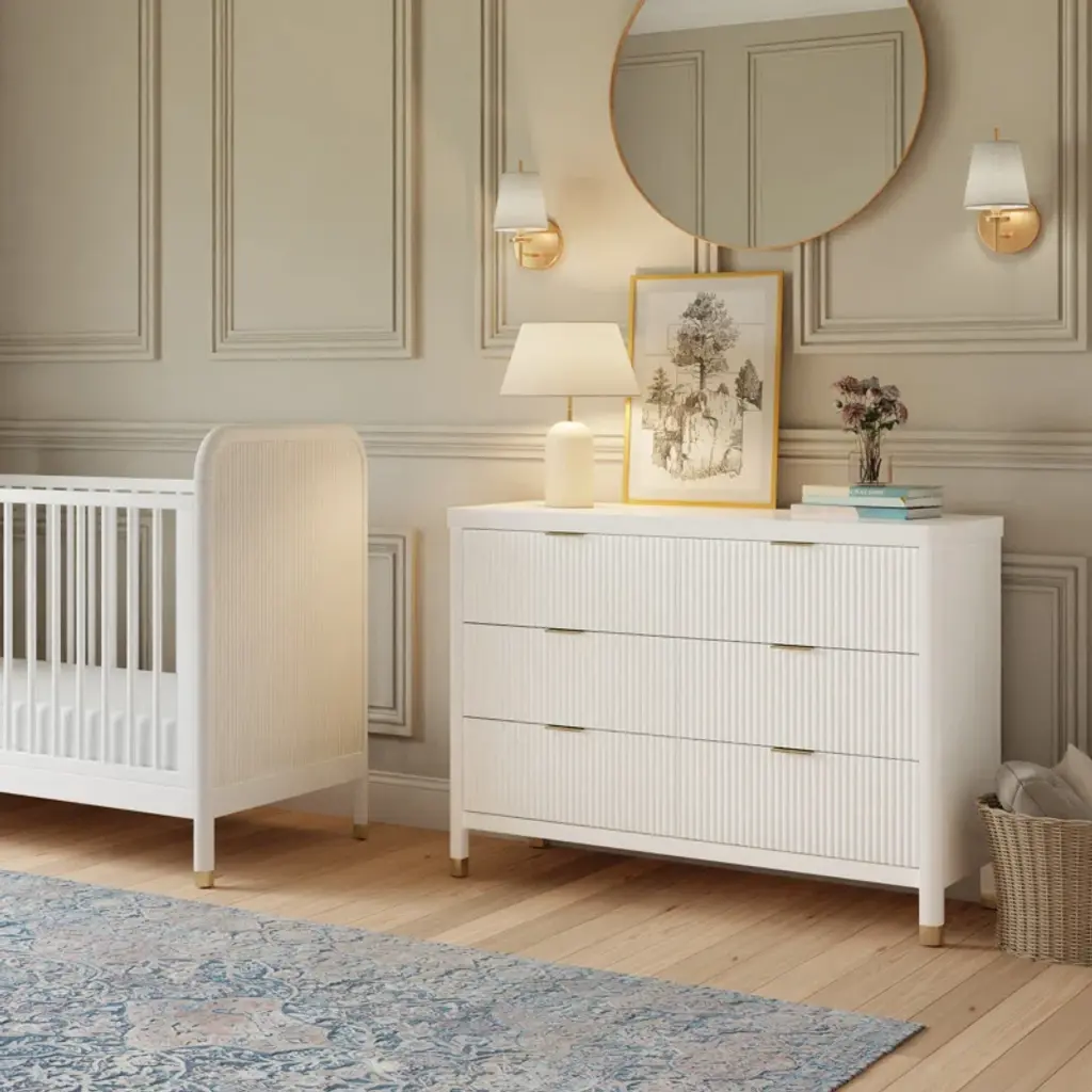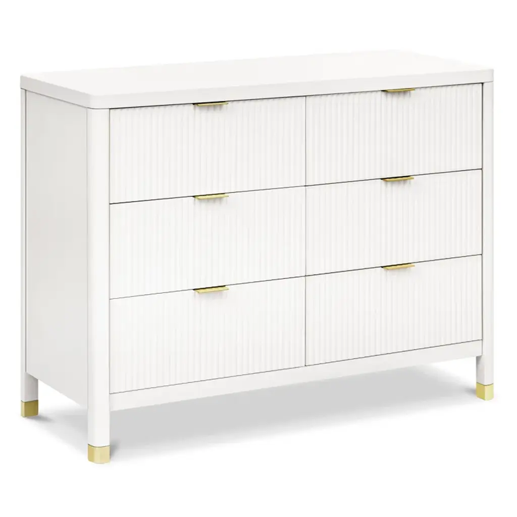 With its textured tambour design, elegant gold feet, and modern drawer pull, the Brimsley Tambour dresser was crafted for those who appreciate the perfect blend of sophistication and functionality. The dresser boasts 6 spacious drawers for clothing, blankets, and more. Transform your space with a statement piece that not only organizes but elevates the style of your room. Its versatility ensures that it will seamlessly transition from a nursery staple to a stylish piece in any room of your home.
