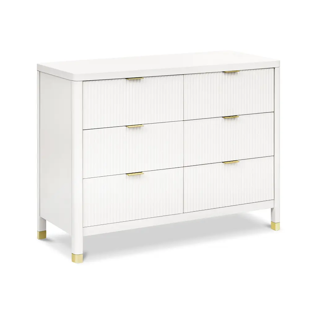 Elevate your space with the Brimsley Tambour 6-Drawer Dresser from Namesake. Crafted with sophistication and functionality in mind, its textured tambour design, elegant gold feet, and modern drawer pulls make a statement. With 6 spacious drawers, it organizes and transforms any room. A versatile piece that will seamlessly transition throughout your home. Highlights