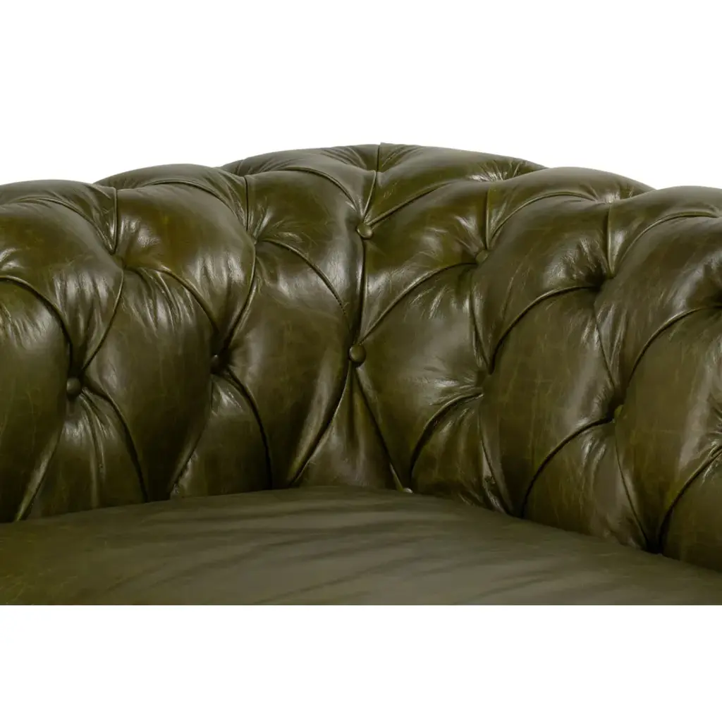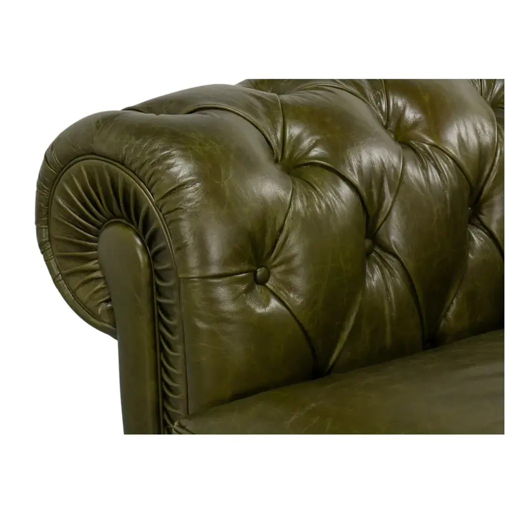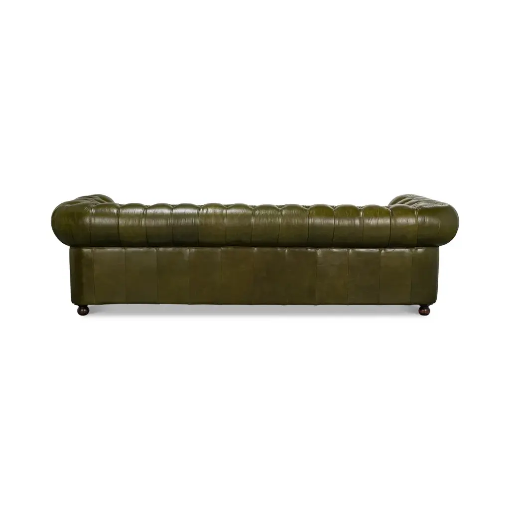 A blend of classic heritage and modern luxury. Crafted from premium top-grain leather, its rich olive green tone infuses warmth and opulence into any space. The iconic rolled arms and pleated armrests highlight meticulous craftsmanship, while the button-tufted upholstery brings timeless grandeur to the design. This Chesterfield is more than a statement piece—its plush cushioning and elegant design ensure both comfort and style. Perfect as the centerpiece of an elegant living room. Dimensions: 103" W x 39" D x 29" H
