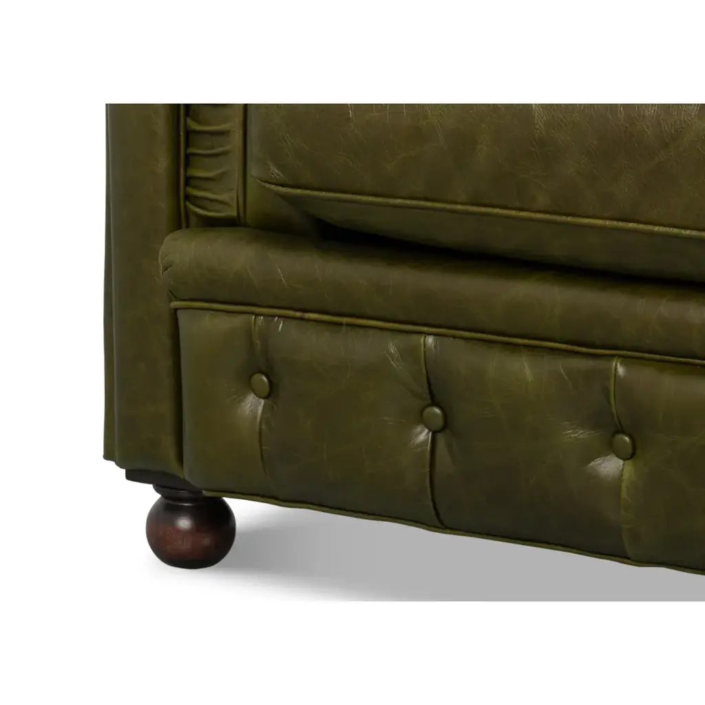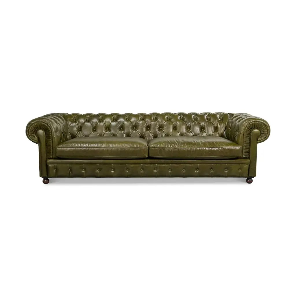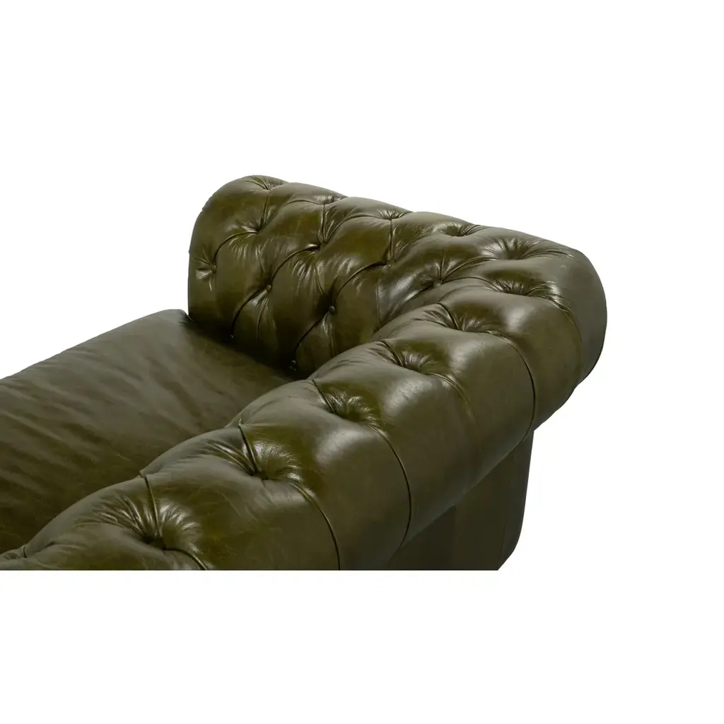 A blend of classic heritage and modern luxury. Crafted from premium top-grain leather, its rich olive green tone infuses warmth and opulence into any space. The iconic rolled arms and pleated armrests highlight meticulous craftsmanship, while the button-tufted upholstery brings timeless grandeur to the design. This Chesterfield is more than a statement piece—its plush cushioning and elegant design ensure both comfort and style. Perfect as the centerpiece of an elegant living room. Dimensions: 103" W x 39" D x 29" H