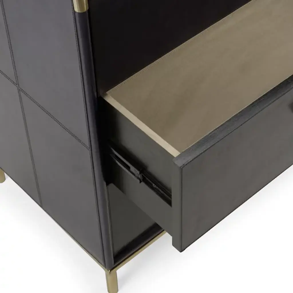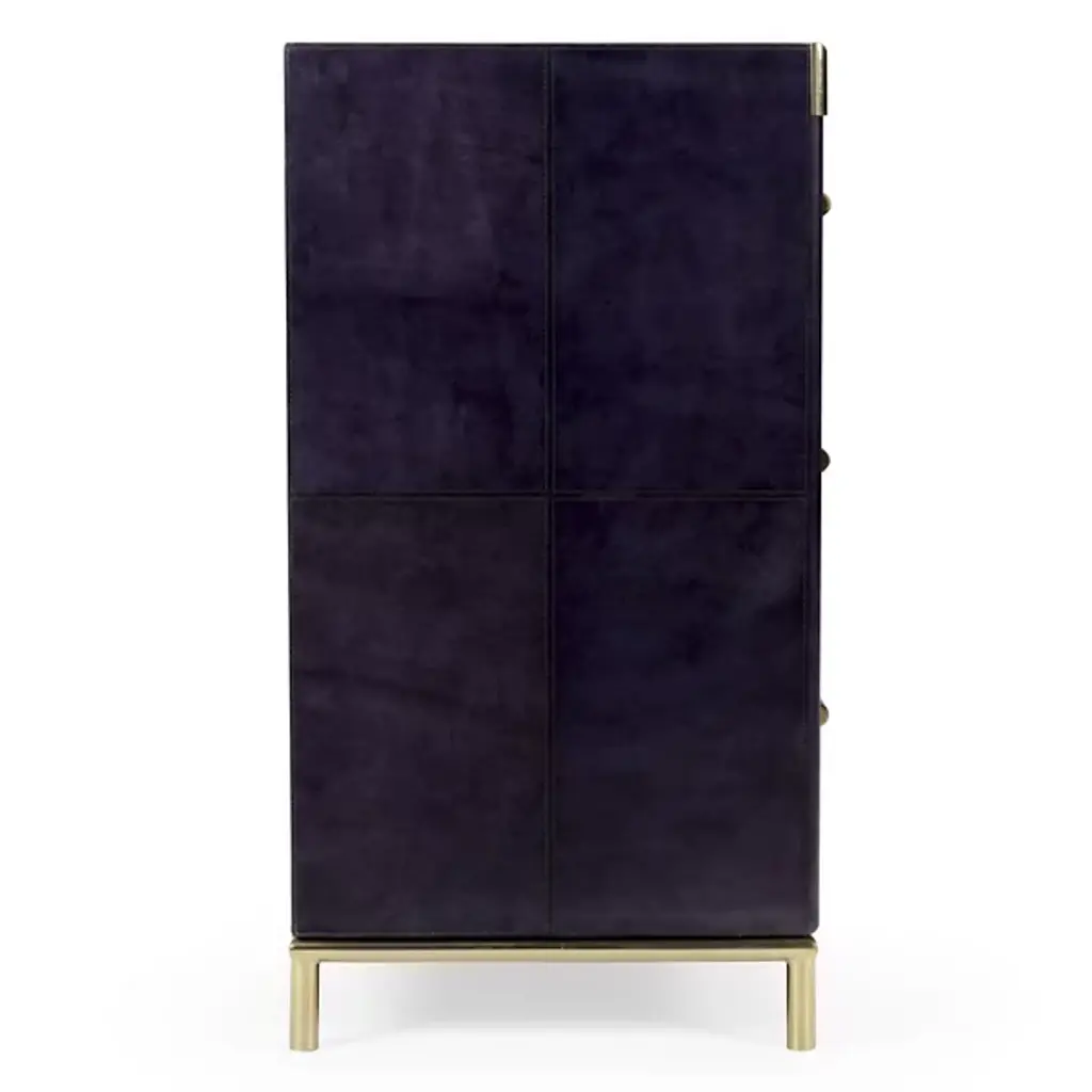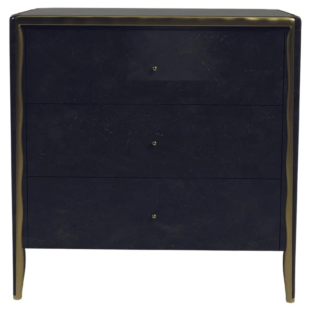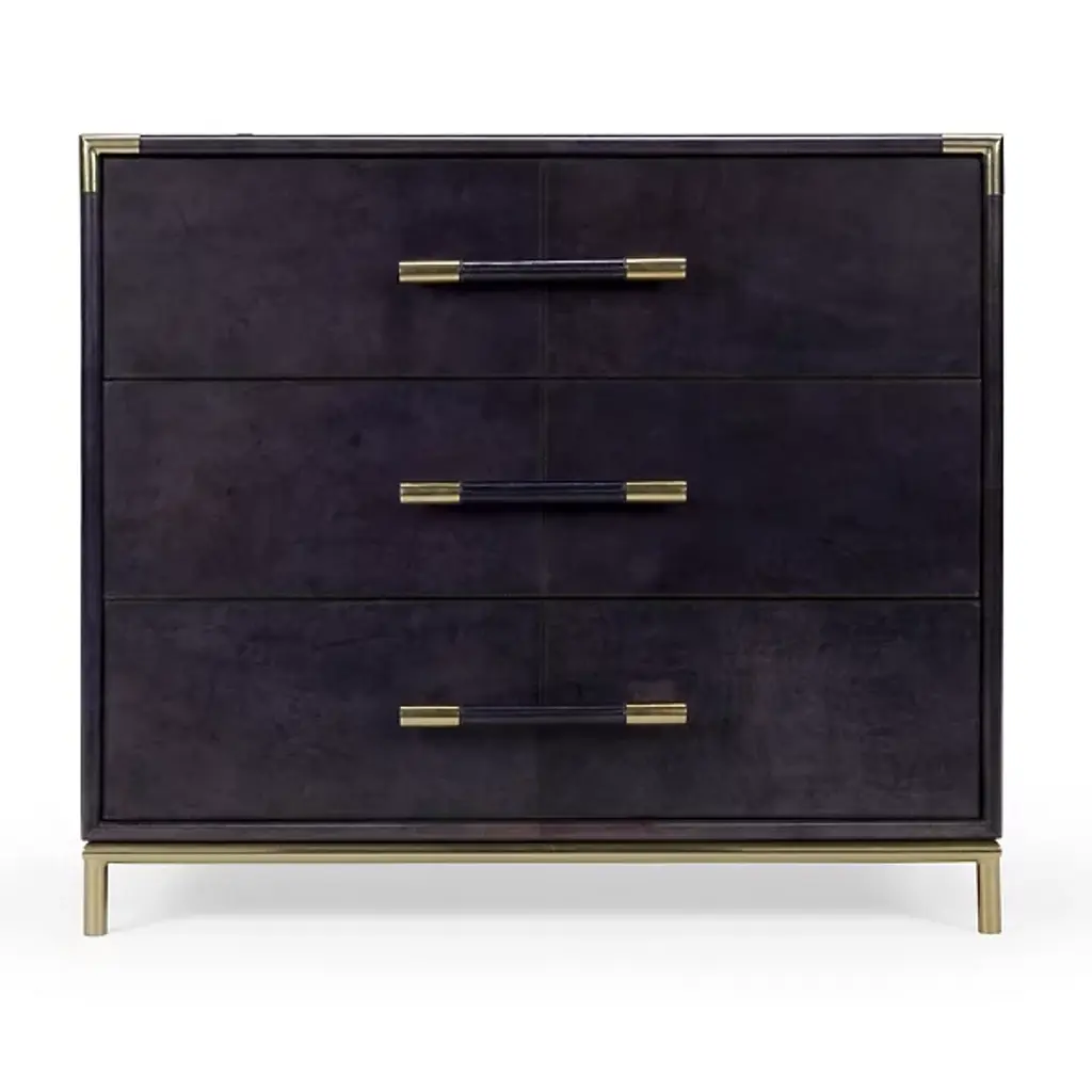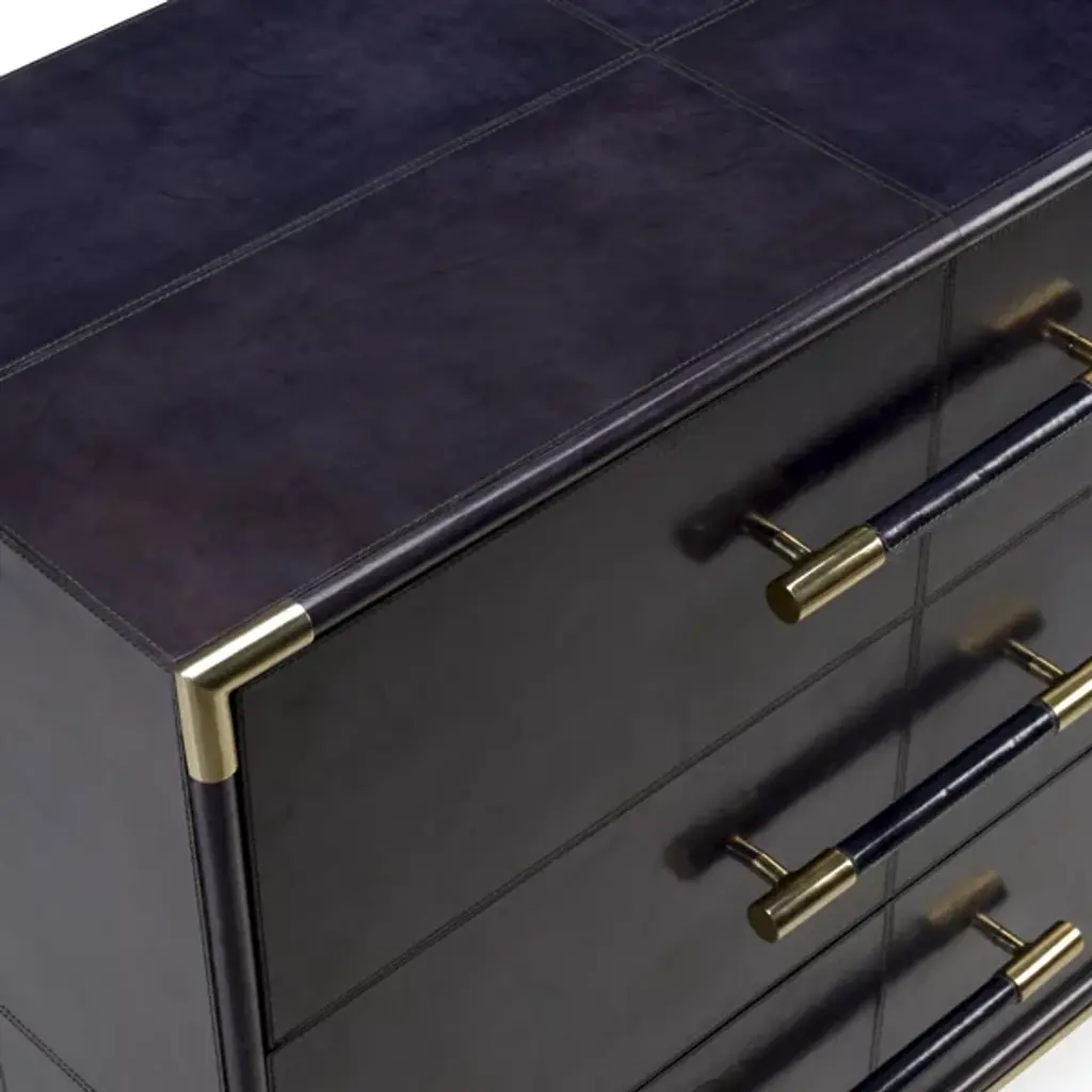 The Bruce Chest from Wildwood wraps its three-drawer frame in deep midnight leather that shifts between navy and purple tones depending on lighting conditions. This rich upholstery treatment transforms traditional case goods into something more luxurious and tactile, while brass corner details and leg caps provide metallic punctuation against the dark leather surface. Each drawer glides smoothly on quality hardware, with brass bar pulls that echo the corner accents. Designed for decorative storage rather than clothing, this piece brings hotel-like sophistication through its material choices and jewel-toned palette.