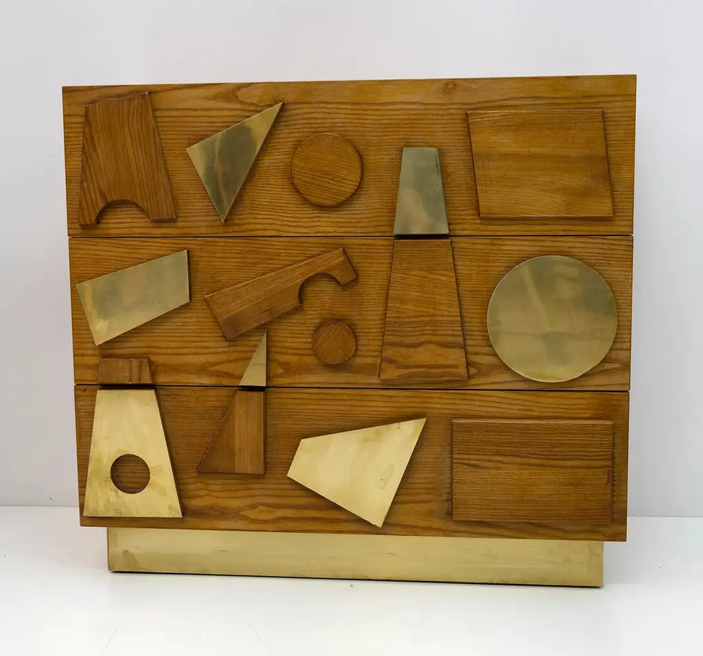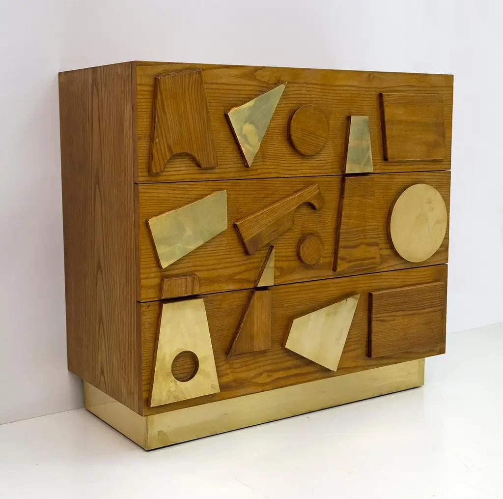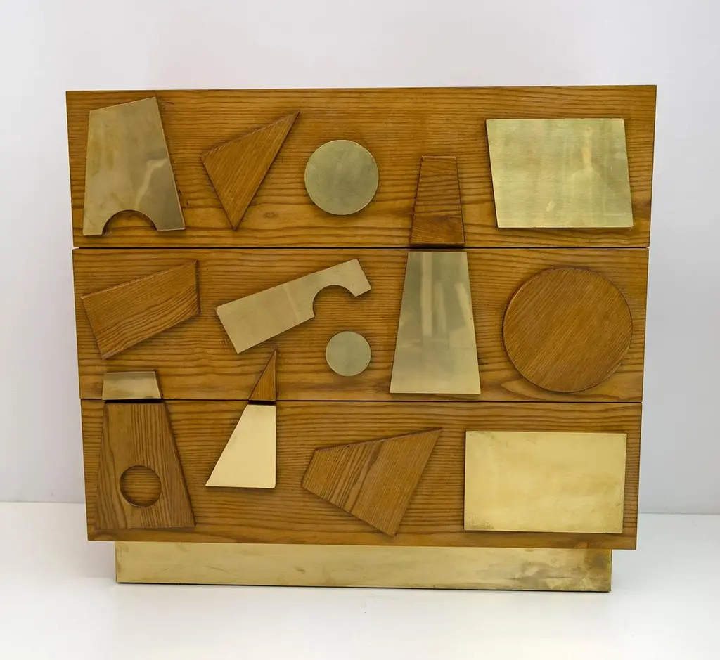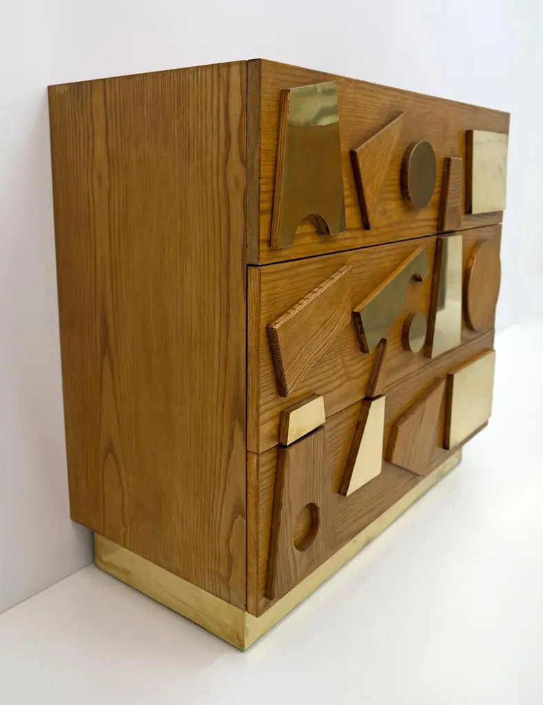 Brutalist-style chest of drawers in ash wood and brass. With its harmonious, geometric lines, the piece is further enhanced by the brass band underneath.The price is for a single chest of drawers.