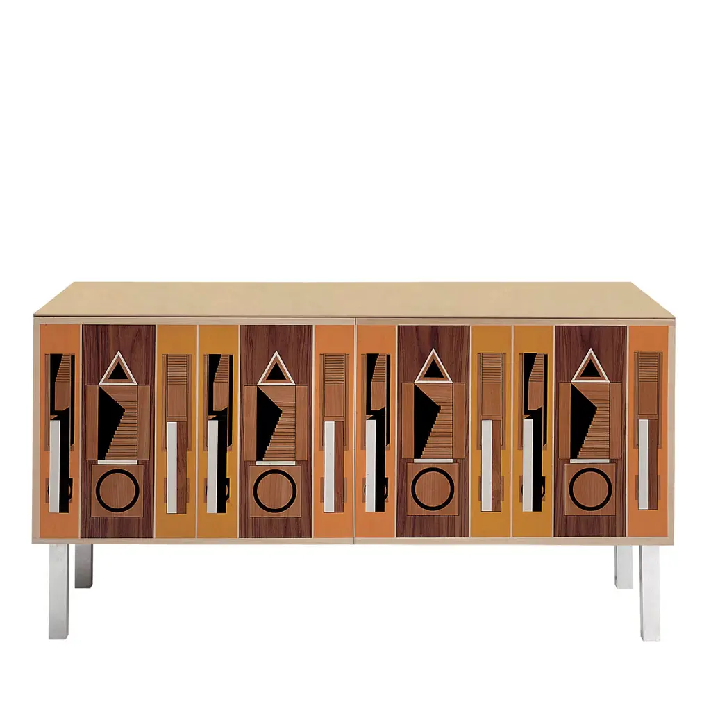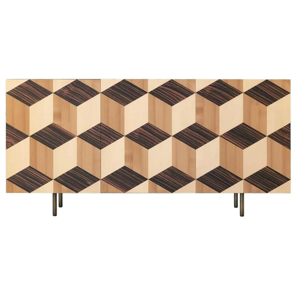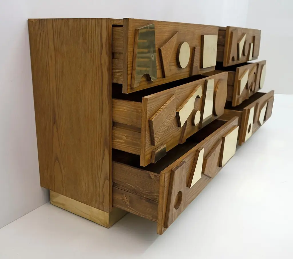 Brutalist-style chest of drawers in ash wood and brass. With its harmonious, geometric lines, the piece is further enhanced by the brass band underneath.The price is for a single chest of drawers.