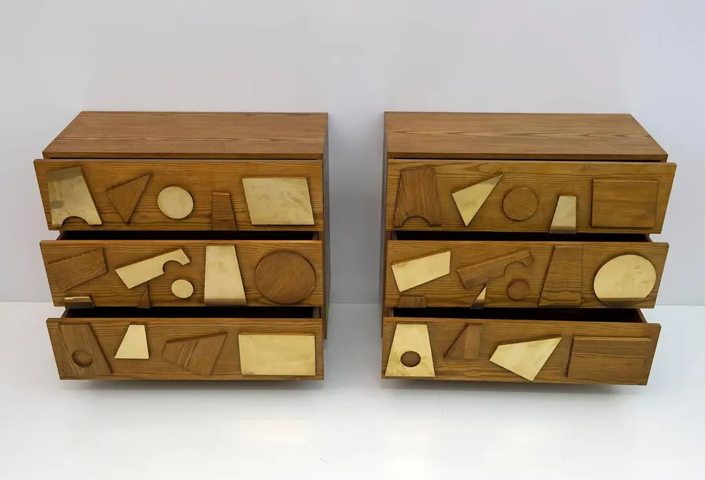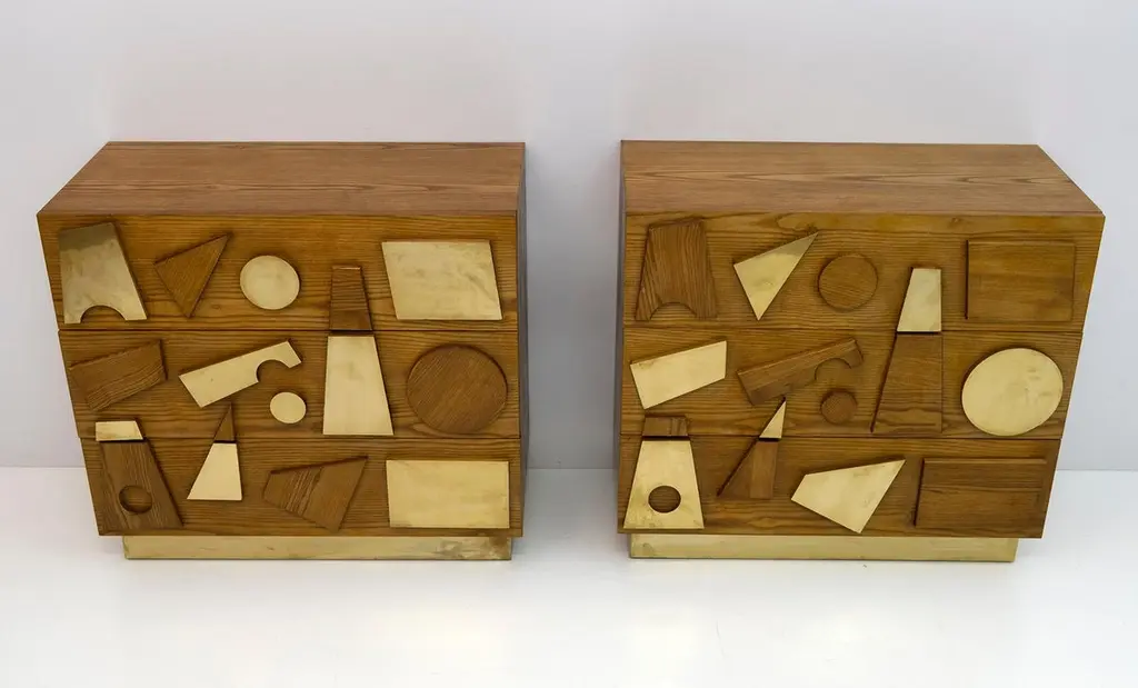Brutalist Italian Ash Tree And Brass Chests Of Drawers, Two