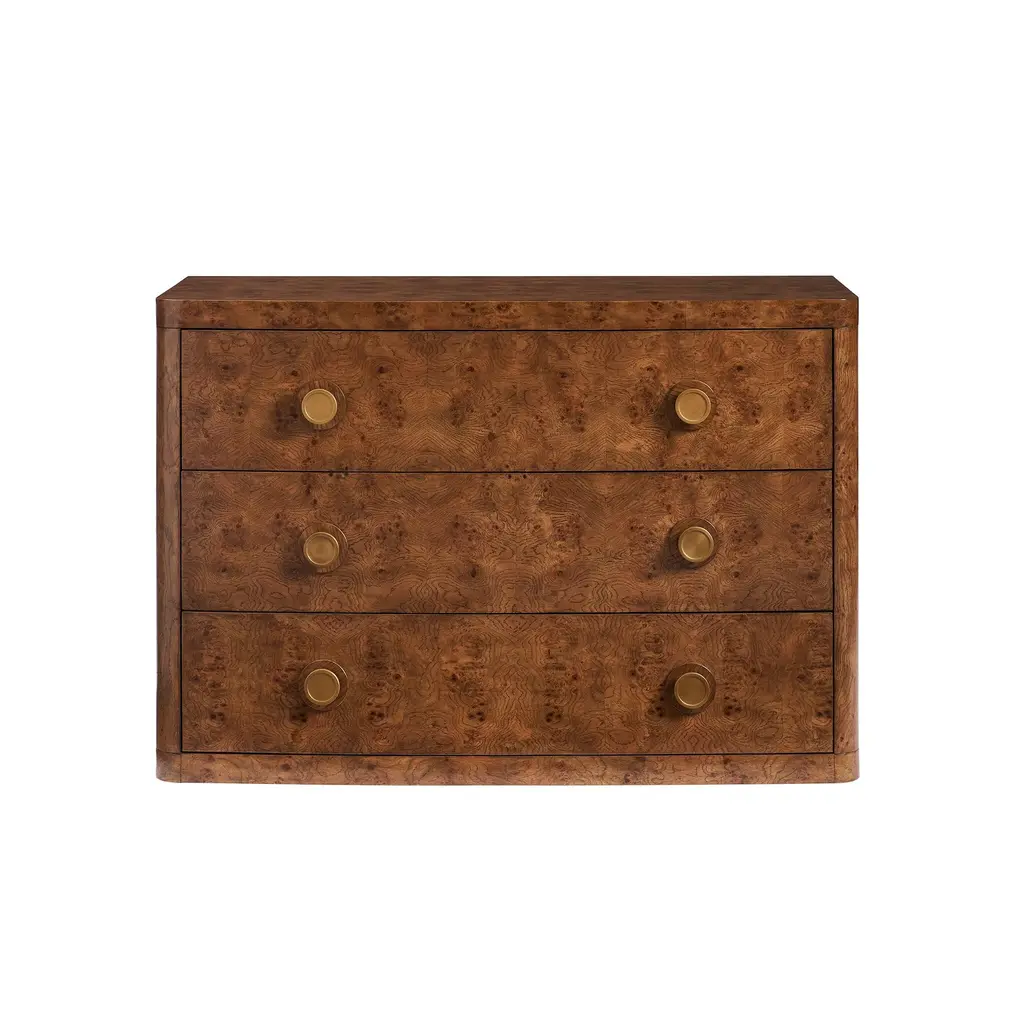 A contemporary design for a timeless burl wood appearance, the Brynn Chest features curved edges and round brass drawer pulls. This piece is versatile enough for living spaces, bedrooms, and even foyers and hallways. Ships In 4-5 Weeks Three drawers Contemporary brass hardware Stunning oak burl wood veneer This image is for illustrative purposes only. The colors shown are accurate within the constraints of lighting, photography, and the color accuracy of your screen.